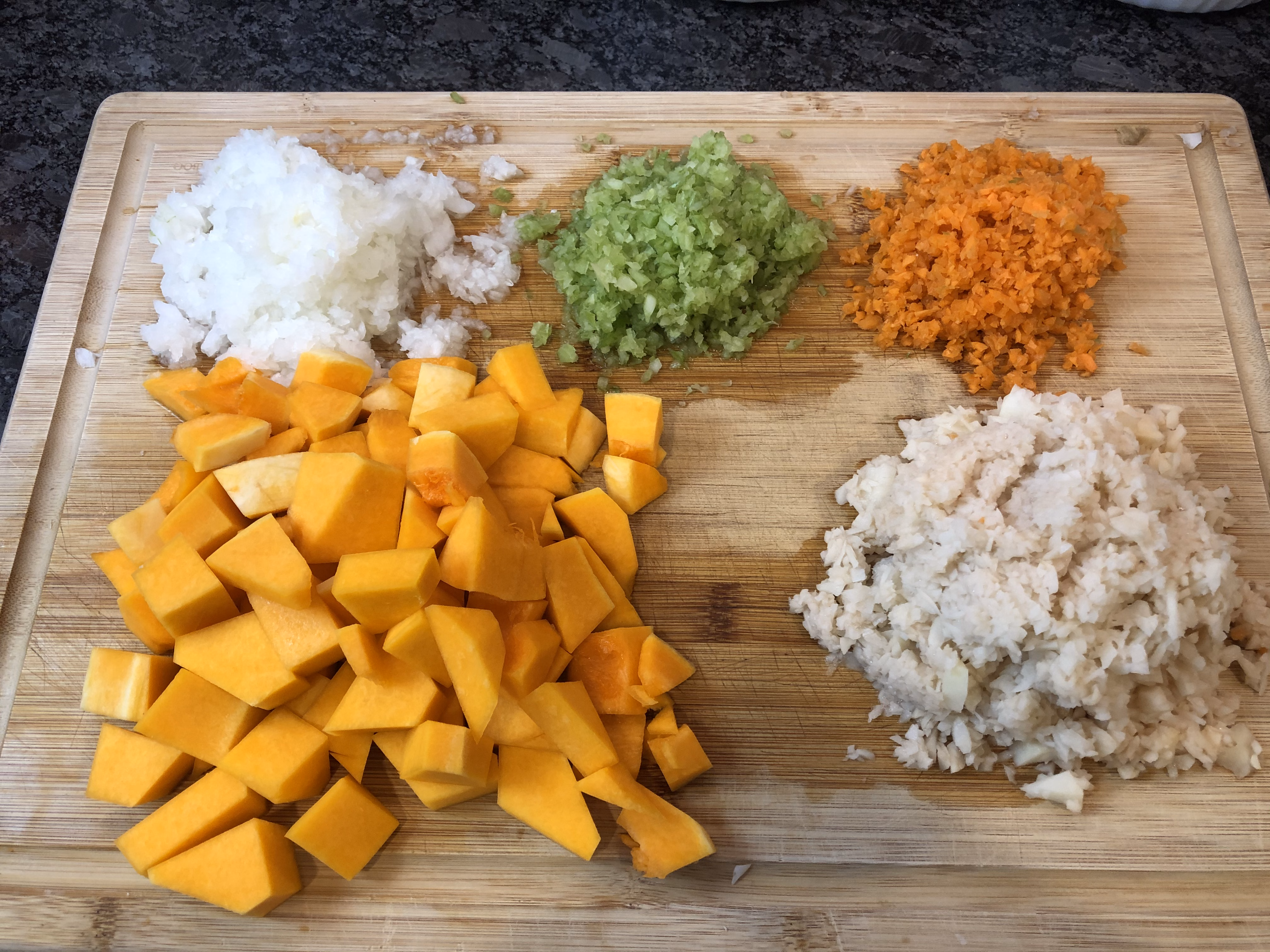 First, prepare your vegetables. I love to use my chopper for the onion, 2 celery stalks, about 1-2 carrots, and 1 large or 2 medium potatoes. Peel and chop the butternut squash.