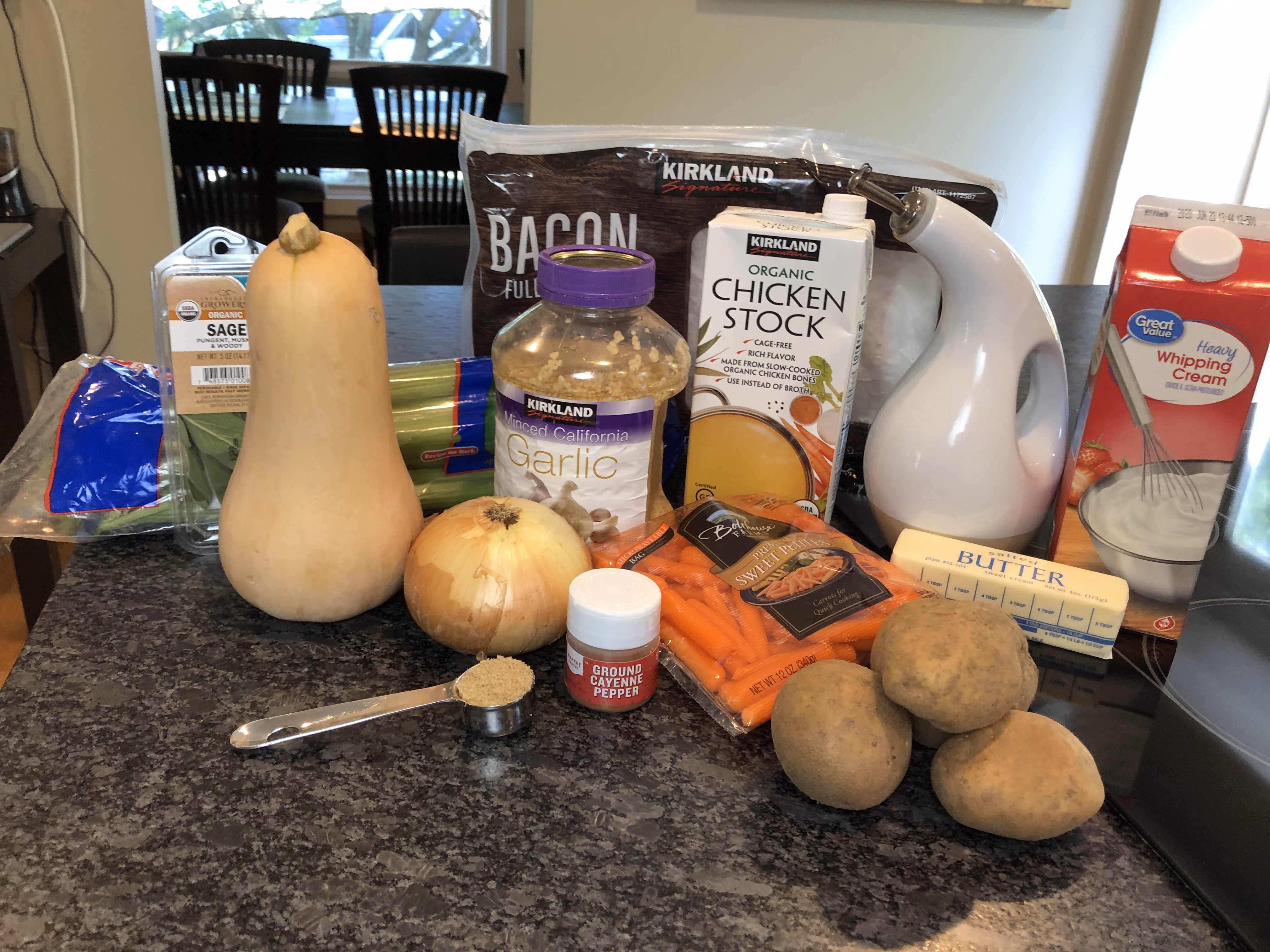 Gather your ingredients. You will need lots of vegetables! A butternut squash, an onion, celery, garlic, carrots, and potatoes. You will also need chicken broth, brown sugar, cayenne pepper (if desired), butter, olive oil, dried sage, fresh sage, bacon, and heavy cream. Phew! It's a long list, but so worth it!