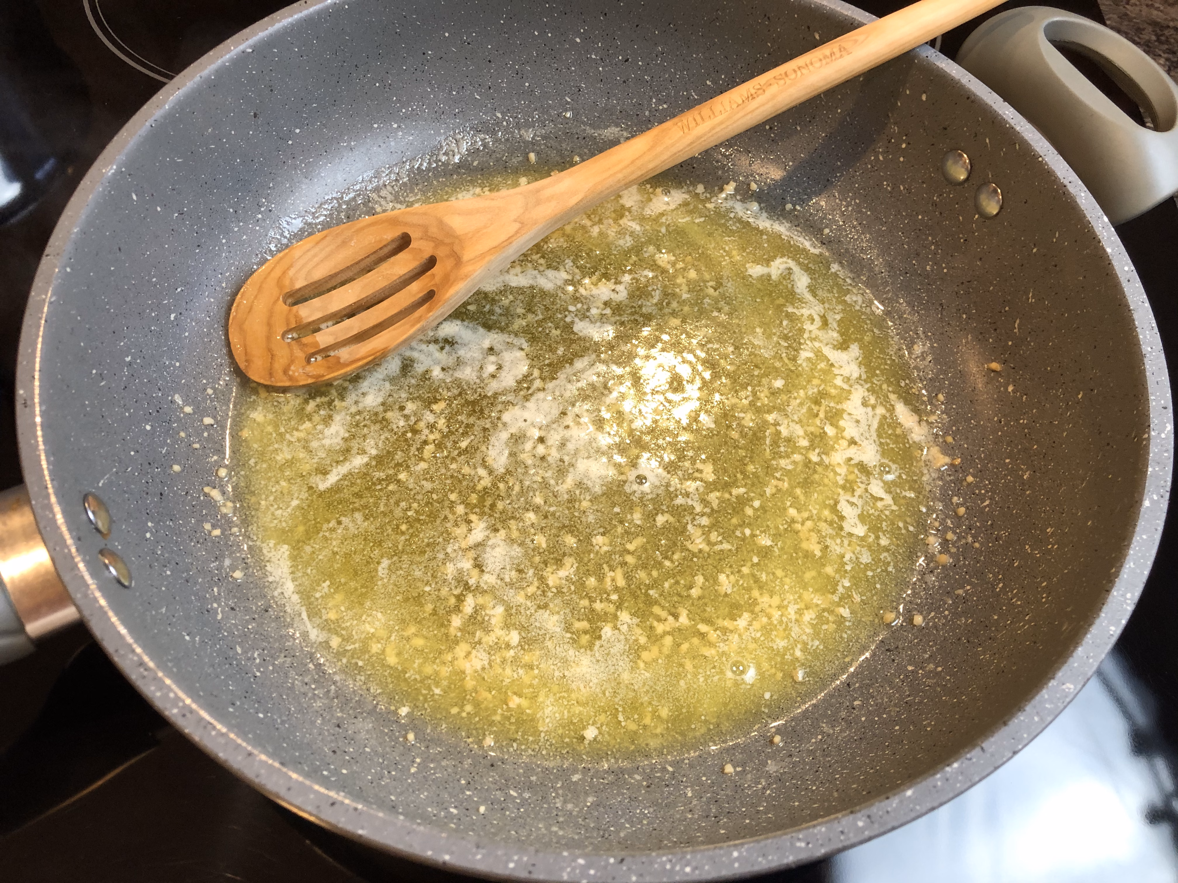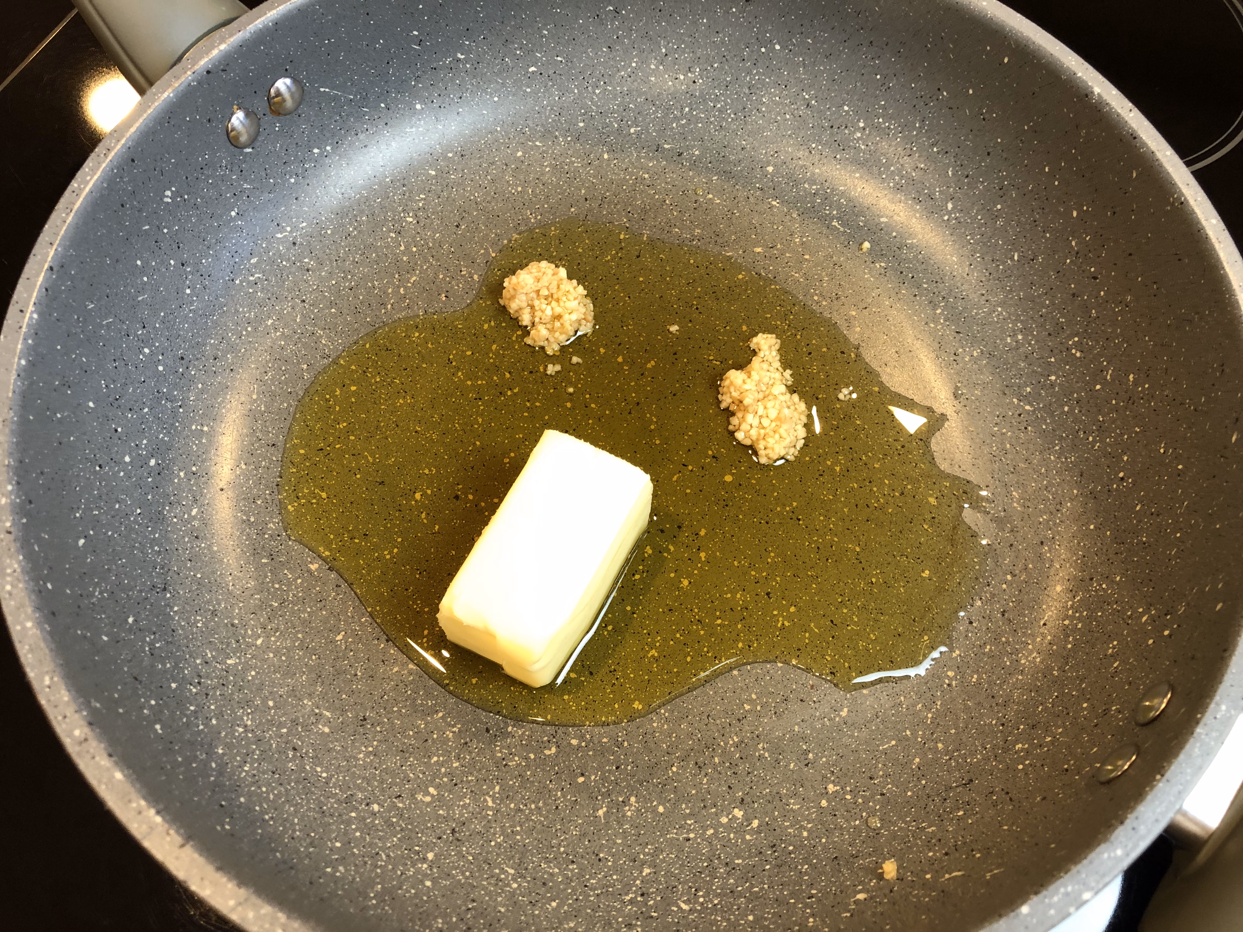 In a large skillet on medium-low heat, add the 4 tablespoons butter and 4 tablespoons olive oil. Add 2 teaspoons minced garlic and cook until fragrant and butter is melted.