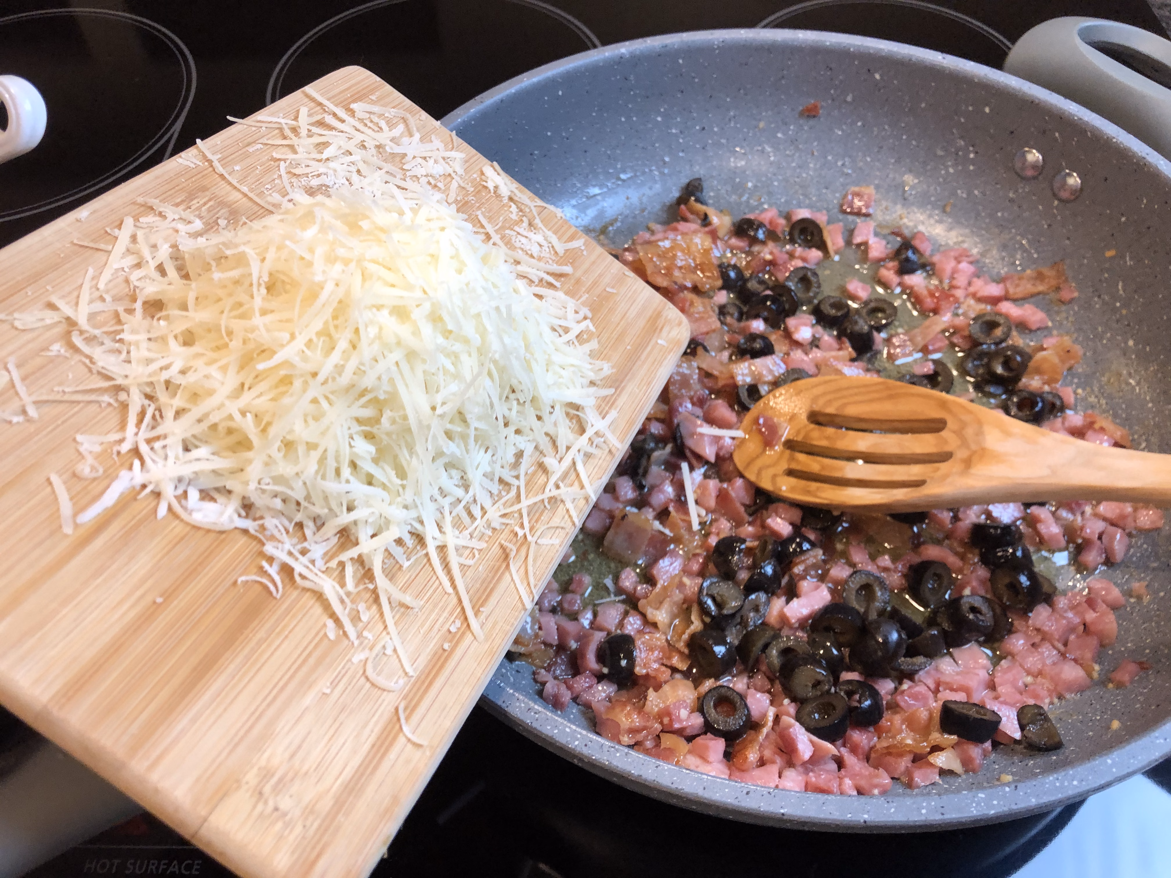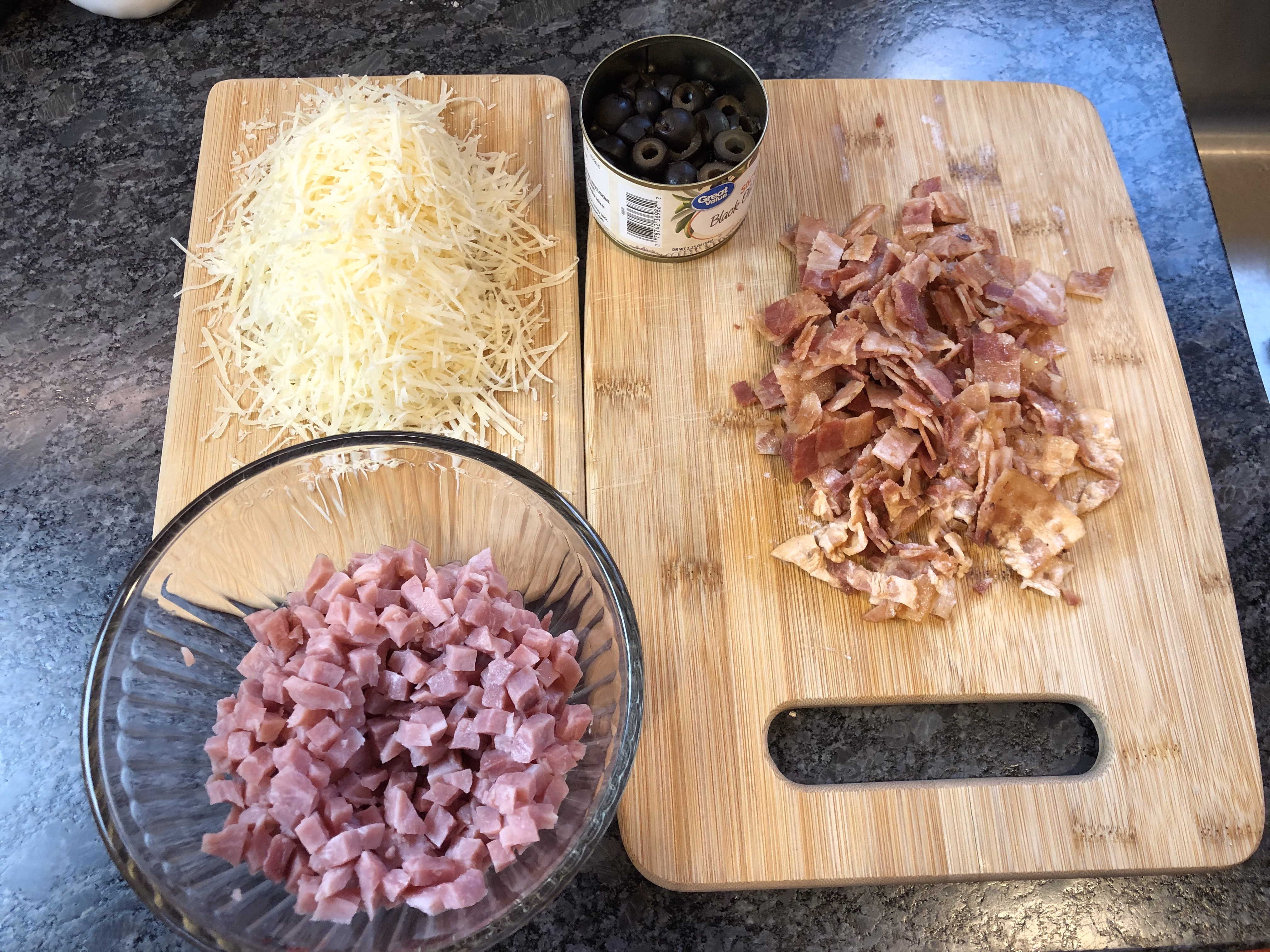 Gather your ingredients. You'll need GF Penne pasta, butter, olive oil, garlic, cubed ham, bacon, salt, sliced olives, and Parmesan cheese.