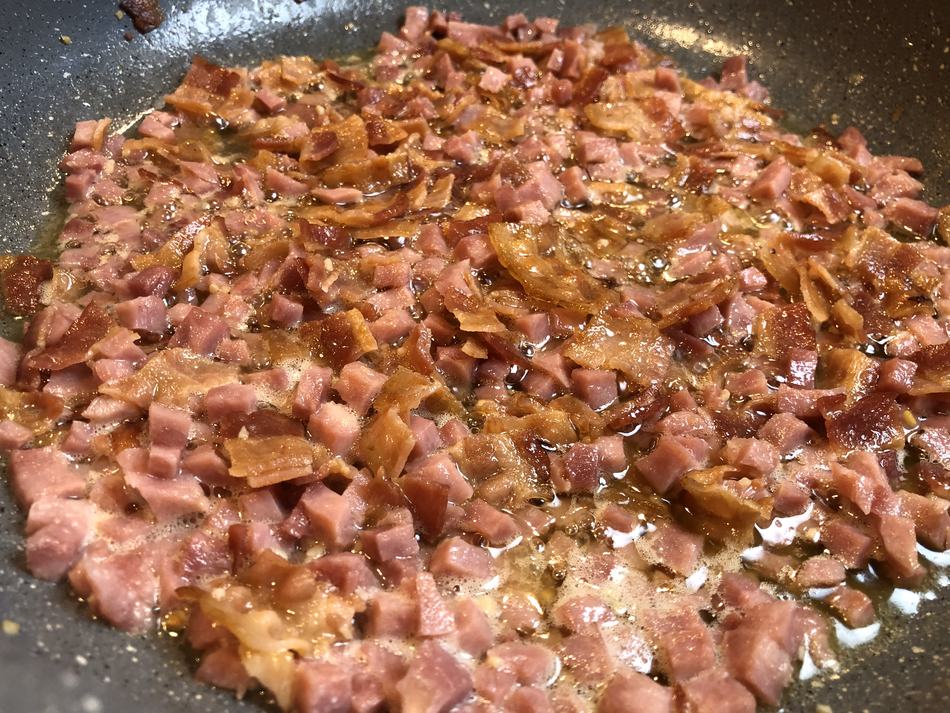 Add 2 cups cubed ham, 8 slices cooked bacon, and 3/4 teaspoon salt to skillet. Allow to cook until fully heated and bacon is sizzling.