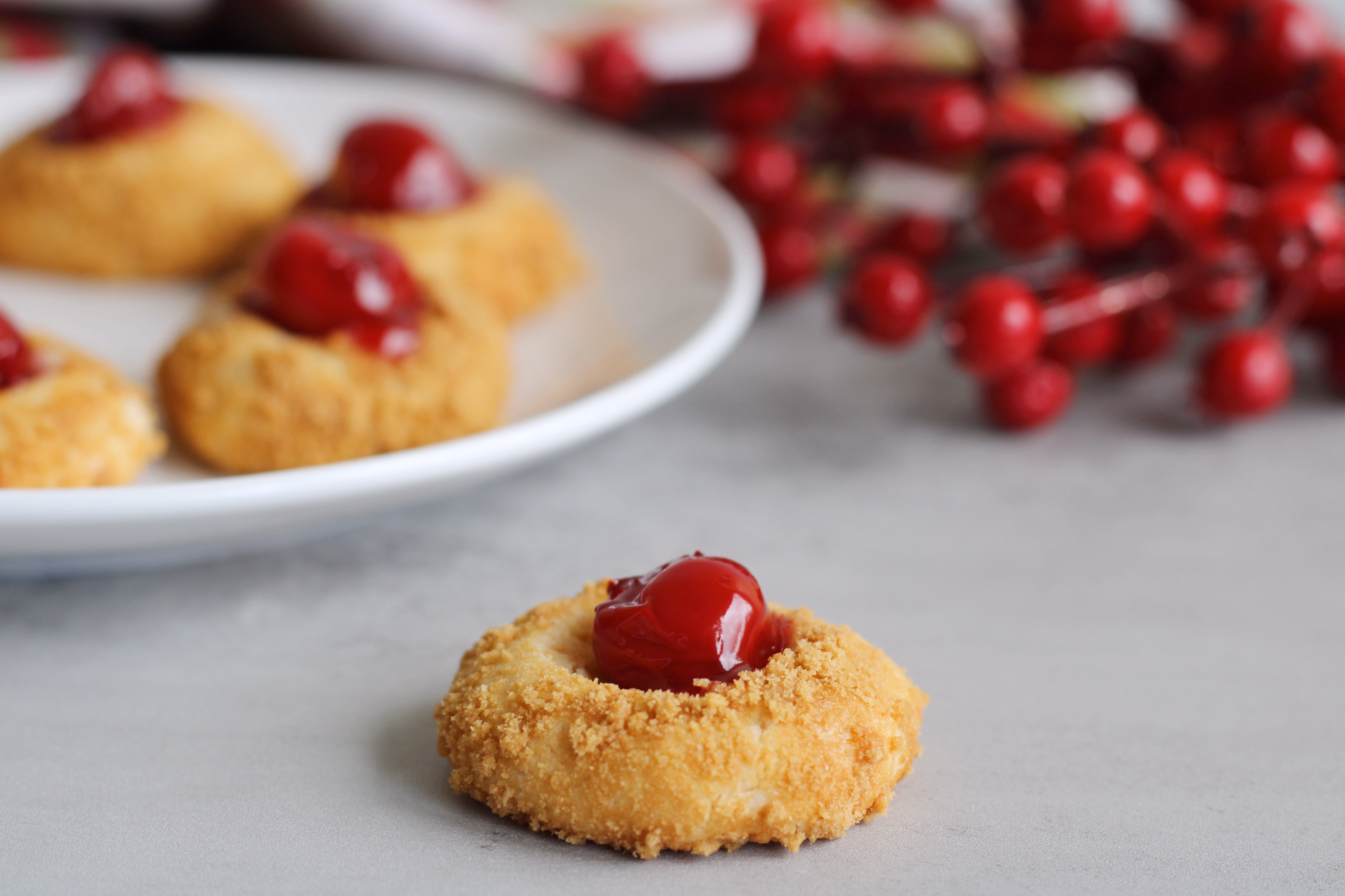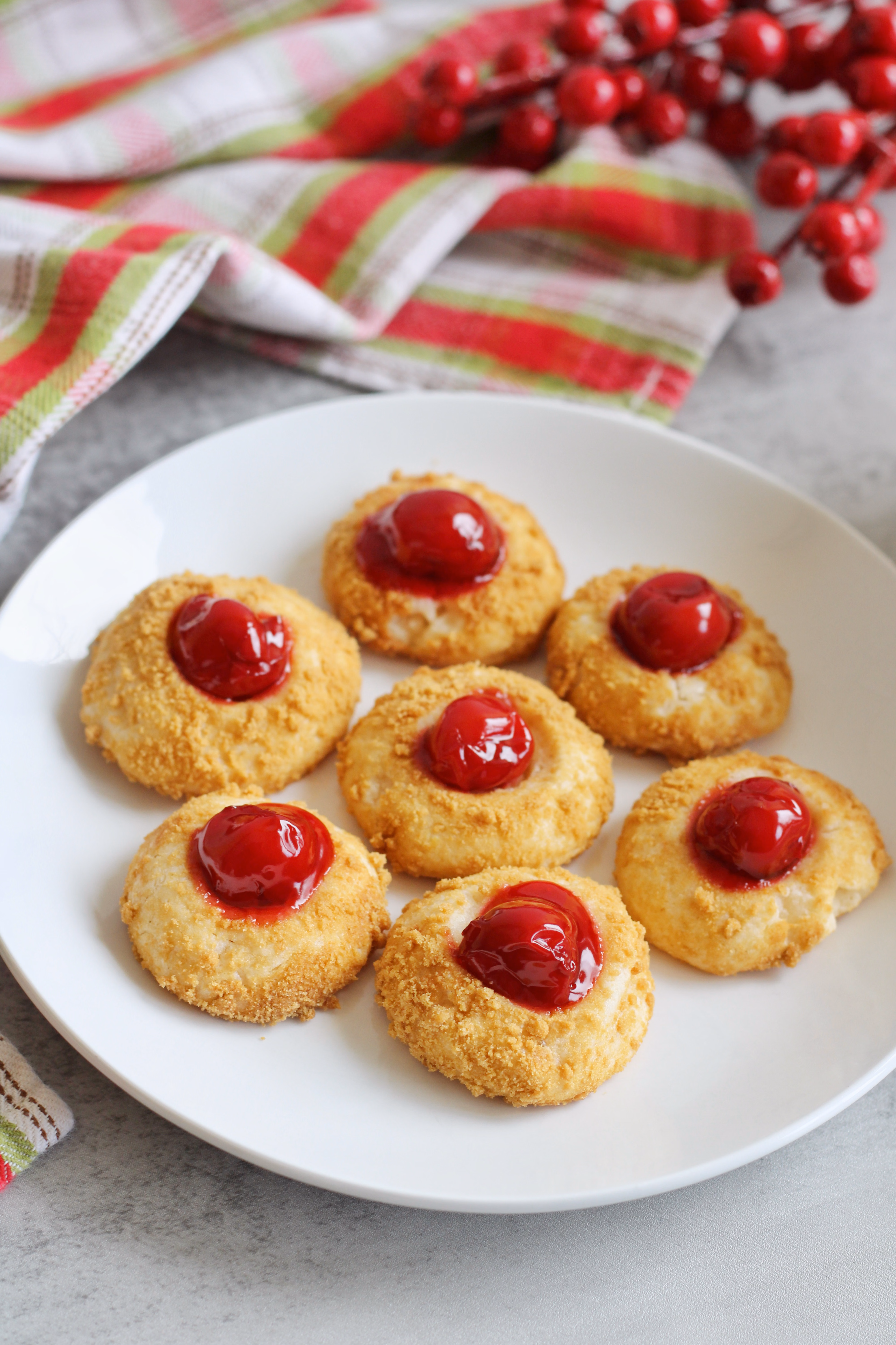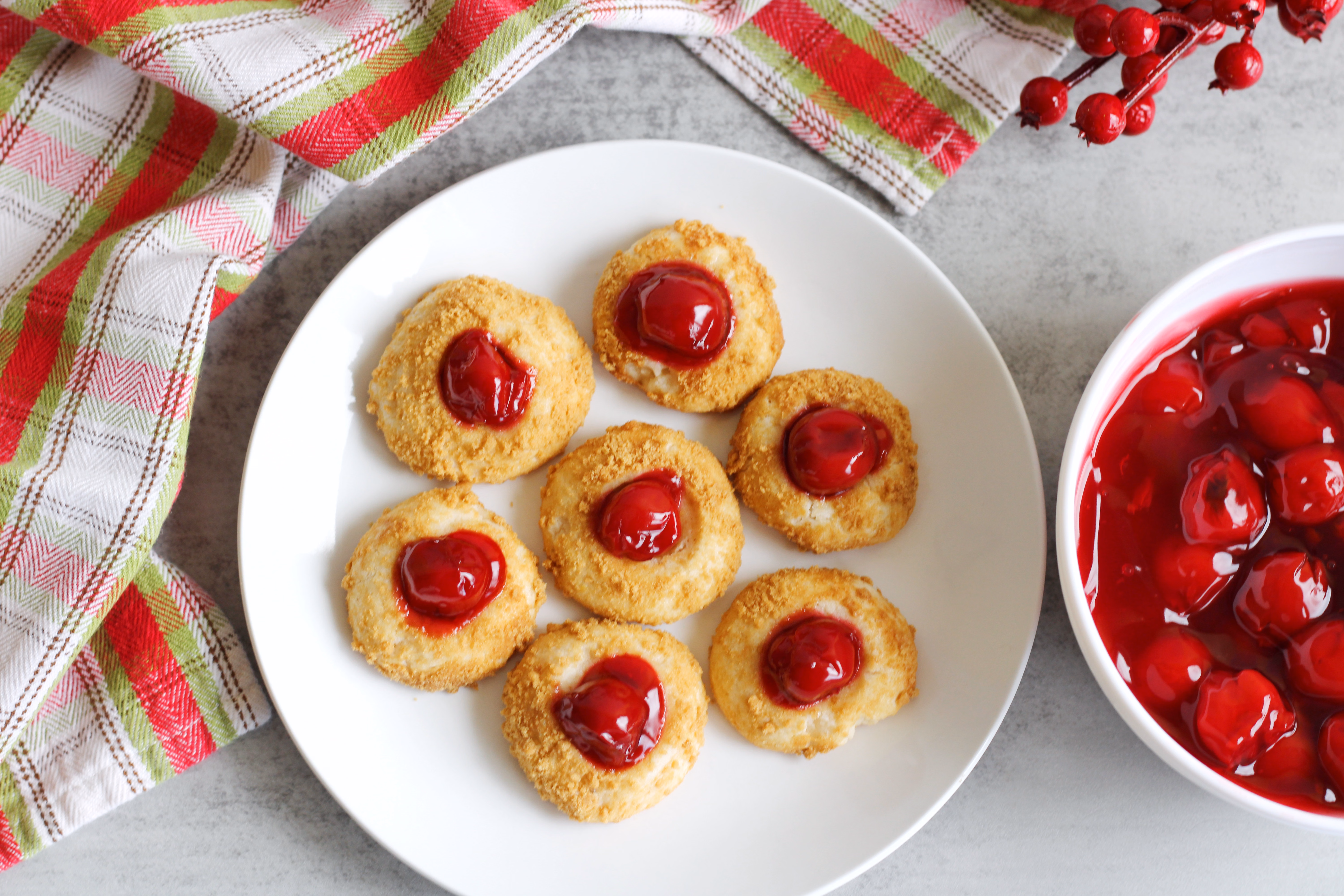 My all time favorite dessert in cookie form, right here! These are such a fun cookie to make anytime of year, but I think they are especially pretty at Christmas. The soft cookie has cream cheese in the dough, then you roll the dough balls in graham cracker crumbs, bake, and top with some cherry pie filling. Easy, but so loved!