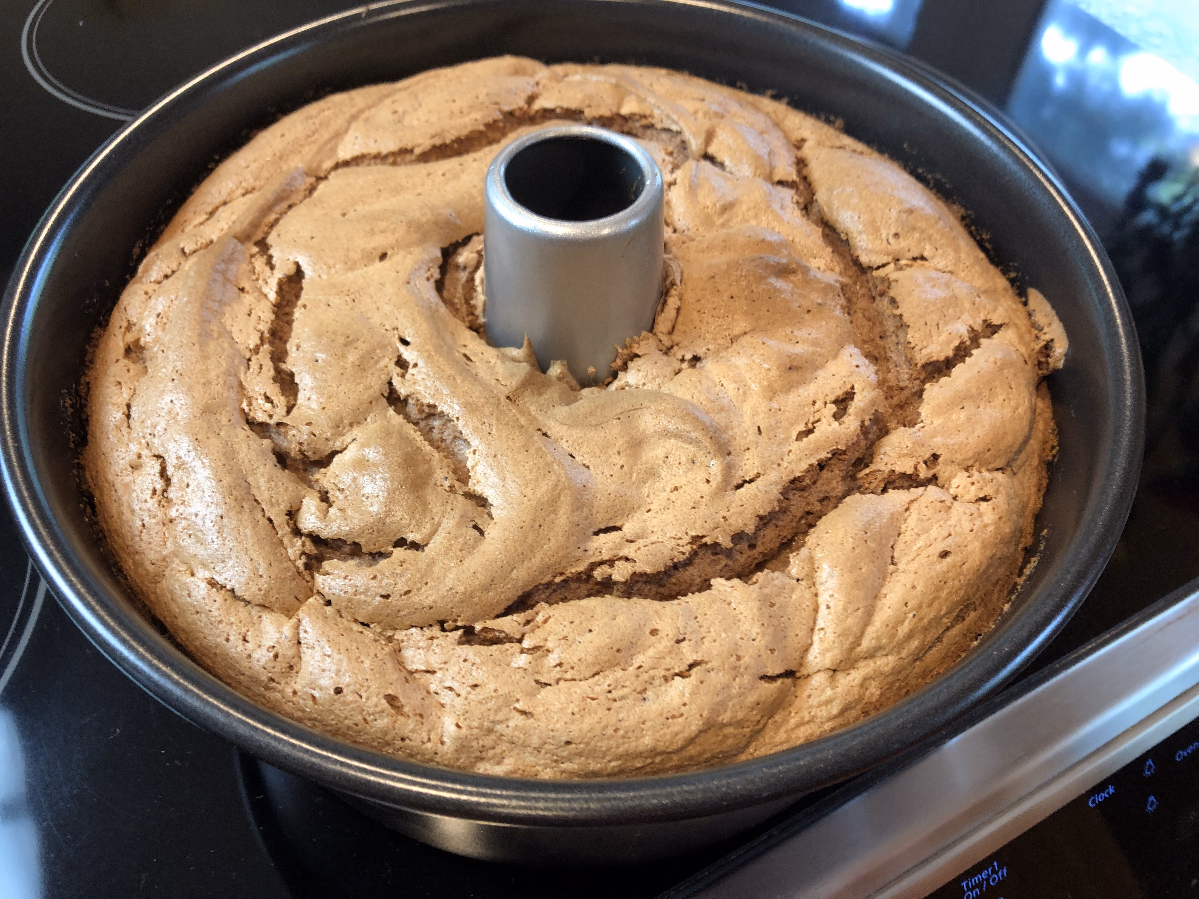 The top will be dry and cracked, and the cake will bounce back when you touch the top. Immediately invert the pan onto a can and allow the cake to cool completely.