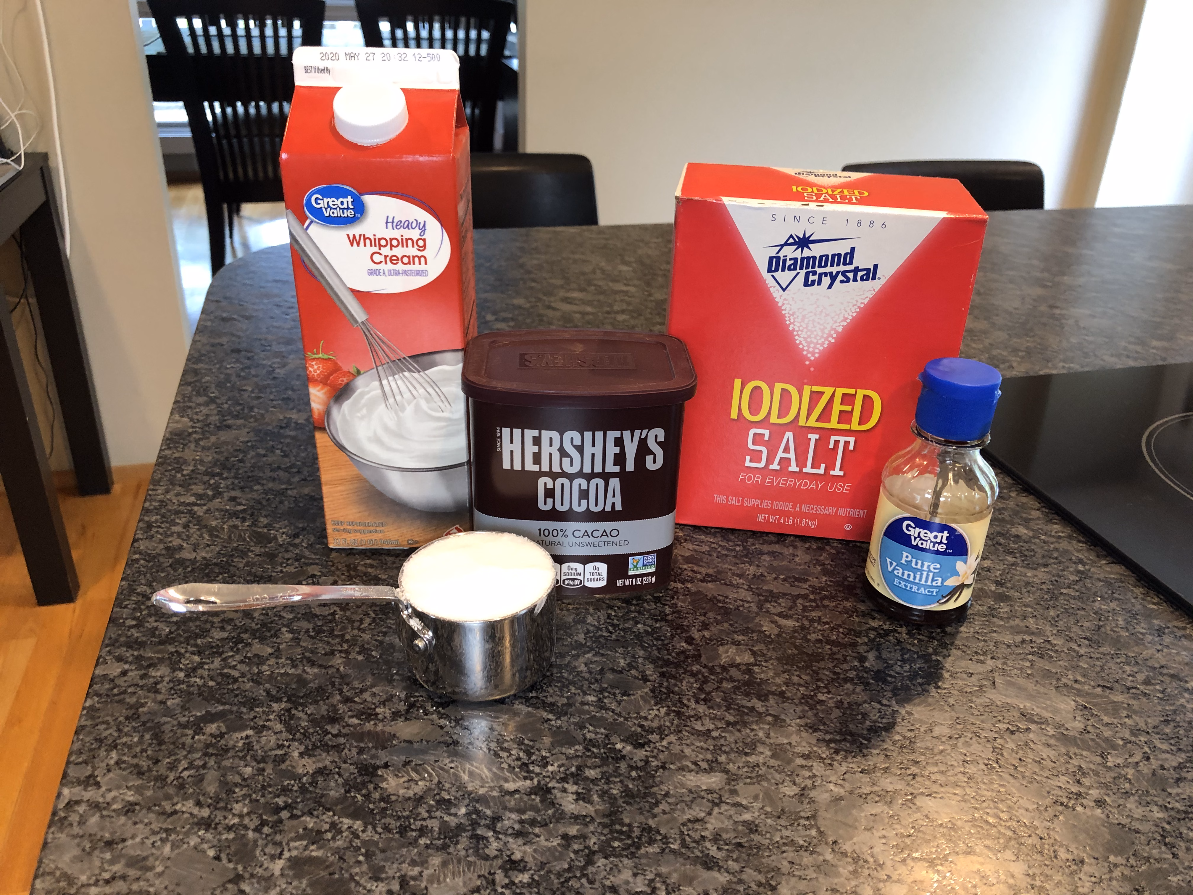 While the cake is baking, gather your cream topping ingredients. You'll need heavy whipping cream, sugar, cocoa powder, salt, and vanilla.