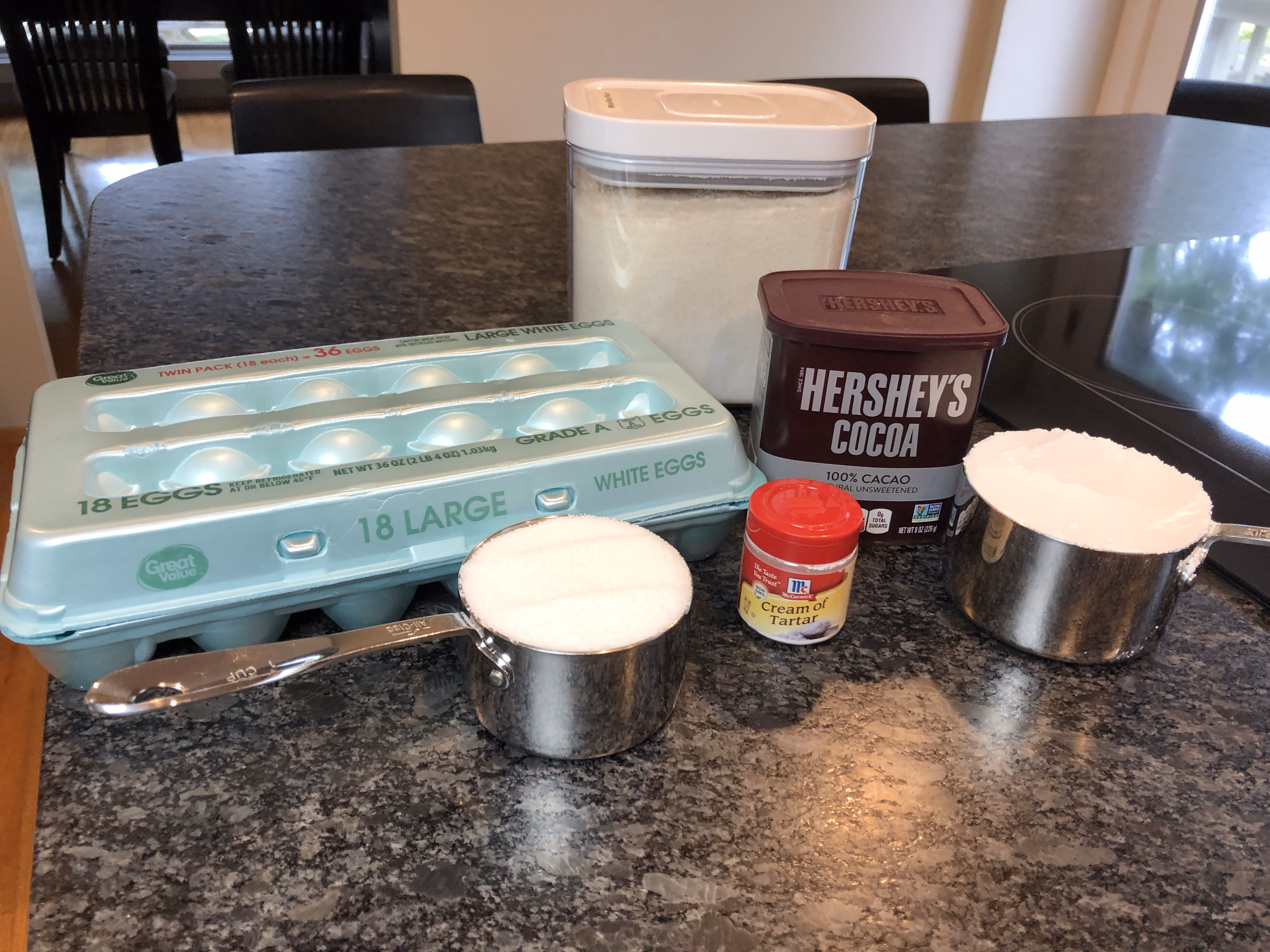 Gather your ingredients. For the cake you will need 1 1/2 cups powdered sugar, fine ground white rice flour (be sure to NOT use a cup-for-cup flour mix. Xanthum gum will not work in this cake), baking cocoa powder, cream of tartar, and about 10 eggs.
