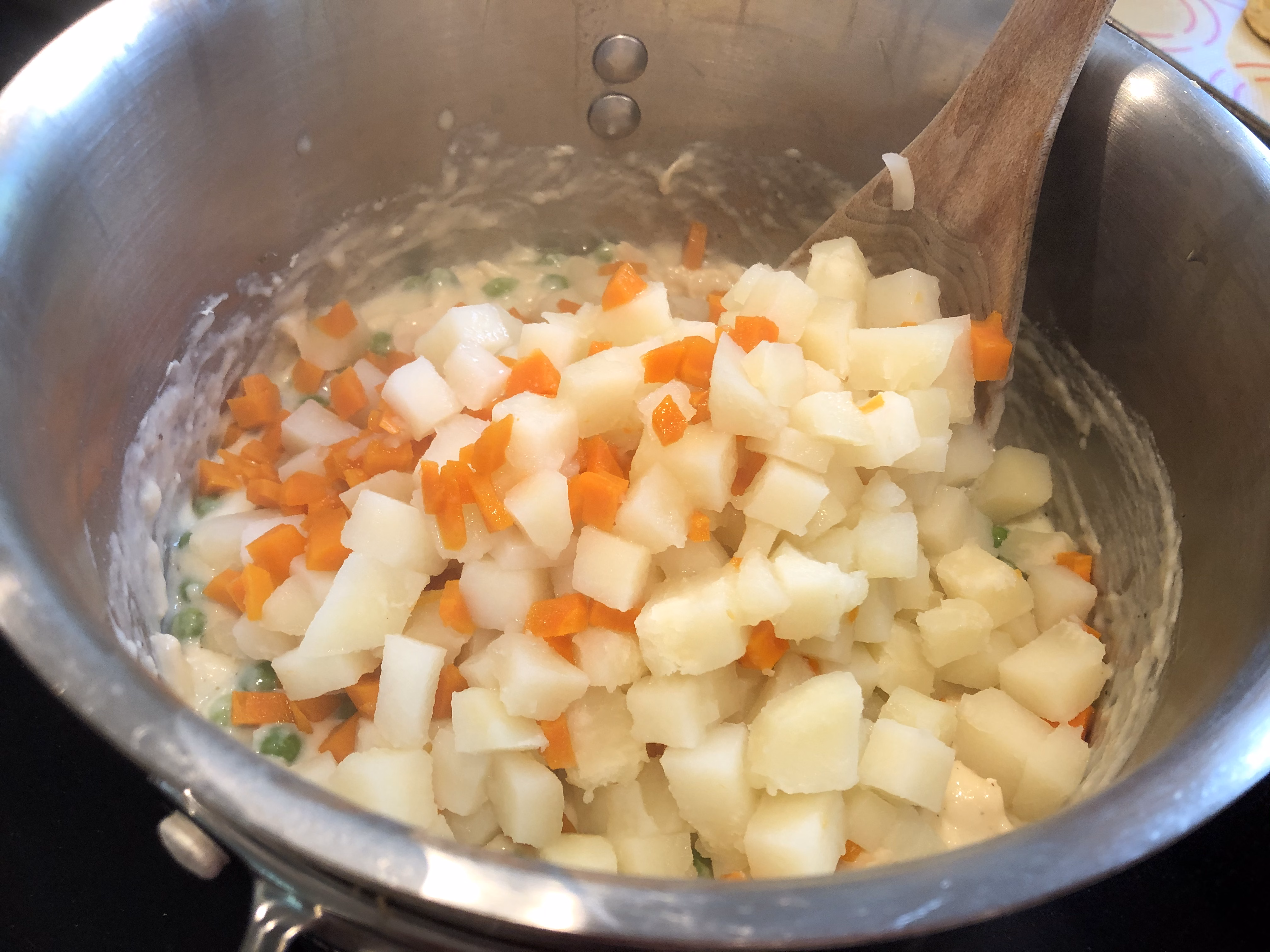 Shred the rotisserie chicken. Add to the cream sauce. Add the peas, potatoes, and carrots. Heat through.
