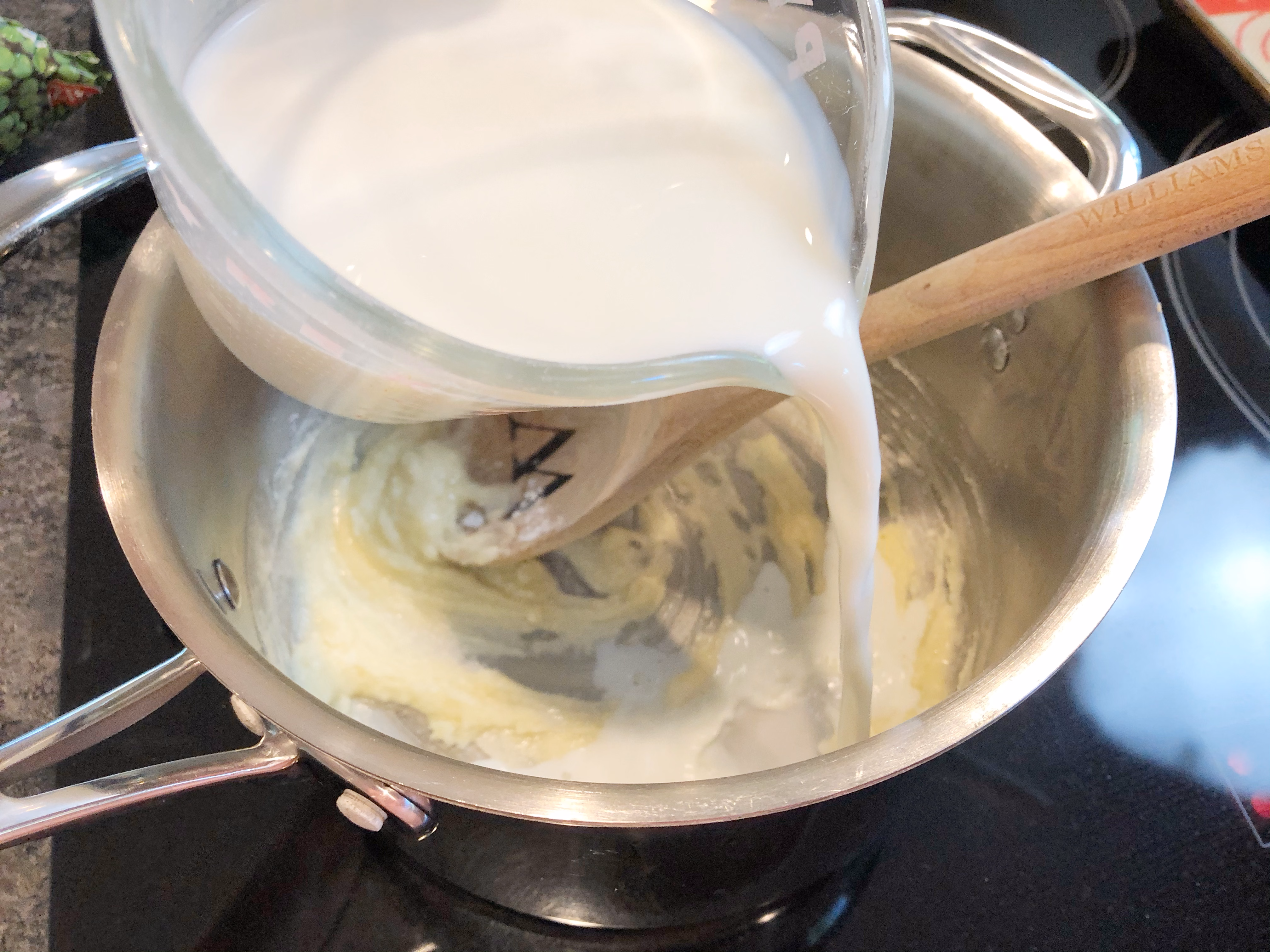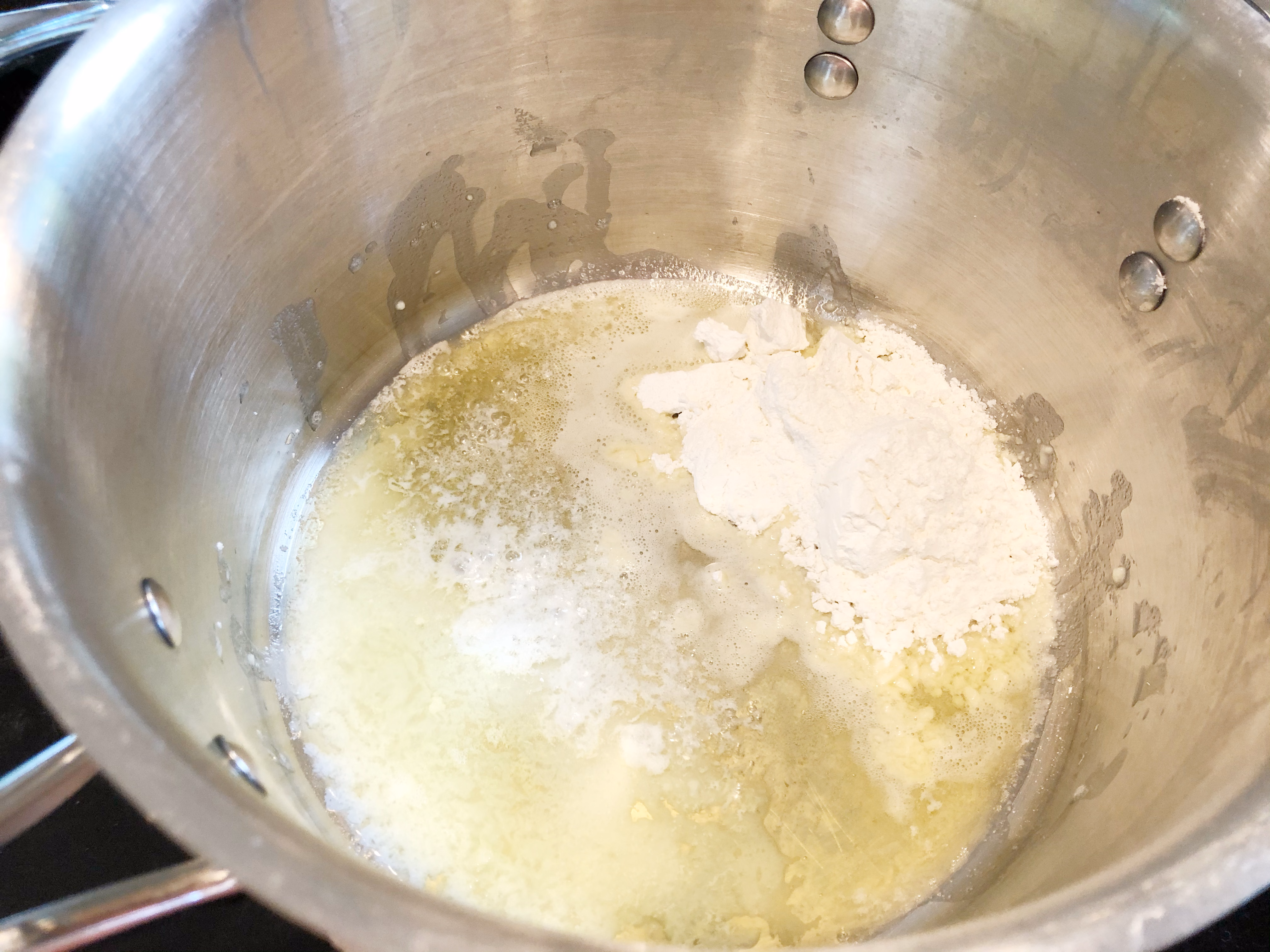 Cook and stir butter and flour until it forms a thick paste. Gradually add 2 cups milk, whisking over medium heat. Add 4 teaspoons chicken bouillon and 1/2 teaspoon black pepper. Bring to a boil, then cook while stirring for 2 minutes or until thickened.