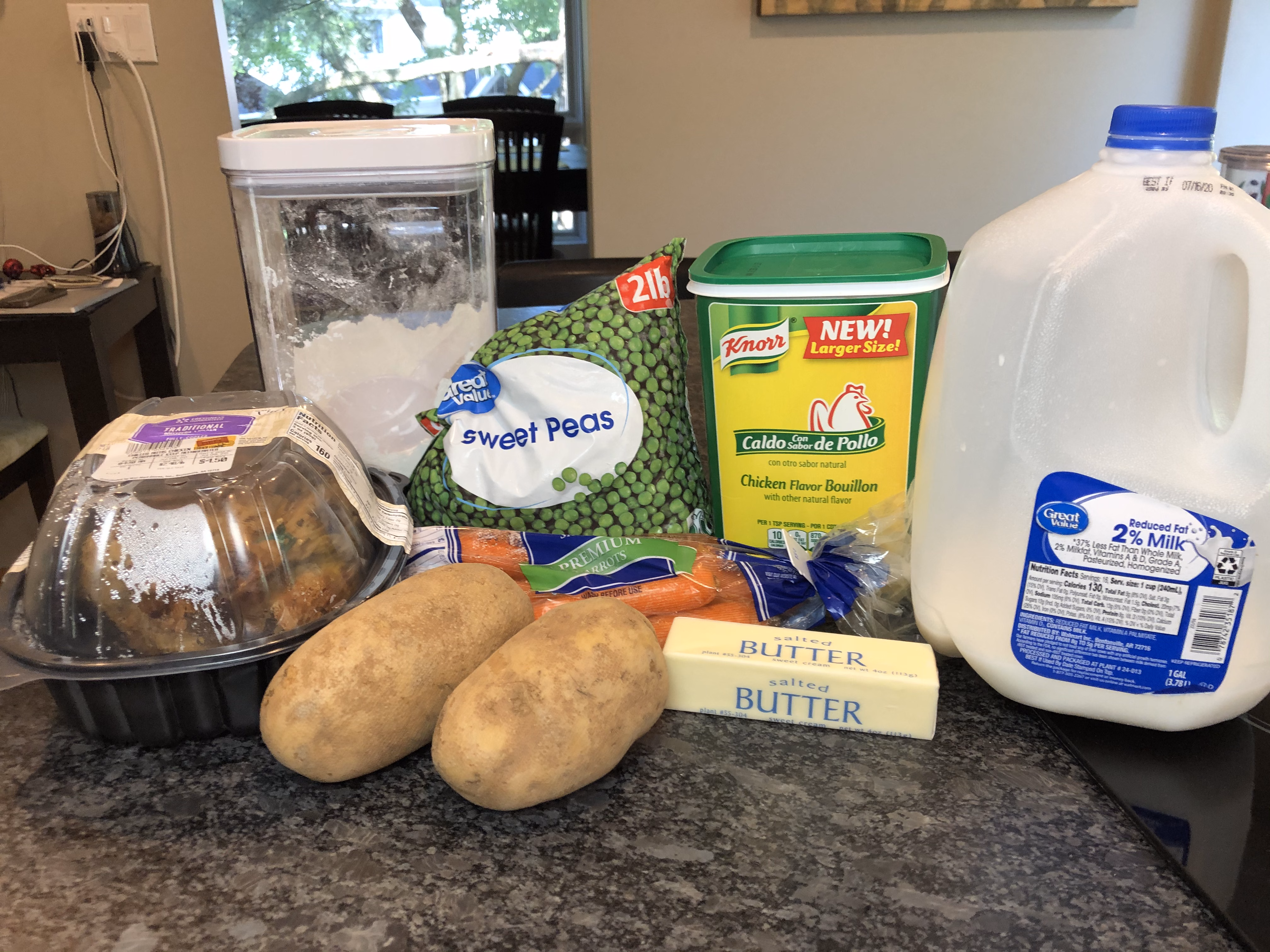 Gather your ingredients. You will need two potatoes, two carrots, frozen peas, a rotisserie chicken, butter, chicken bouillon, gluten free flour, pepper, and milk.
