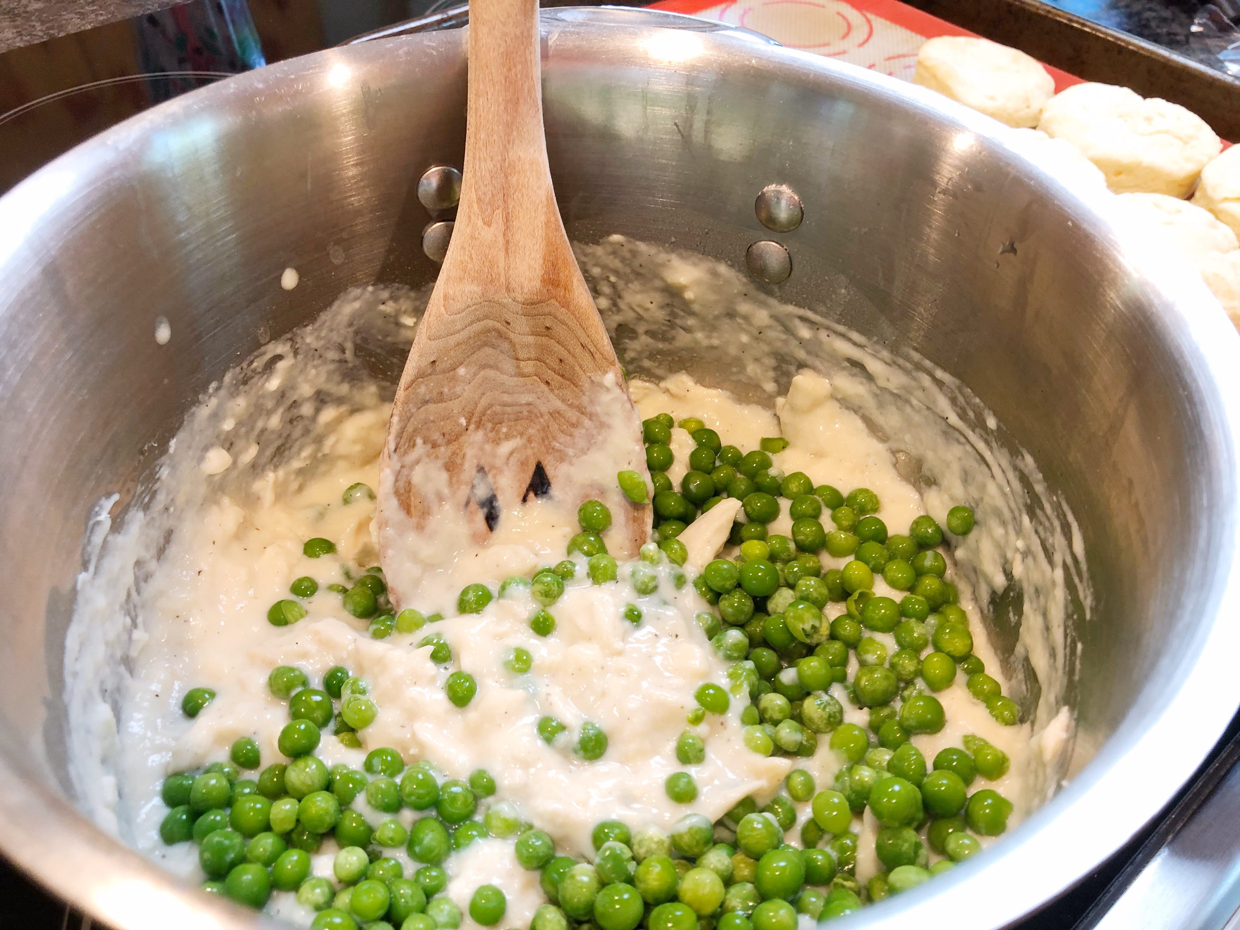 Comfort food at it's finest! This dish is like homemade chicken pot pie, but with homemade biscuits instead of pie crust. I love creamed vegetables and grew up eating creamed peas over mashed potatoes all the time. A favorite! This dish gives you creamed potatoes, peas, carrots, and chicken that you serve over warm, tender flaky biscuits. It's enjoyed by kiddos and adults alike, and couldn't be simpler to prepare. Your family will love this dinner! !