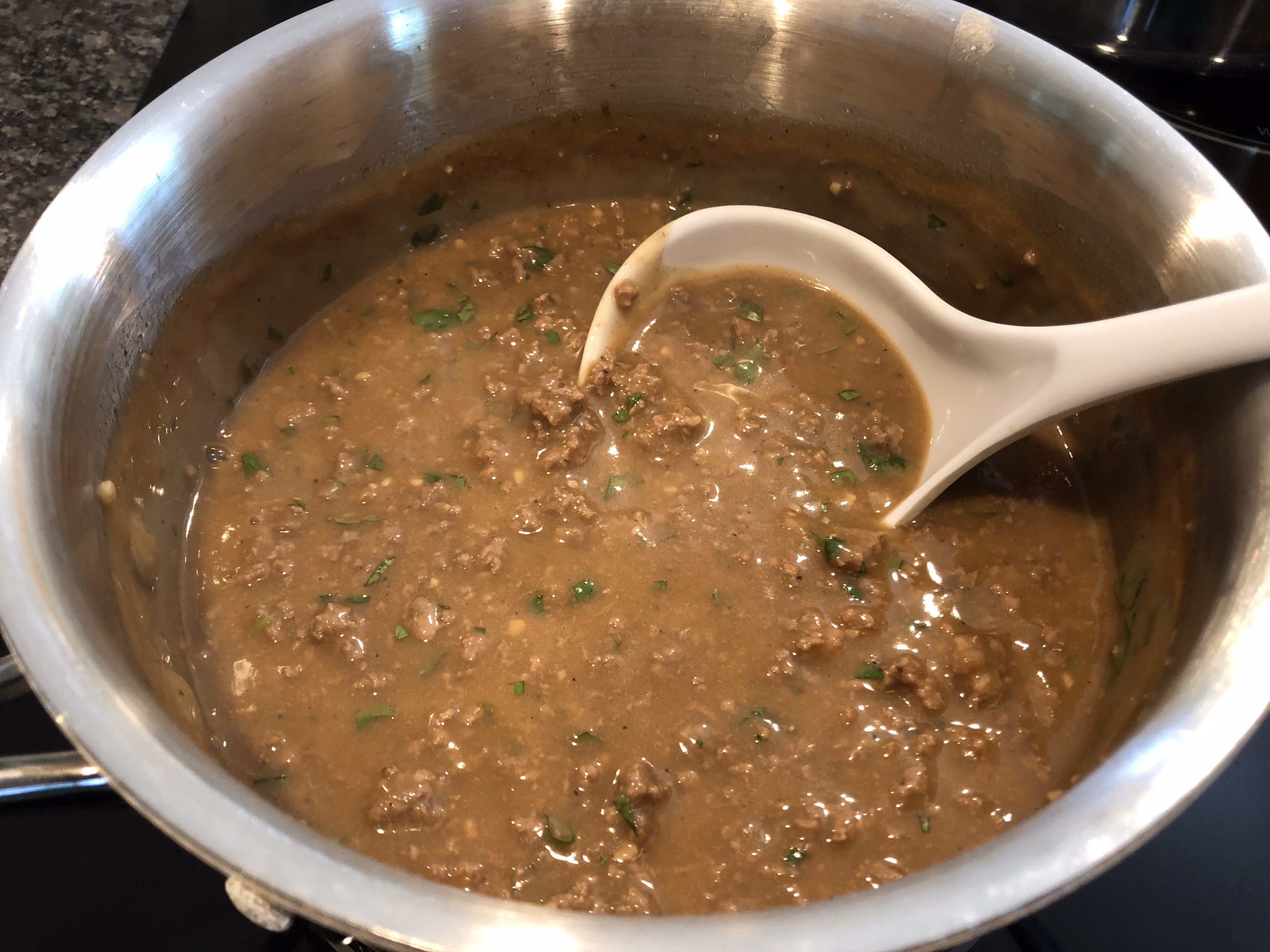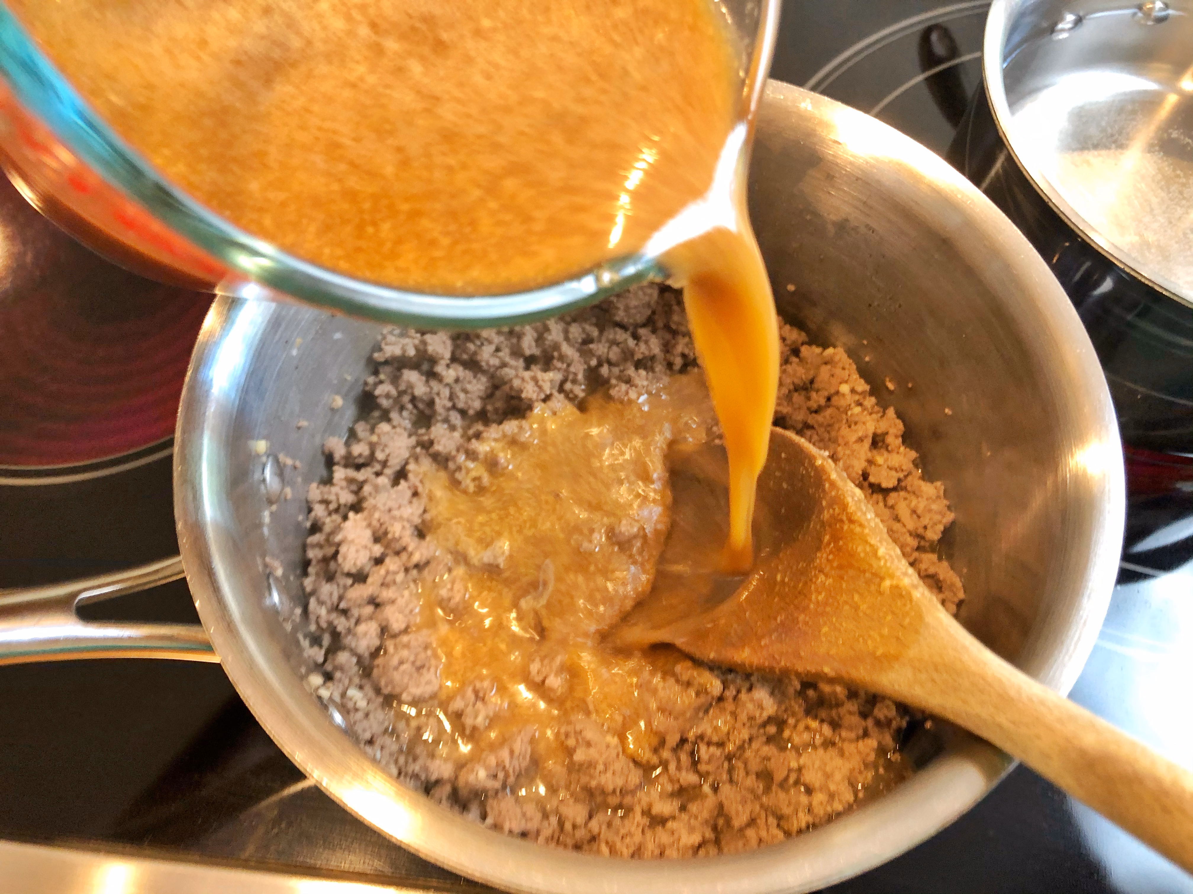 Stir the sauce to recombine, then pour over the meat. Stir and let it simmer over medium-low heat for about 5 minutes or until thickened.