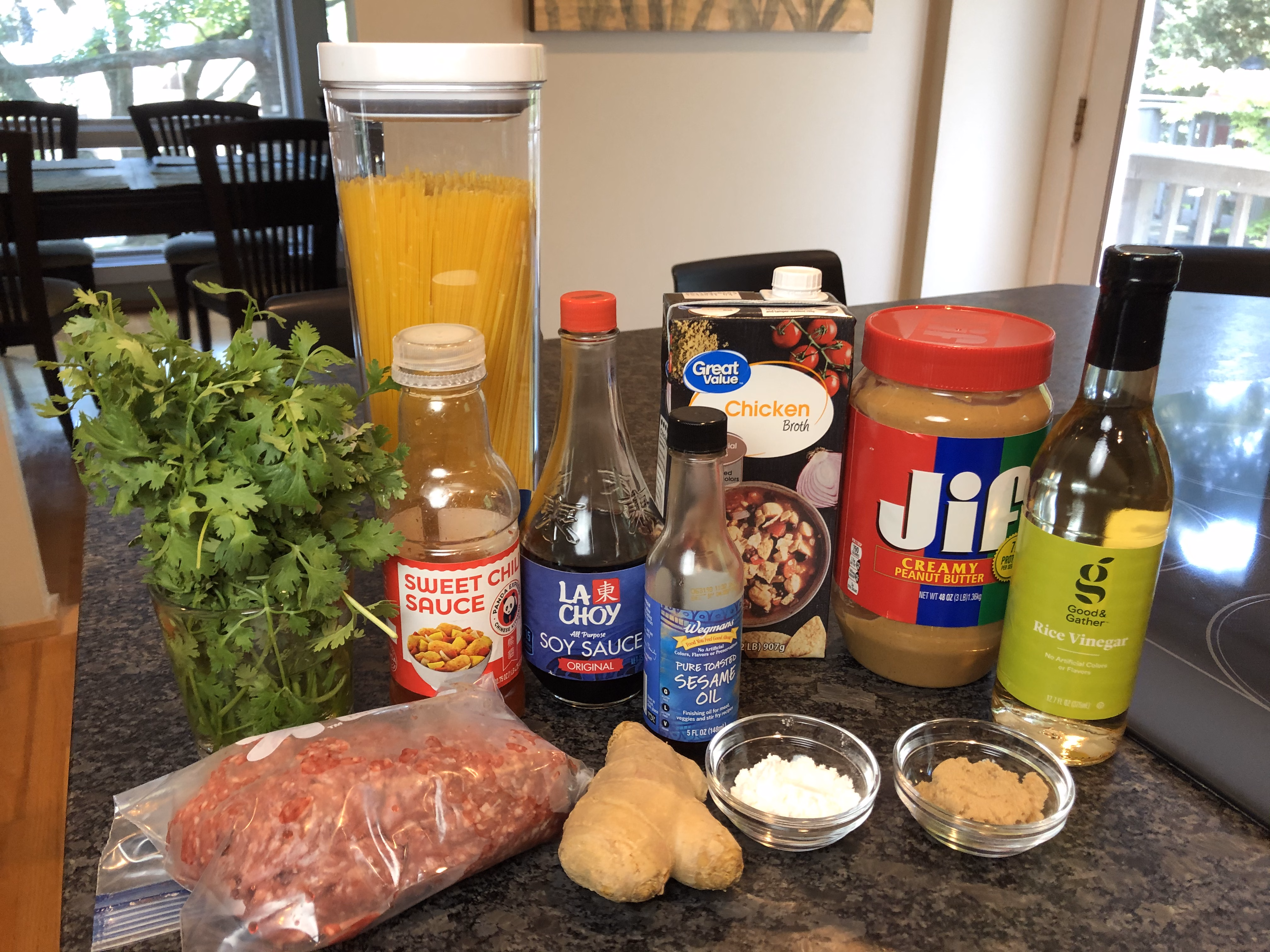 Gather your ingredients. It seems like a long list, but believe me, it's simple and totally worth it! You will need gluten free spaghetti noodles, chicken broth, peanut butter, soy sauce, chili garlic sauce, cornstarch, brown sugar, rice vinegar, sesame oil, ground beef, salt and pepper, garlic, ginger, and cilantro. This cilantro shown here has been in my refrigerator for a month now and is still absolutely fresh! See my tip for keeping cilantro inthis post.