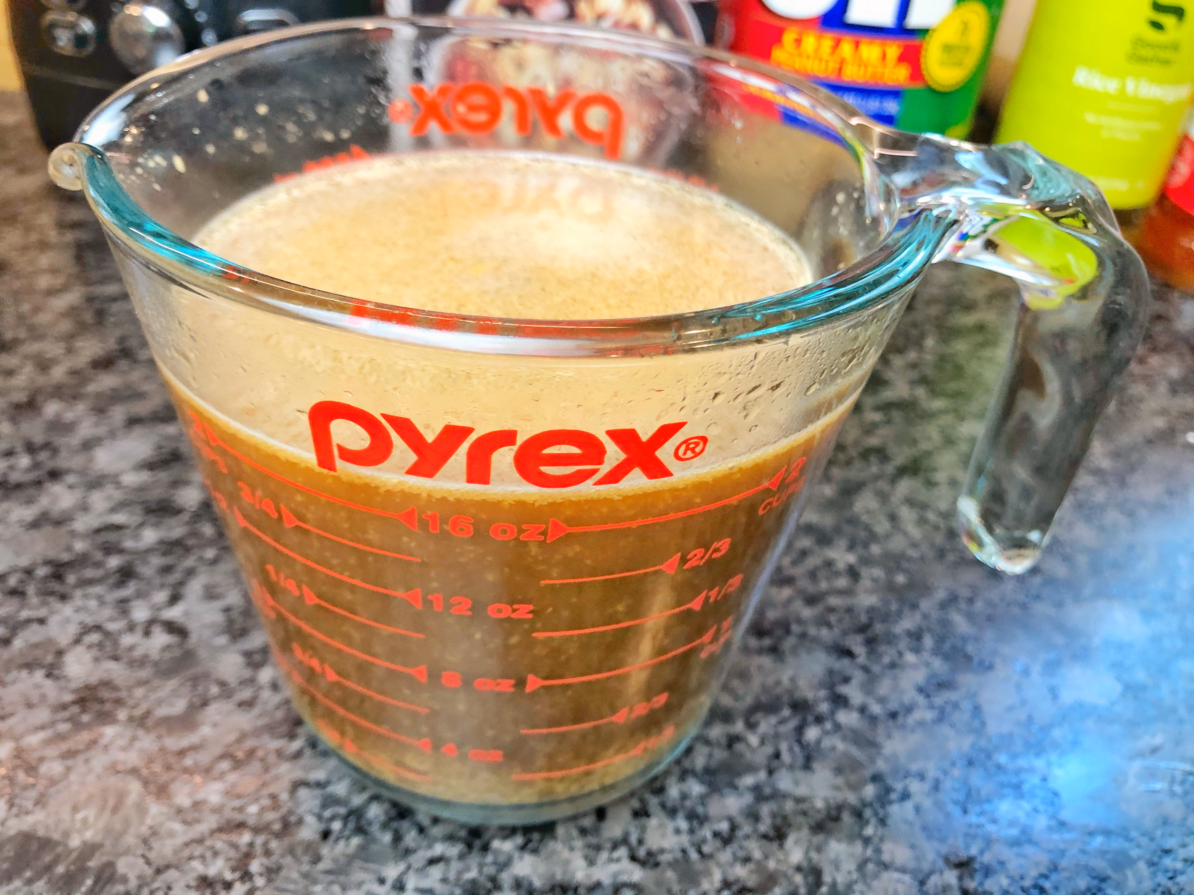 In a large liquid measuring cup, add 1 1/2 cups chicken broth, 1/4 cup peanut butter, 1/4 cup soy sauce, 1 teaspoon chili garlic sauce, 2 tablespoons cornstarch, 1 tablespoon brown sugar, 1 tablespoon rice vinegar, and 2 teaspoons sesame oil. Whisk to combine.