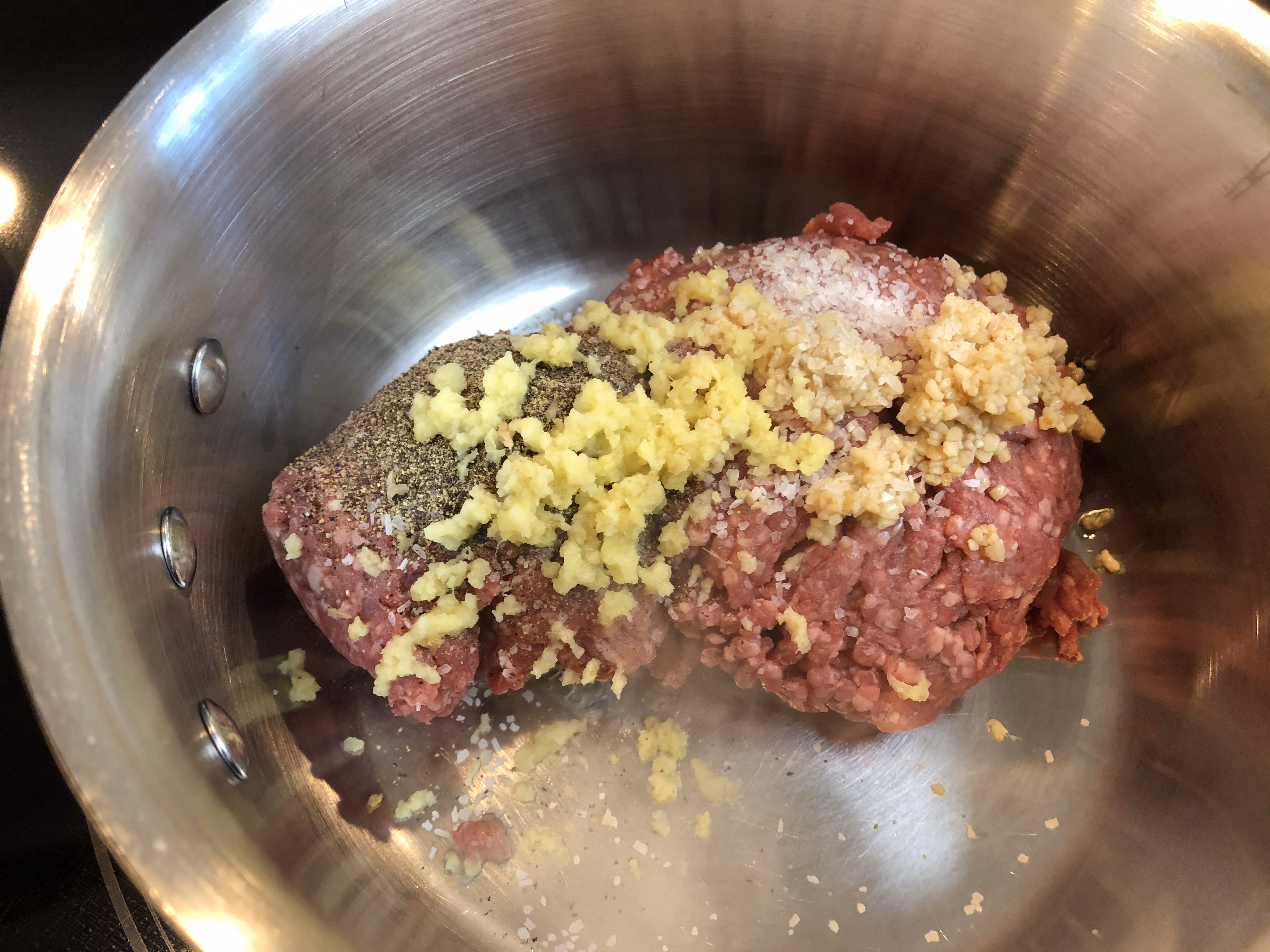 In a large saucepan, add 1 lb. ground beef, 1/2 teaspoon salt, 1/2 teaspoon pepper, 2 teaspoons minced garlic, and 1 tablespoon freshly grated ginger.