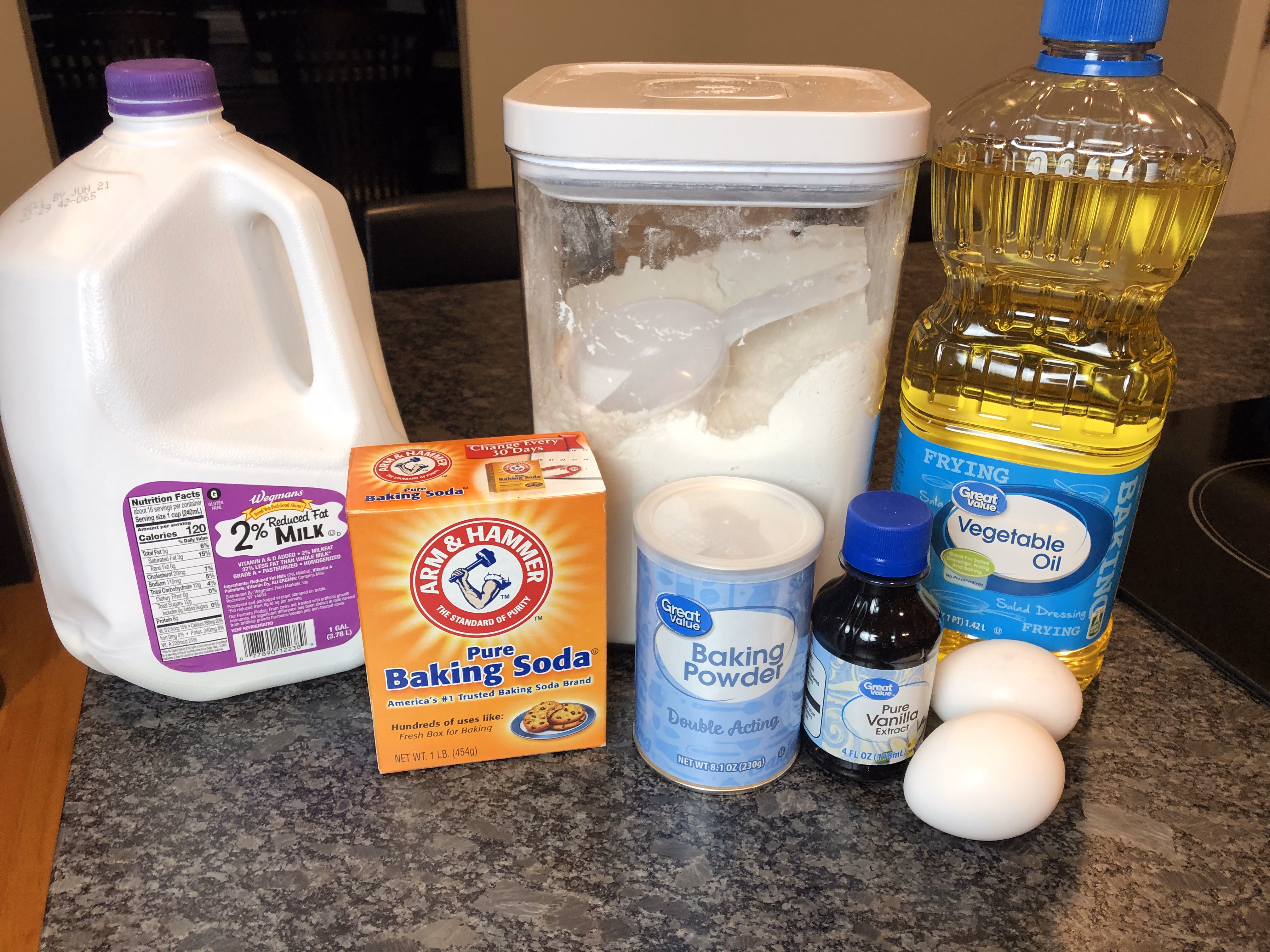 Gather your ingredients. You will need gluten free flour, baking powder, baking soda, eggs, milk, vanilla, and vegetable oil.