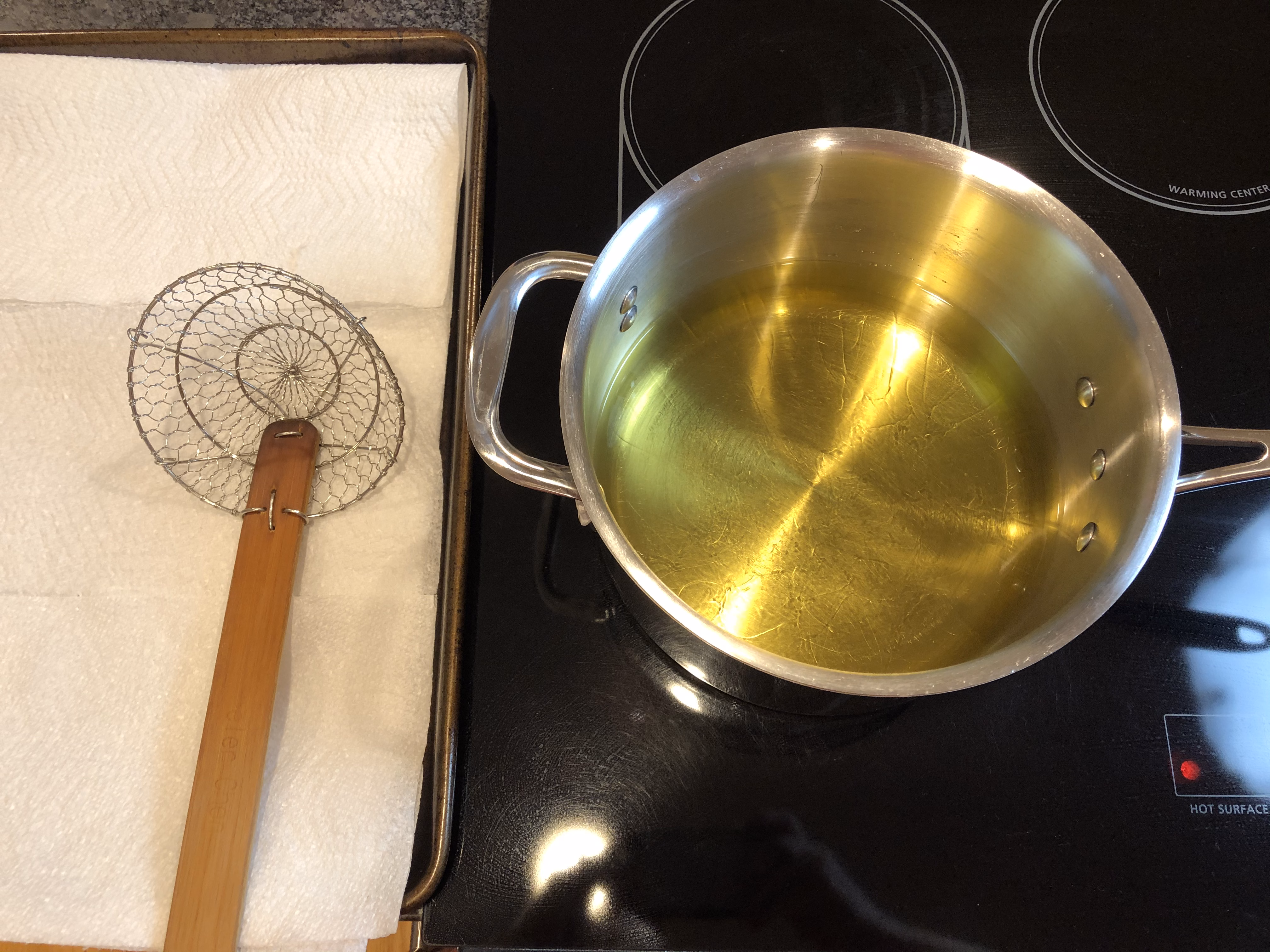 Prepare your frying station by heating about an entire bottle of vegetable oil to 350°F in a large pot. Get a baking sheet covered with paper towels for a landing zone. I also love having this spider strainer when working with frying food.