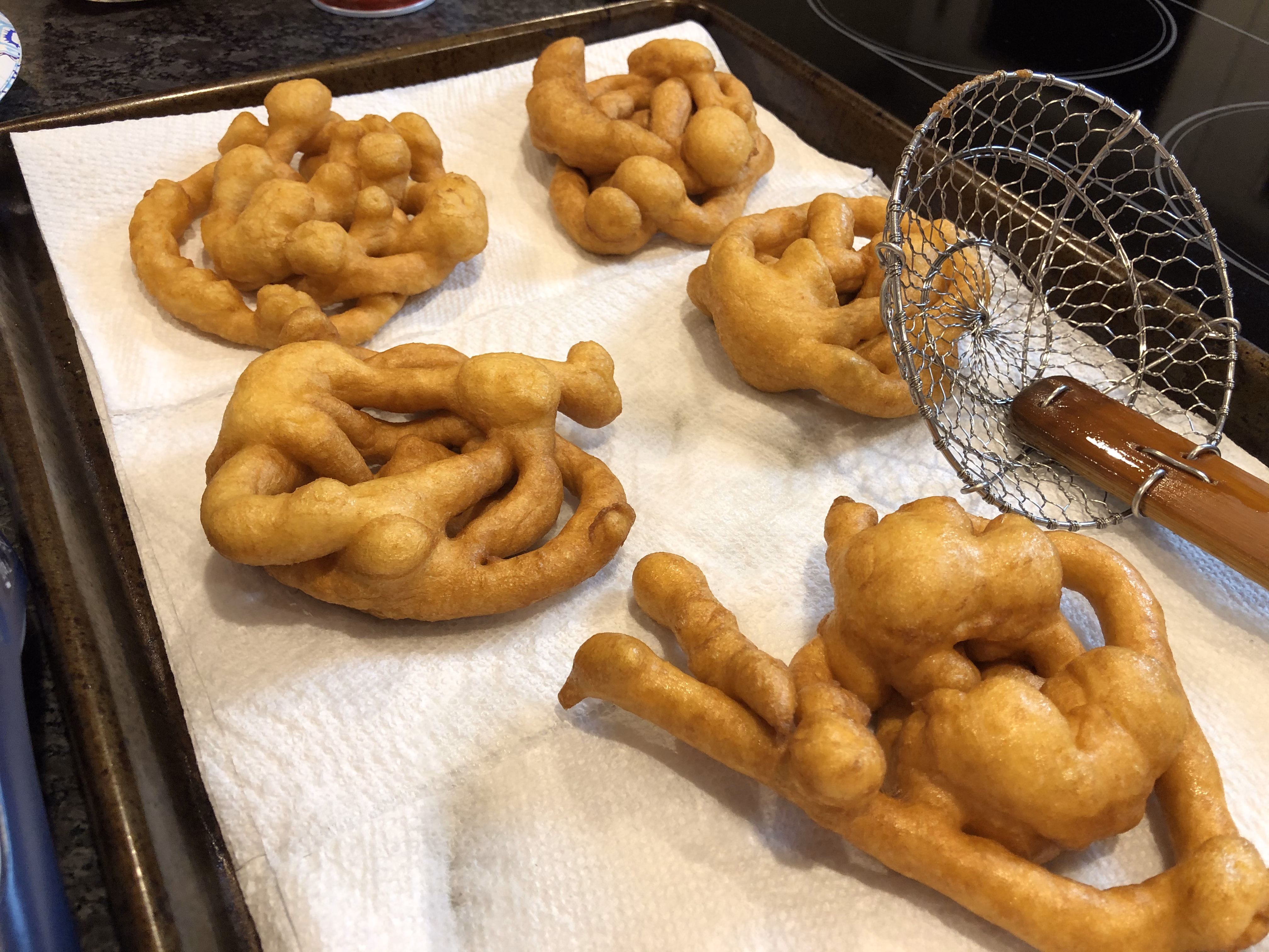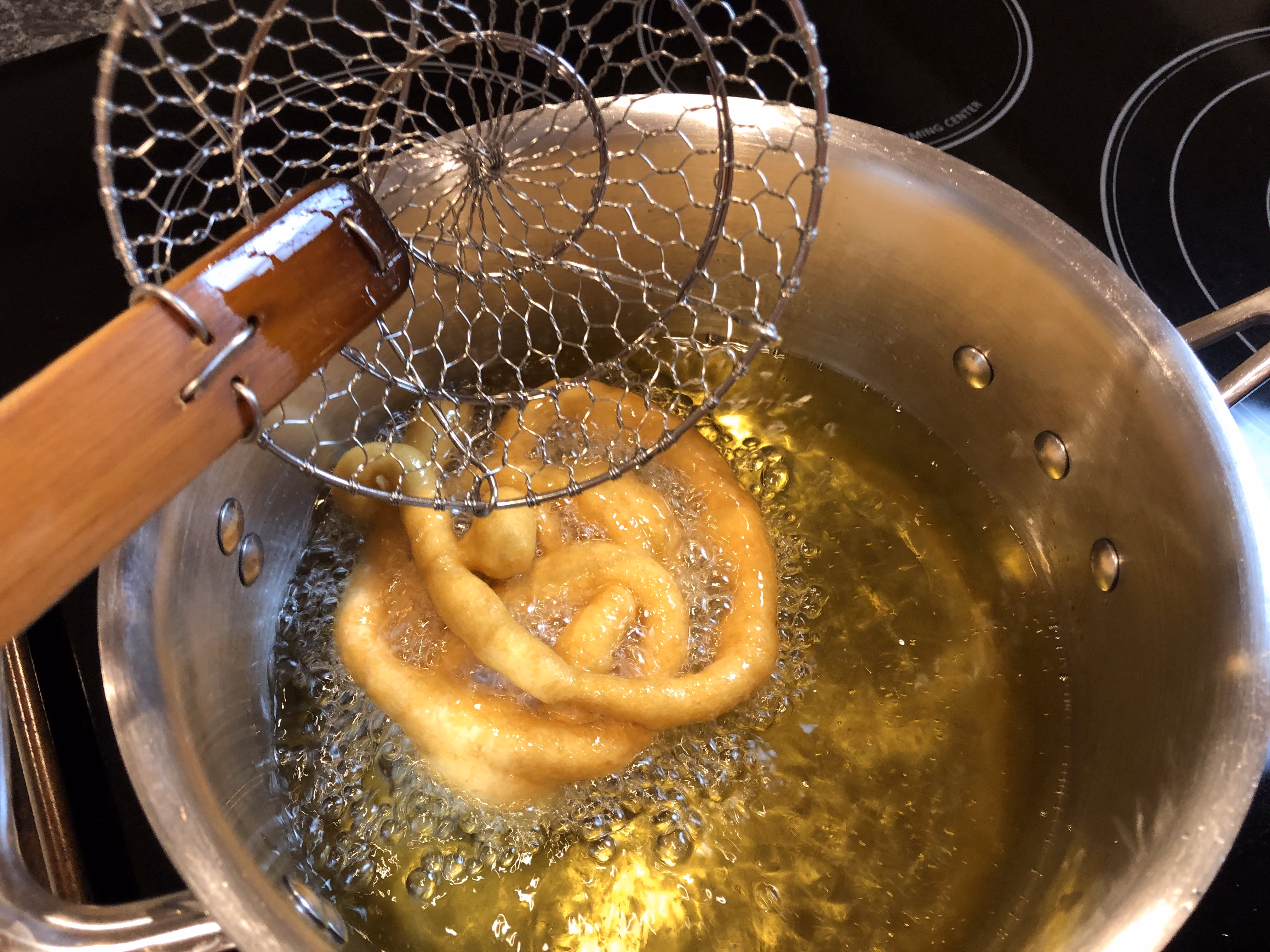 Once your oil reaches 350°F, squirt the batter into the oil in circular swirls, leaving gaps for it to puff up. It doesn't have to look any certain way..... this is very free-form, so just have fun with your designs.