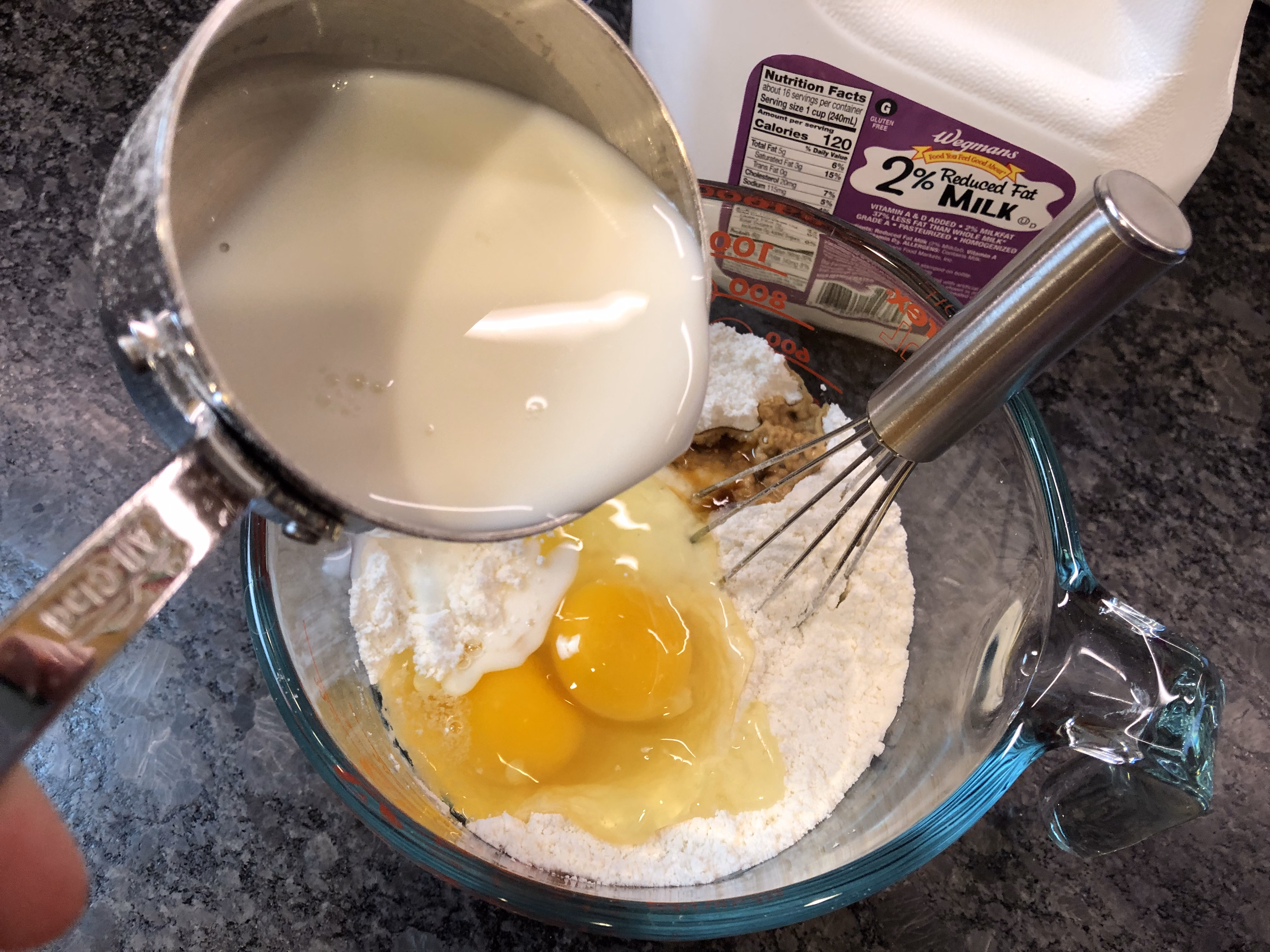 Add your wet ingredients which includes 2 eggs, 1 teaspoon vanilla, and 3/4 - 1 cup milk depending on the flour you use. You want your batter to be thin enough to be pourable.