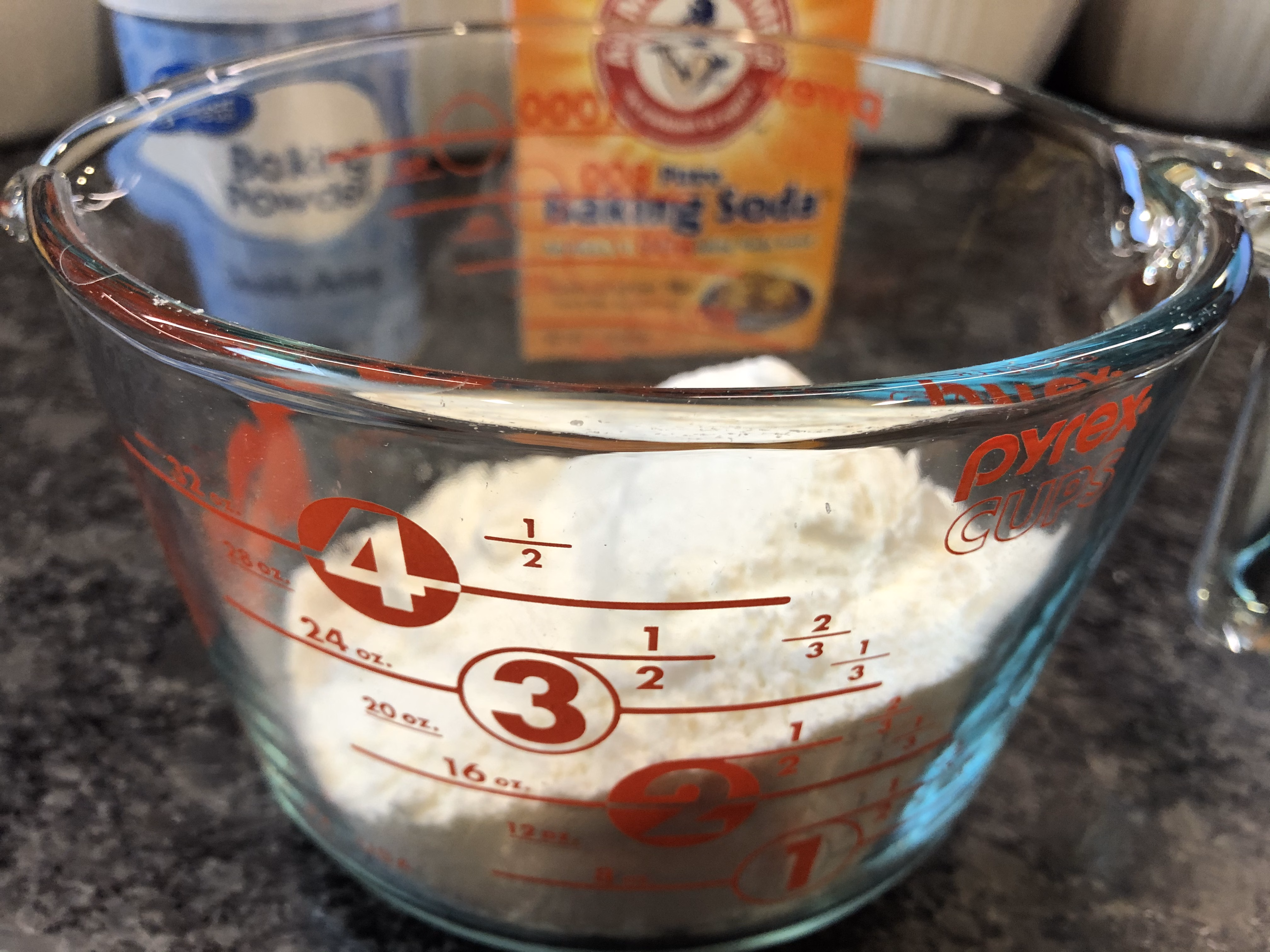 In a glass measuring cup, add dry ingredients which are 1 1/3 cups gluten free flour (I used a 1: 1 flour), 1 teaspoon baking powder, 1/2 teaspoon baking soda, and 1/2 teaspoon salt.