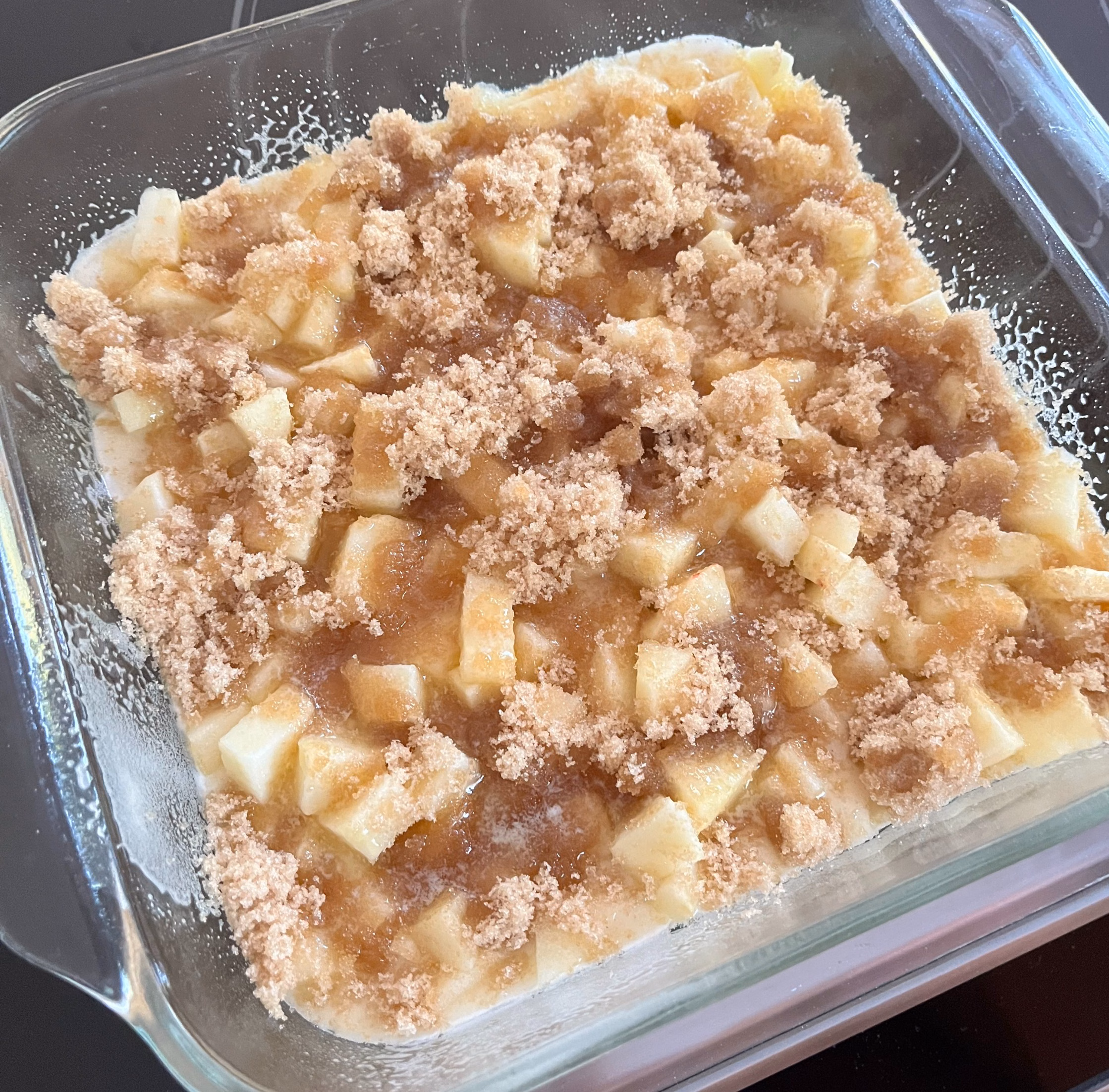 Bake at 350°F for 25 minutes, and the magic happens. The cake rises to the top and the apples go underneath. The butter makes the edges so delicious.