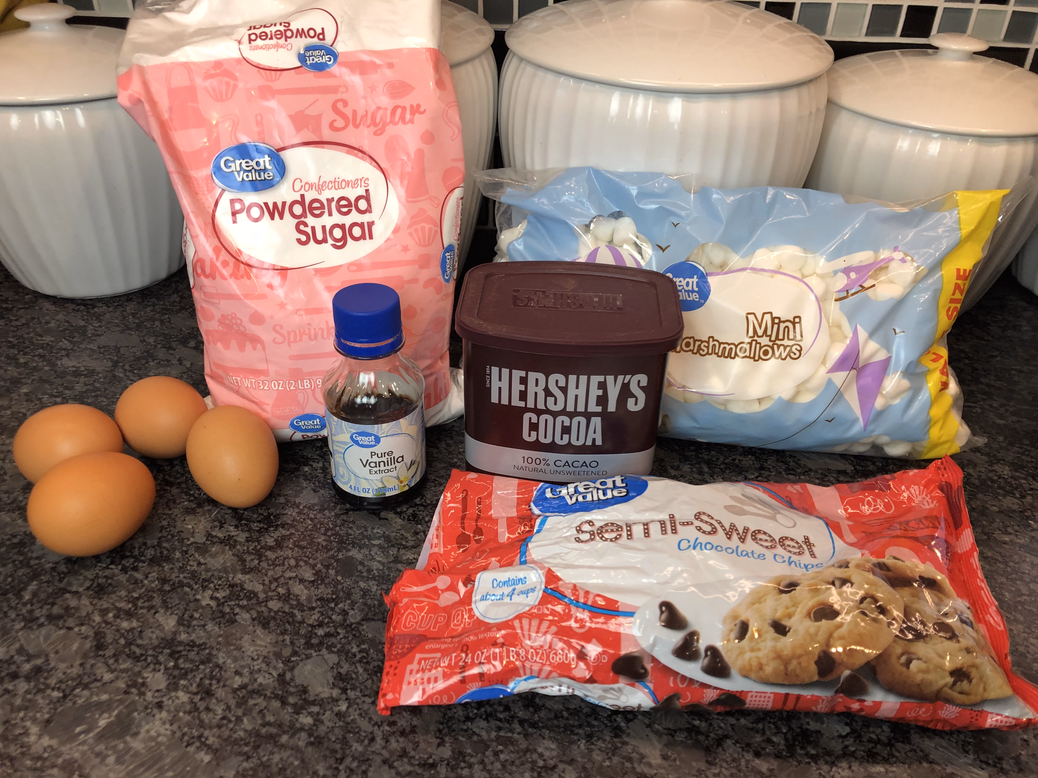 Gather your ingredients. You will need powdered sugar, baking cocoa, salt, eggs, vanilla, chocolate chips, and marshmallows.
