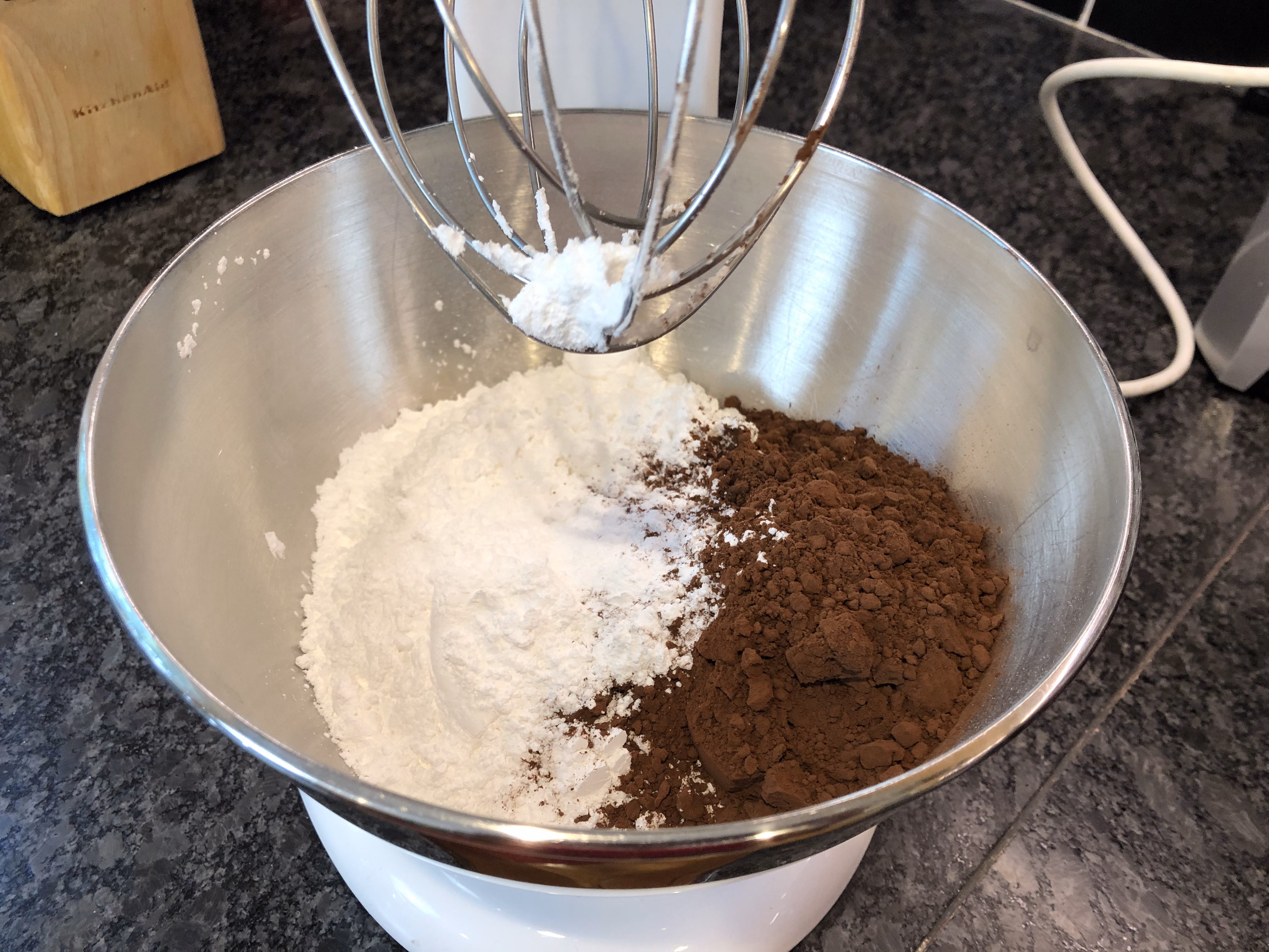 In a mixing bowl, whisk together the dry ingredients: 3 cups powdered sugar, 2/3 cup baking cocoa powder, and 1/2 teaspoon salt.