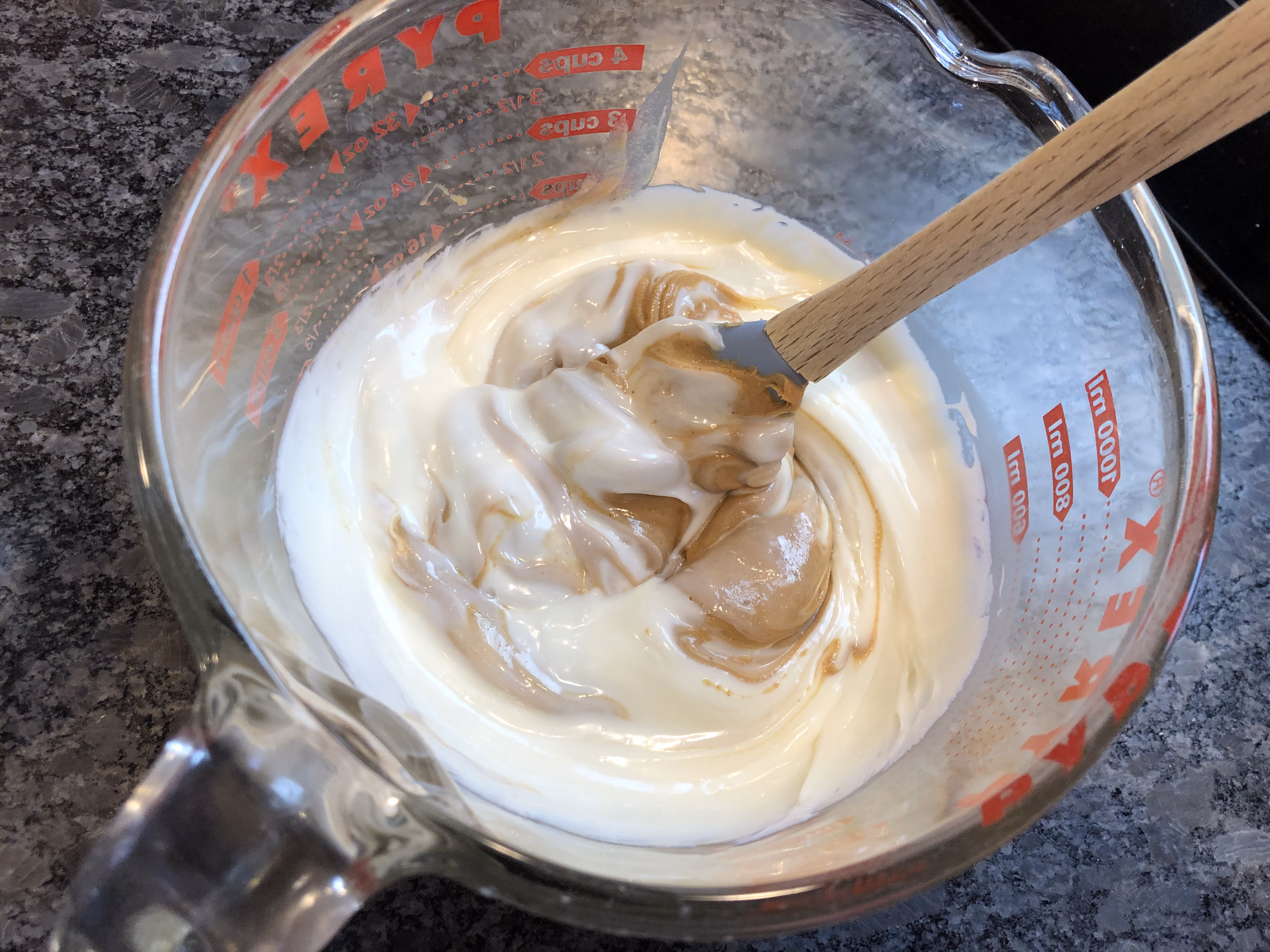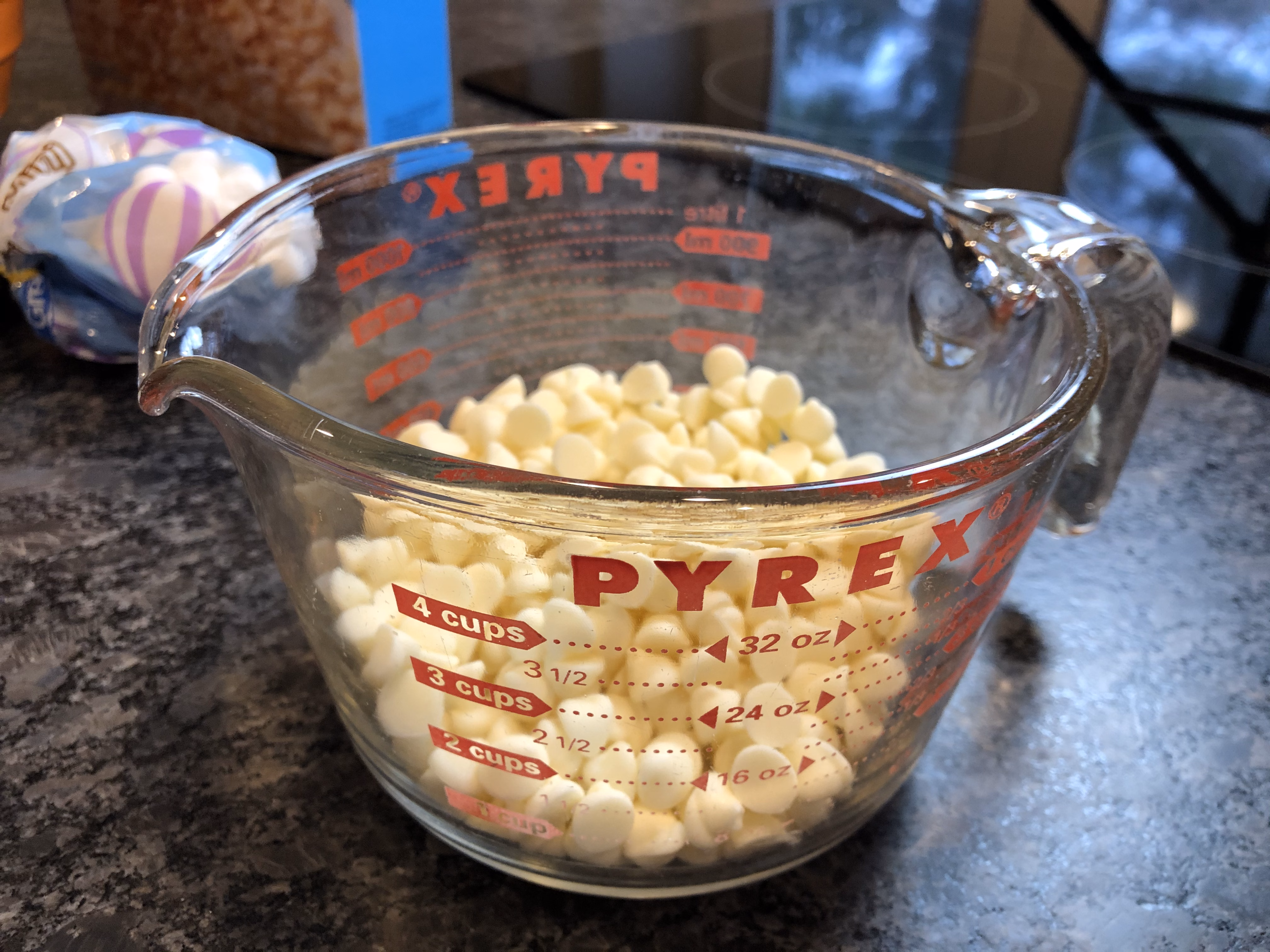 In a glass measuring cup, add the white chips. To melt, microwave on high in 30 second intervals, stirring after each, until it's smooth.