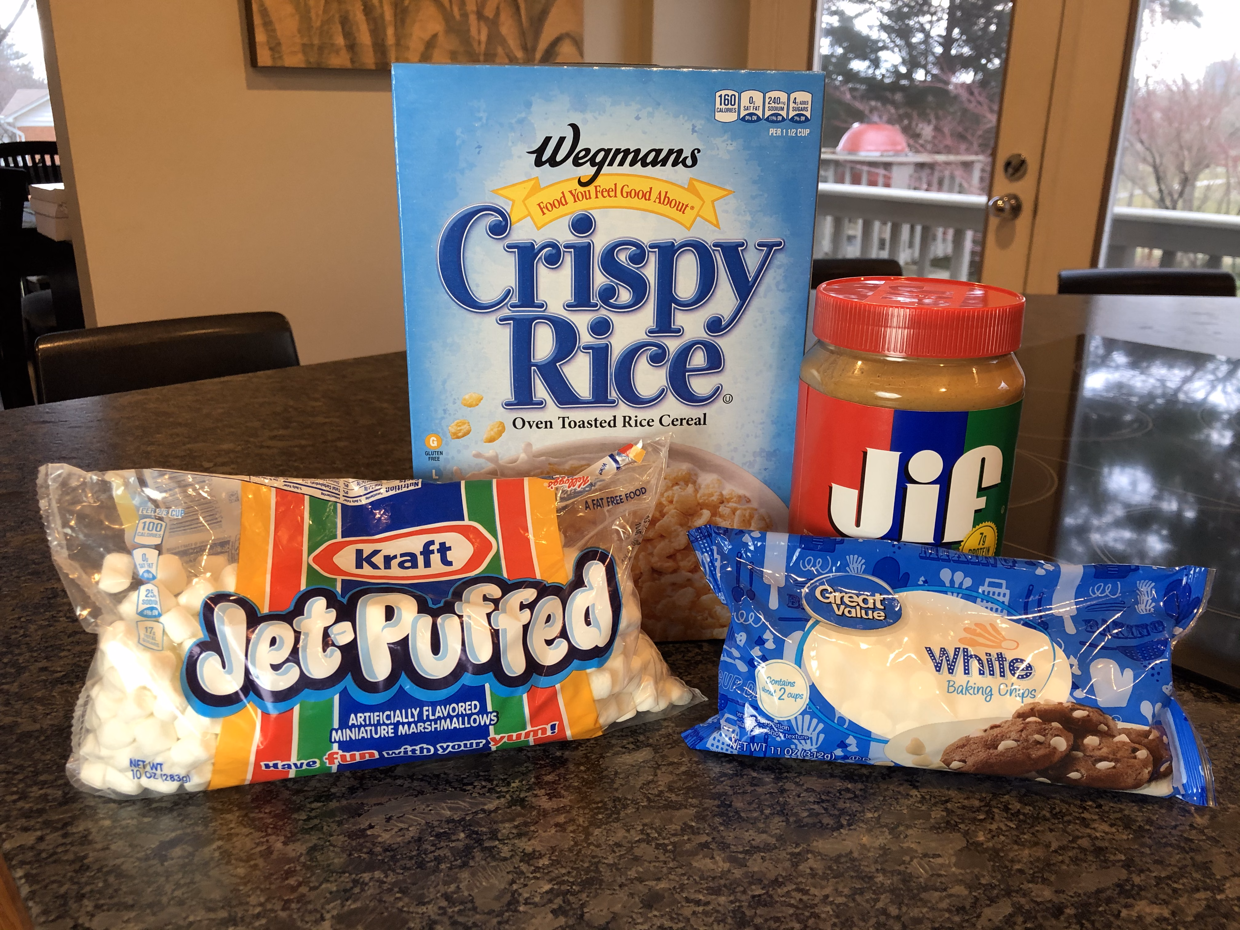Gather your ingredients. You will need crisp rice cereal (be sure it's gluten free), miniature marshmallows, white baking chips, and peanut butter.