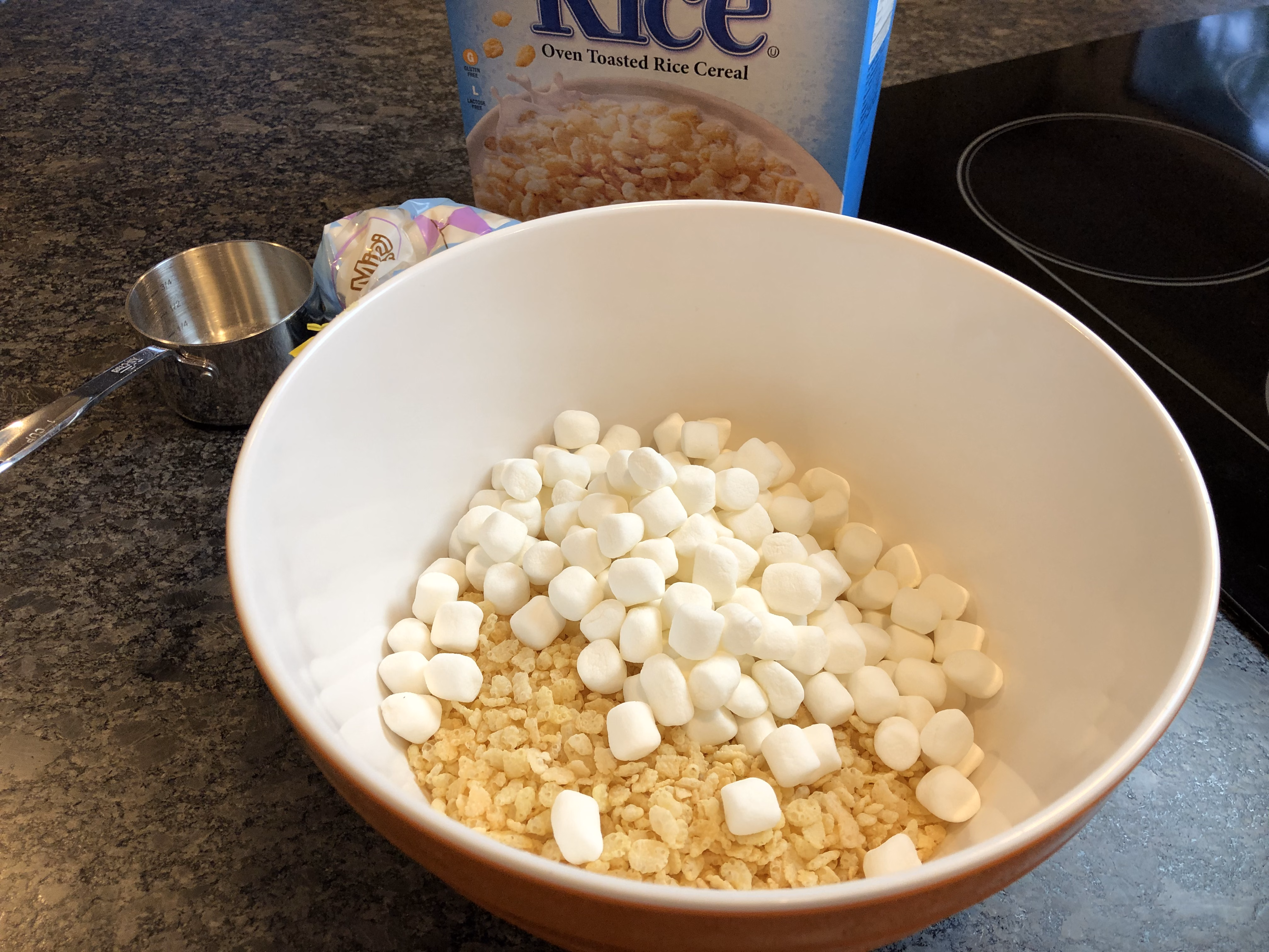 In a large mixing bowl, add the 2 cups cereal and 1 1/2 cups marshmallows. Gently stir.