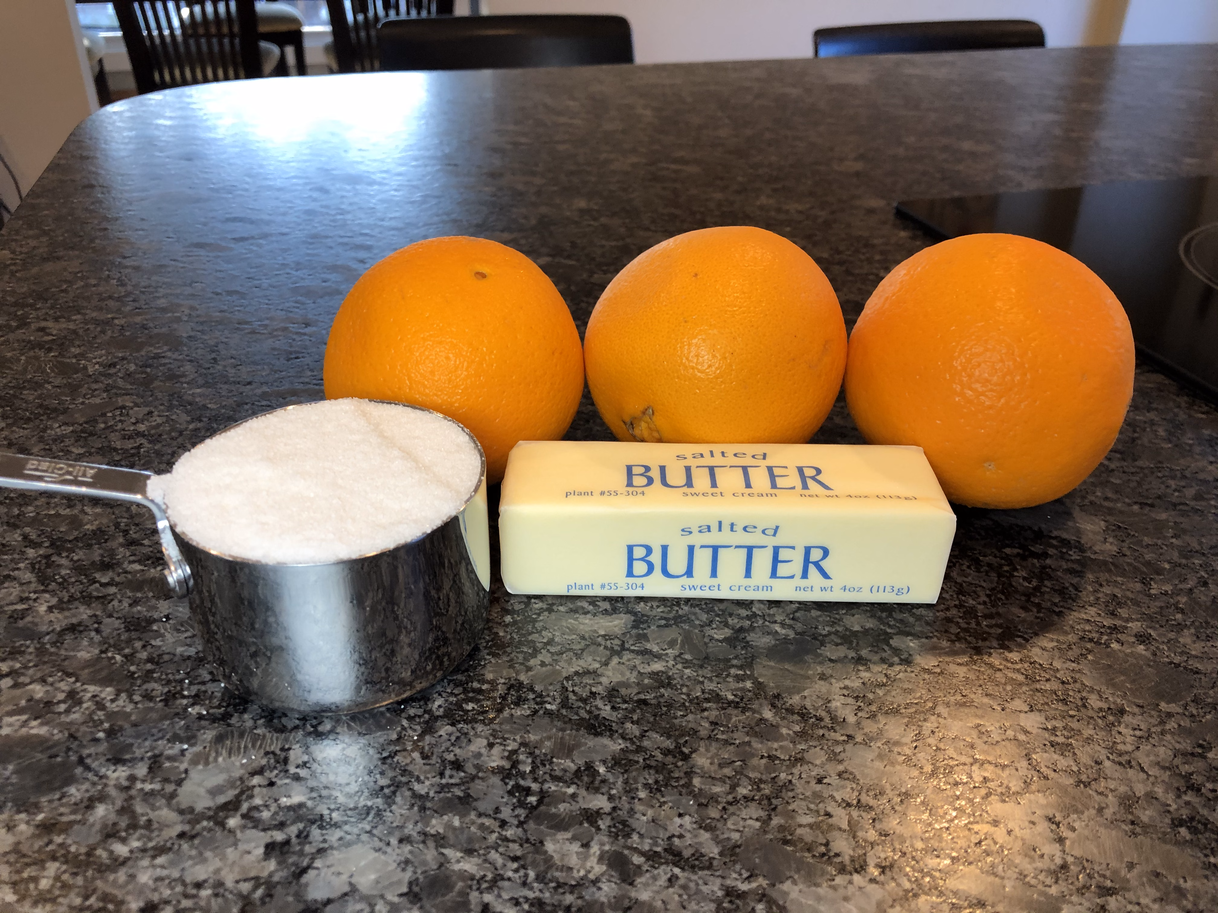 Meanwhile, you can make the filling. You will need 3 oranges, granulated sugar, and butter.