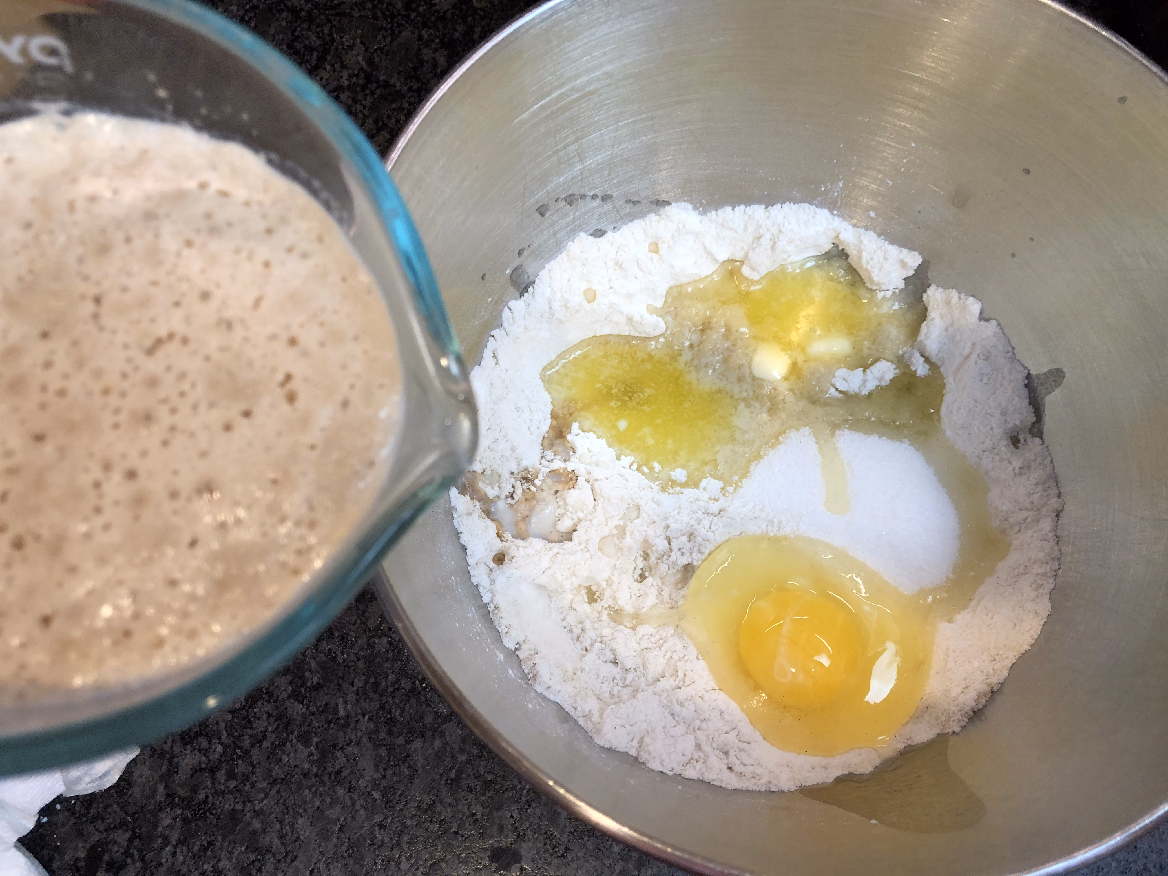 Give the dry ingredients a quick mix, then add 1/3 cup sugar, 1 egg, and 1 teaspoon vanilla. Pour in the proofed yeast mixture.