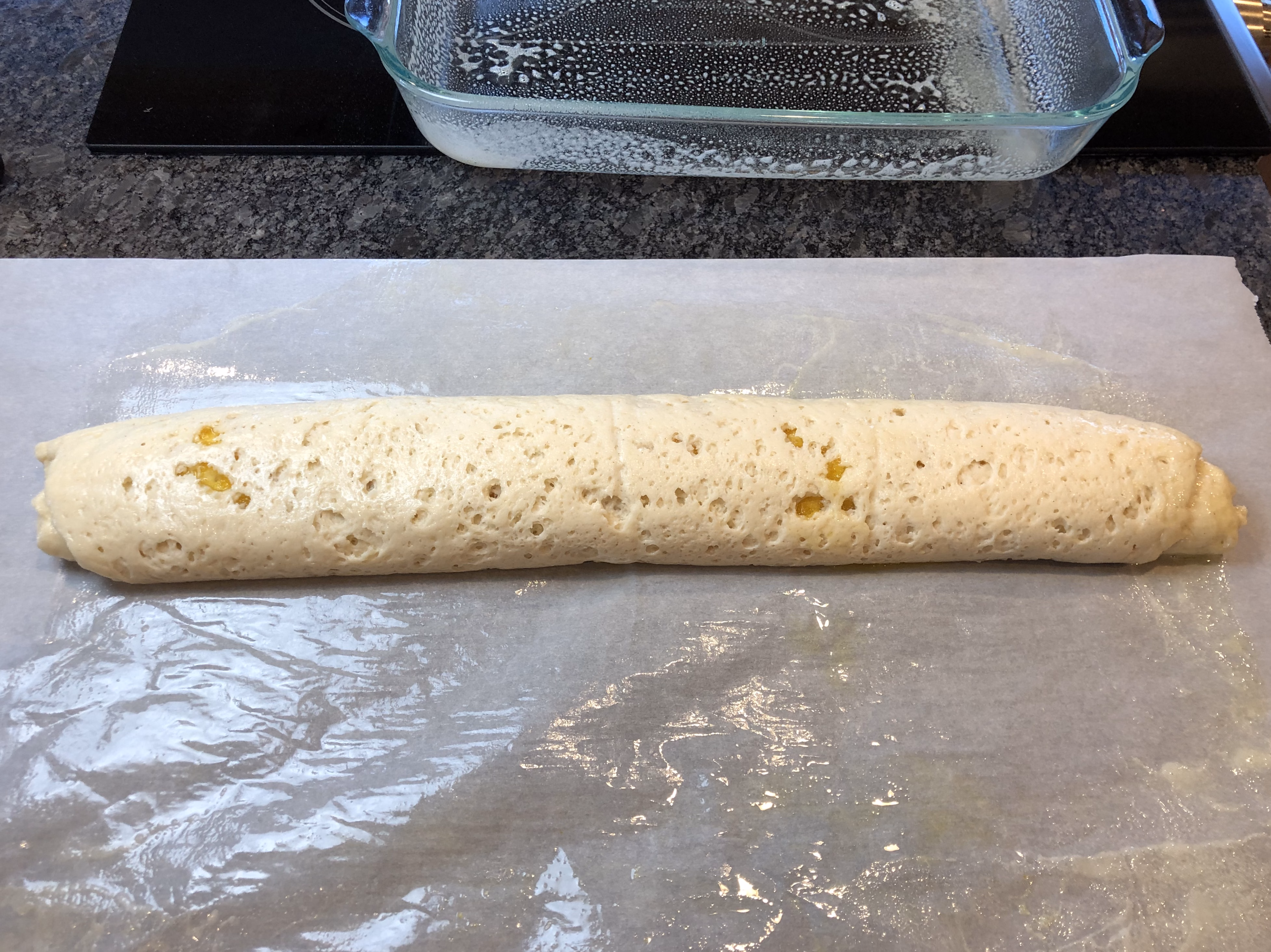Now comes the trickier part..... but you can do it! Using the parchment as your friend, start to roll the dough away from you, then peel back parchment and roll some more. You will likely need to let the dough slide back down on the parchment as you go, but if you've greased it well, it will do it easily. Keep repeating this, going slowly. Once you have the entire dough rolled up like a log, make sure the seam is on the bottom.