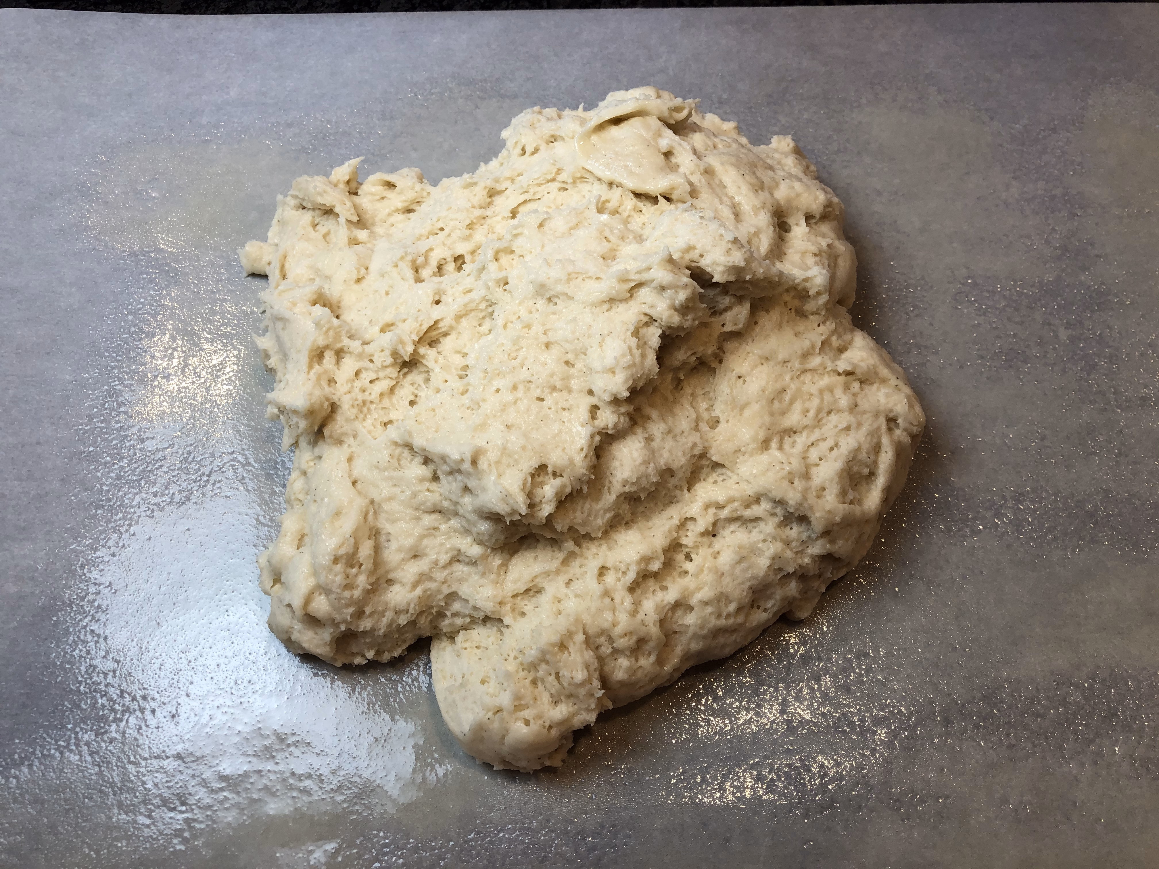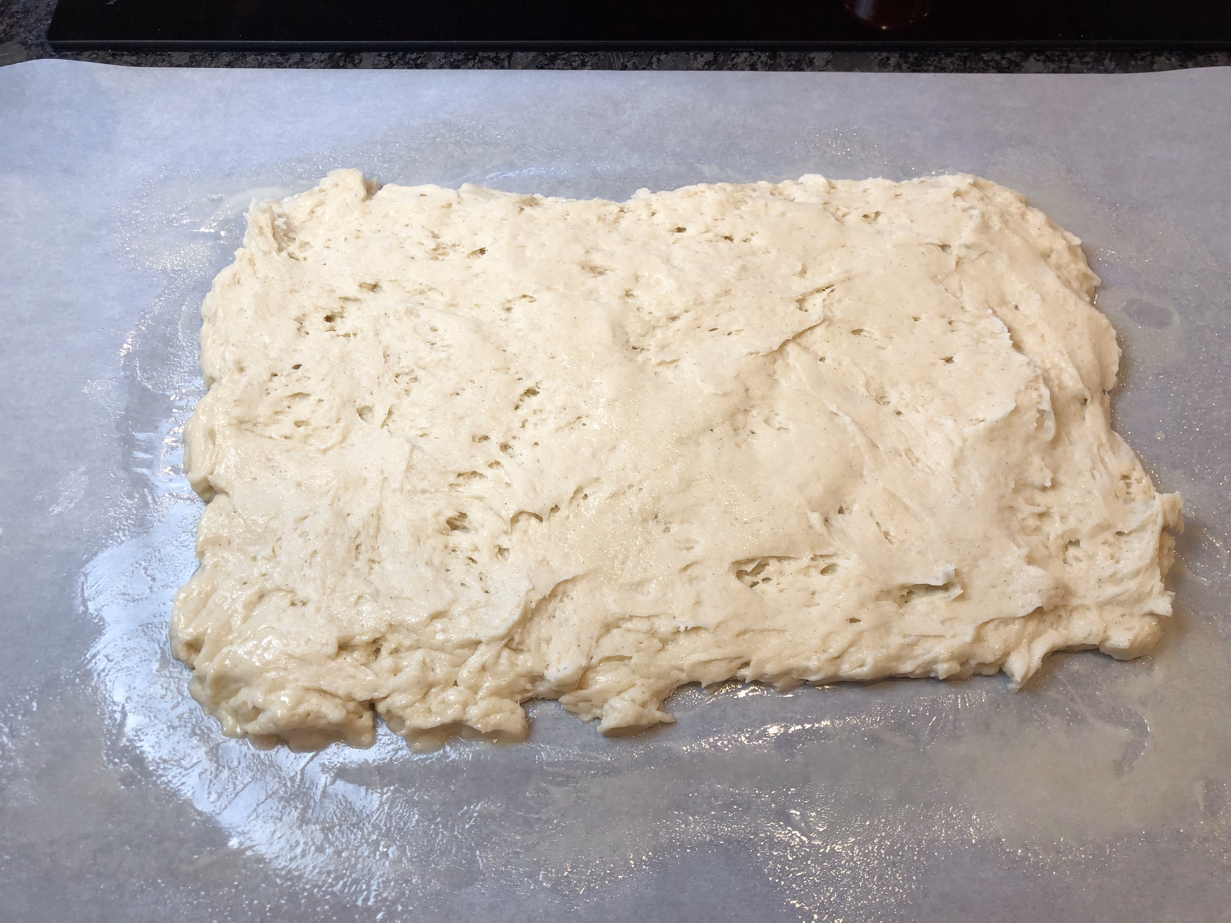 Once the dough has risen, using a greased spatula, scoop the dough out onto a piece of parchment paper that has been well greased.