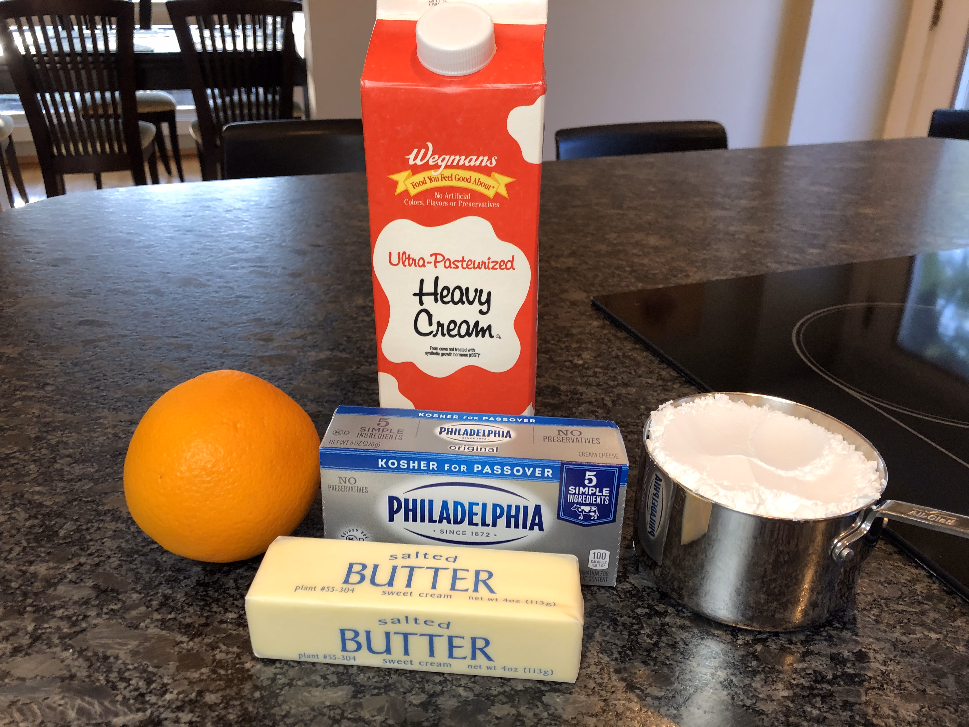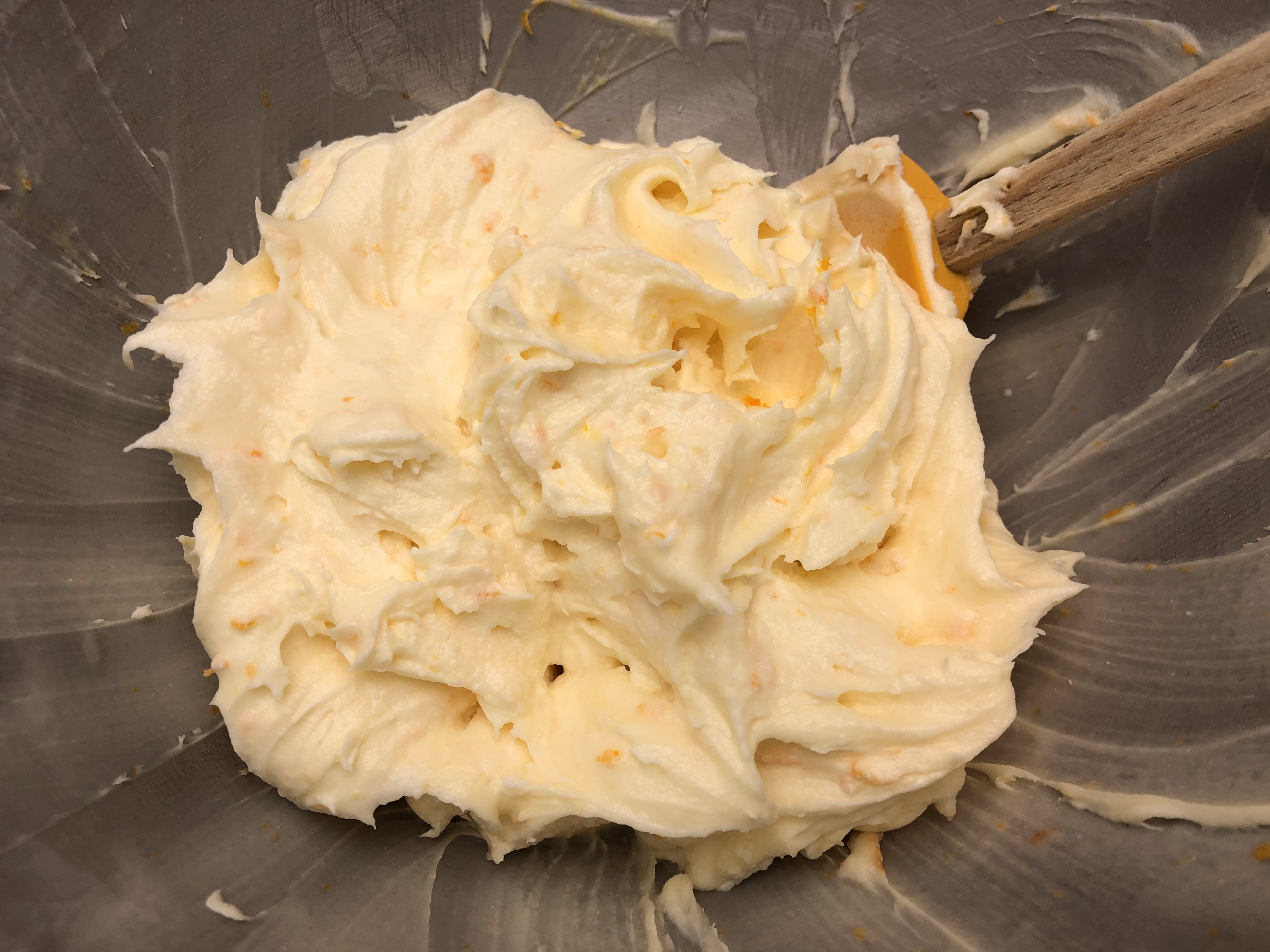 But first you'll want to make this delicious orange cream cheese frosting! You will need one orange, 3 oz. cream cheese, 6 tablespoons butter, 1 tablespoon heavy cream, a pinch of salt, and 1 1/2 cups powdered sugar.