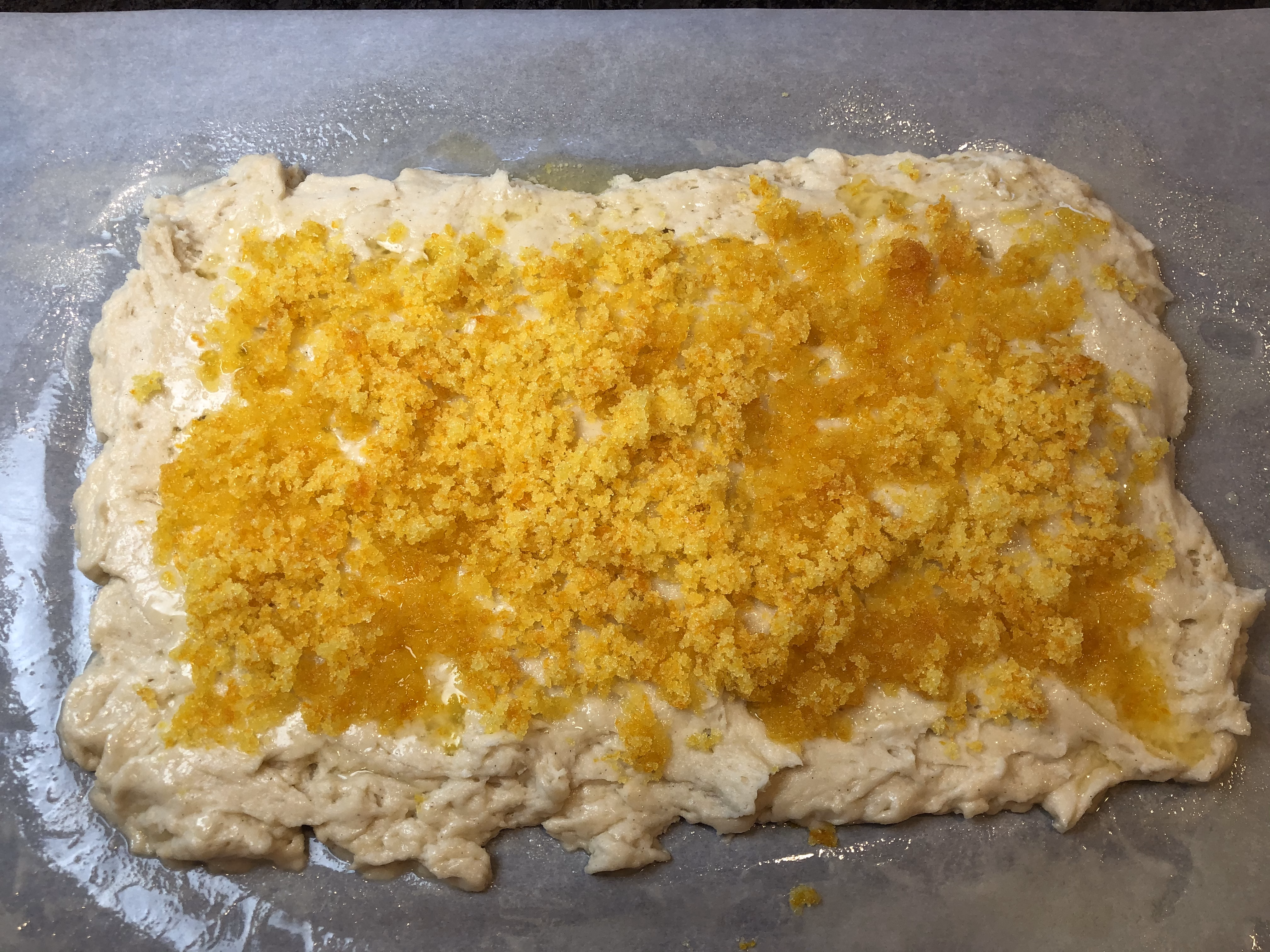 Once your dough has risen, spray a spoon or spatula with oil and transfer the dough from the bowl to a piece of well-greased parchment paper. Using oiled hands, gently spread the dough into a 10X13 rectangle. The dough will be about 1/2-inch thick once spread. Try not to press on the dough too hard or you'll release the air pockets. Brush the top of the dough with 1/4 cup of melted butter, leaving about 1/2 inch around the edges clear. For filling, mix orange zest and sugar and sprinkle the mixture over the butter, still leaving 1/2-inch open around the edges. Using the edge of the parchment paper, slowly roll the dough towards you. Continue to tuck and roll the dough until you reach the bottom, and you have a dough log.