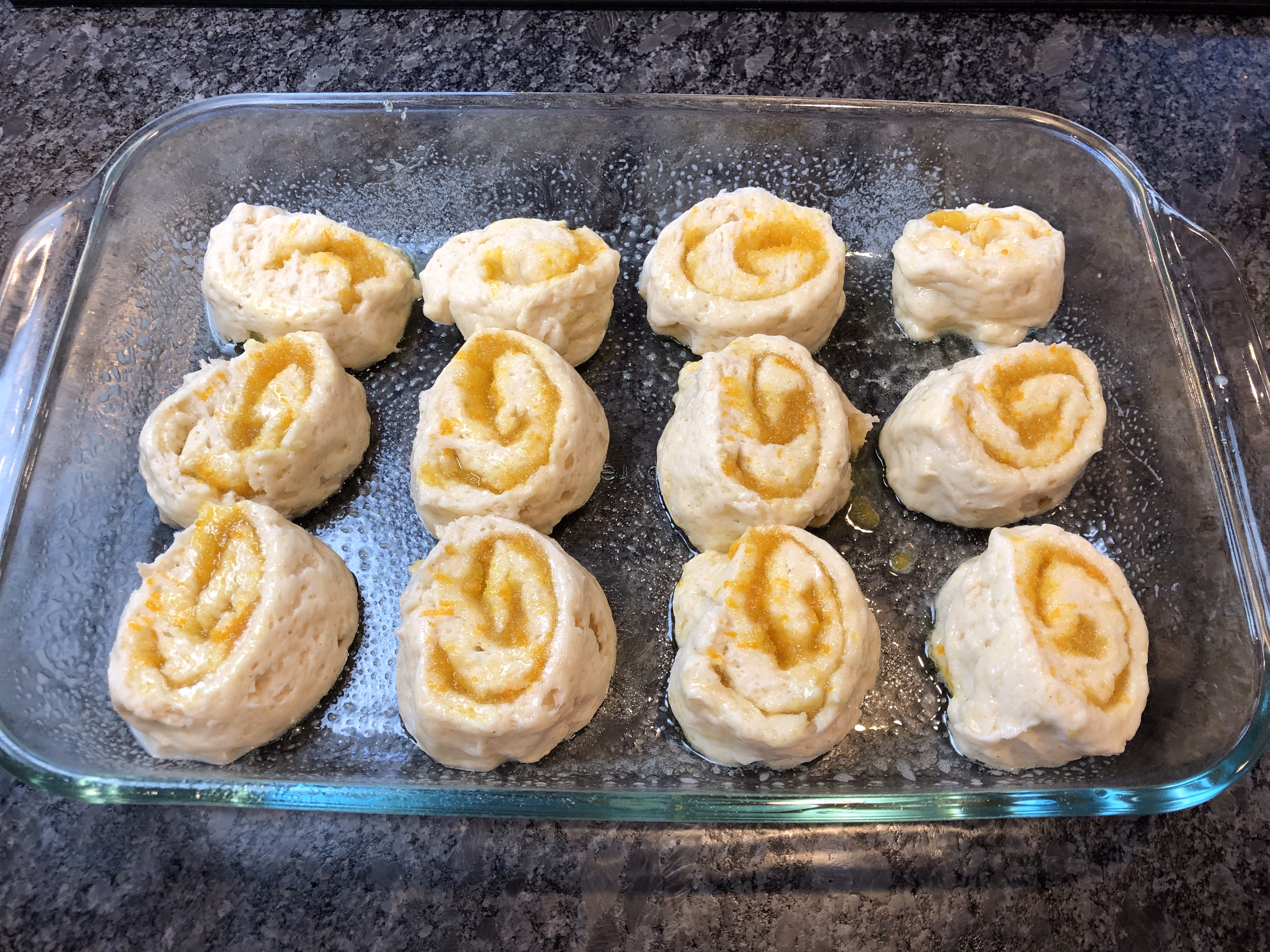 Carefully slice the dough into 12 equal pieces with a greased knife, then using a greased spatula, transfer each slice into a greased 9x13" baking dish.