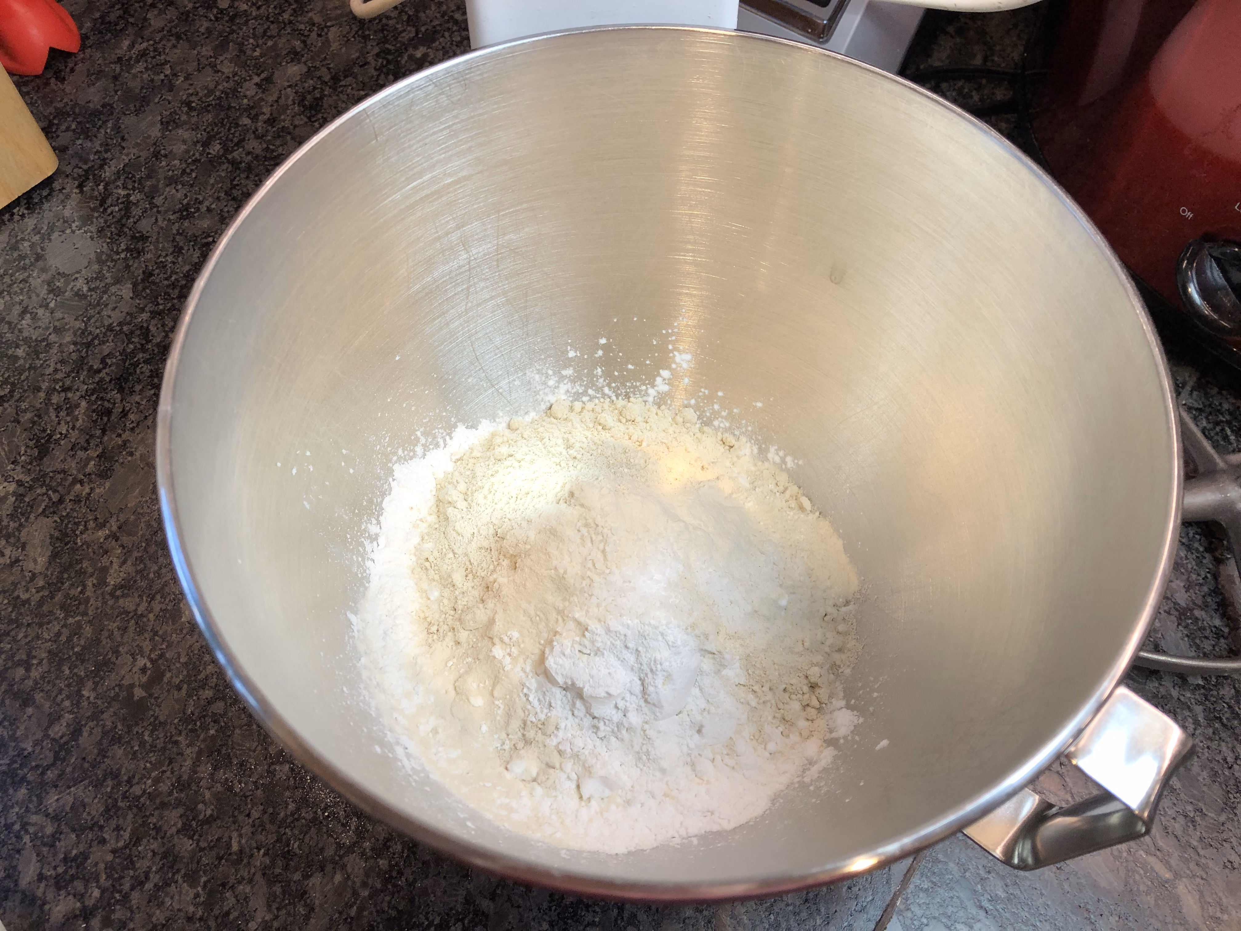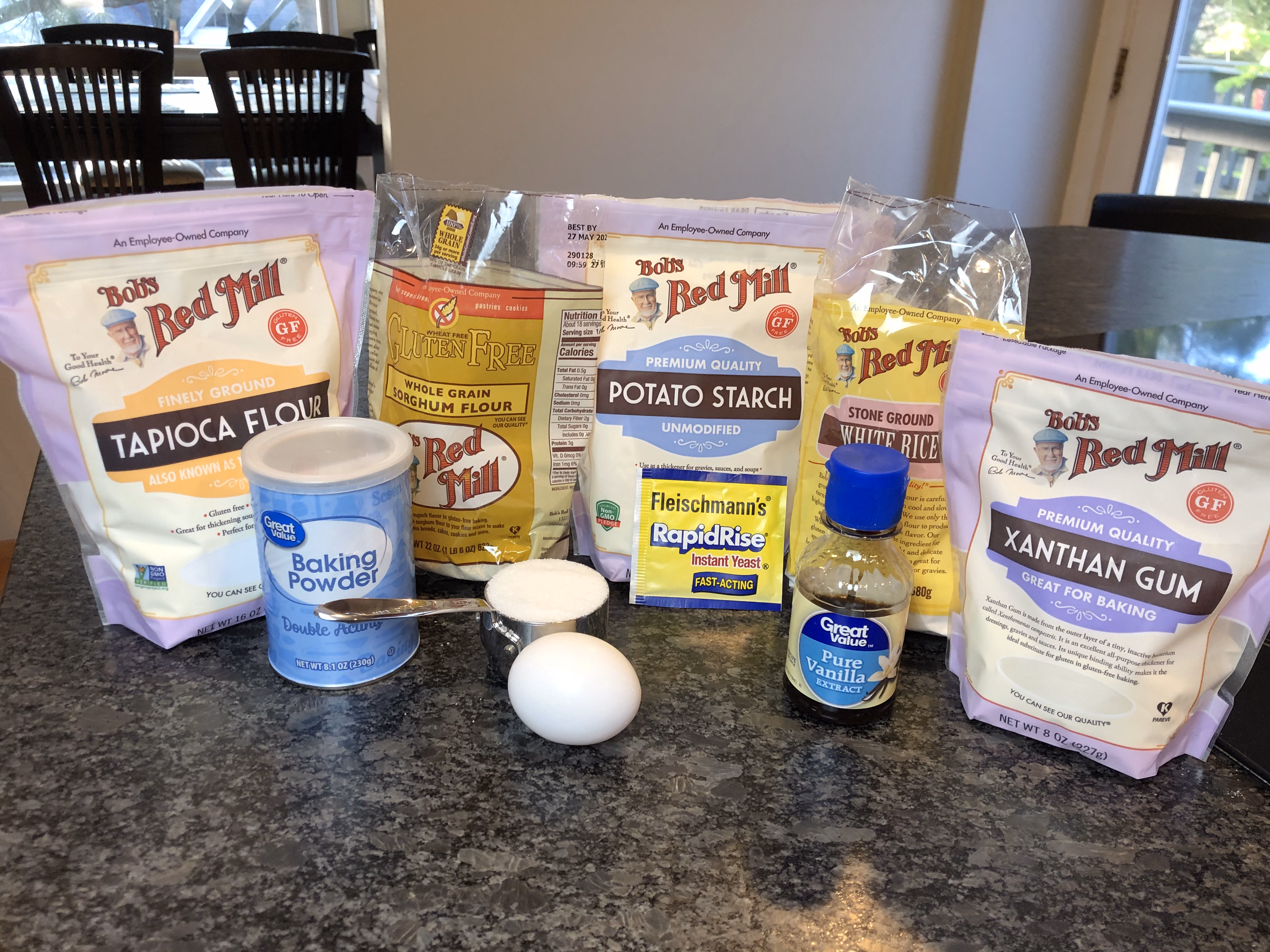 Gather your ingredients. You will need a good 1:1 baking flour (I used Bob's Red Mill 1:1 flour) or you can create your own flour mix like the option above. You will also need baking powder, instant yeast, sugar, an egg, and vanilla.