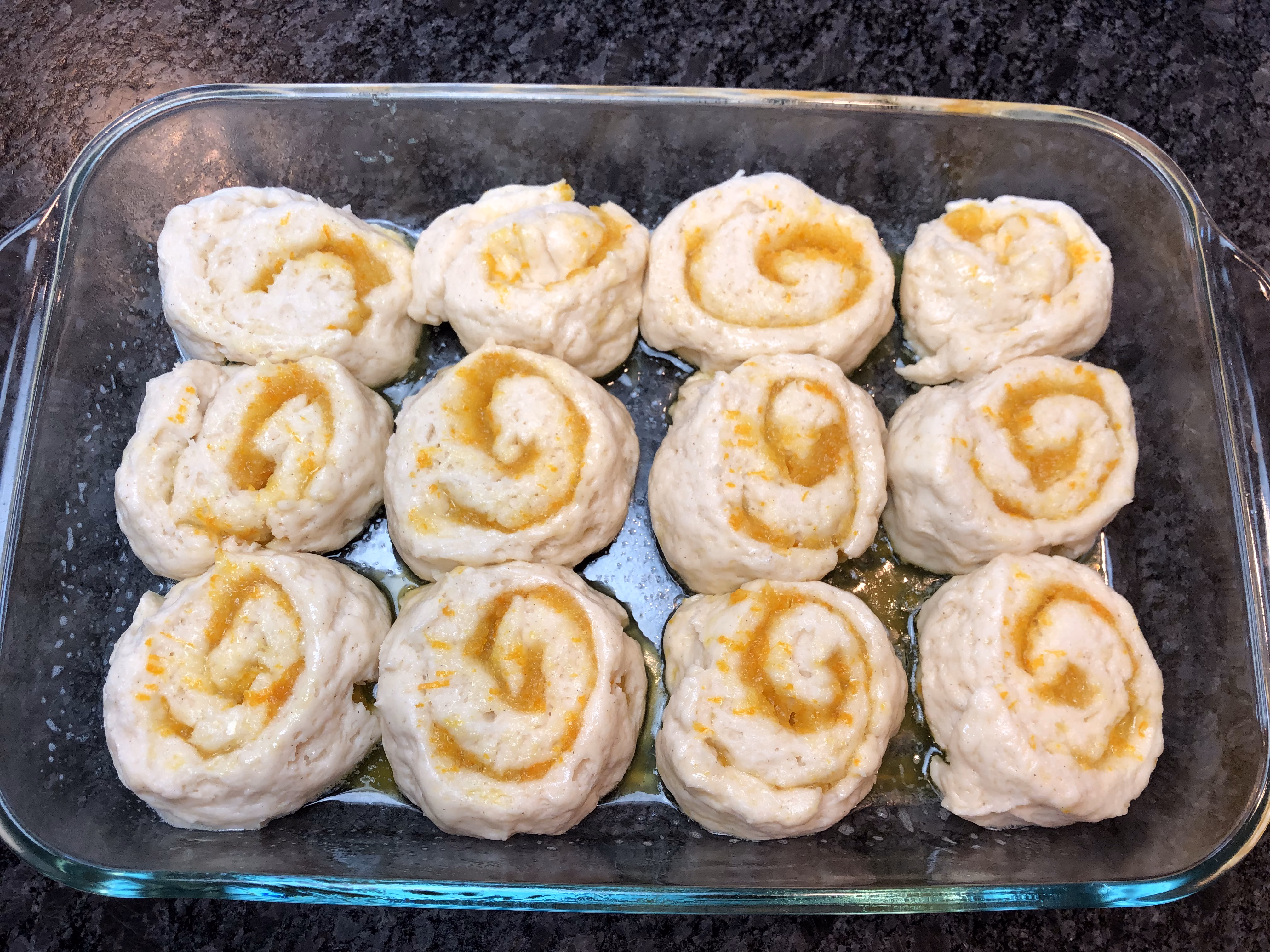 Using a knife sprayed with oil, slice the dough log in half, then quarters, and finally thirds until you have 12 even slices. Using your knife or your oiled spatula, transfer the orange roll slices to a greased 9X13" baking dish. Cover the pan with a light towel or plastic wrap and let rise for 30 minutes. Once the orange rolls have risen, preheat the oven to 350° F. Bake for 20-22 minutes, or until the cinnamon rolls start to brown and the center is cooked through. Cool for a few minutes, then frost with orange cream cheese frosting.