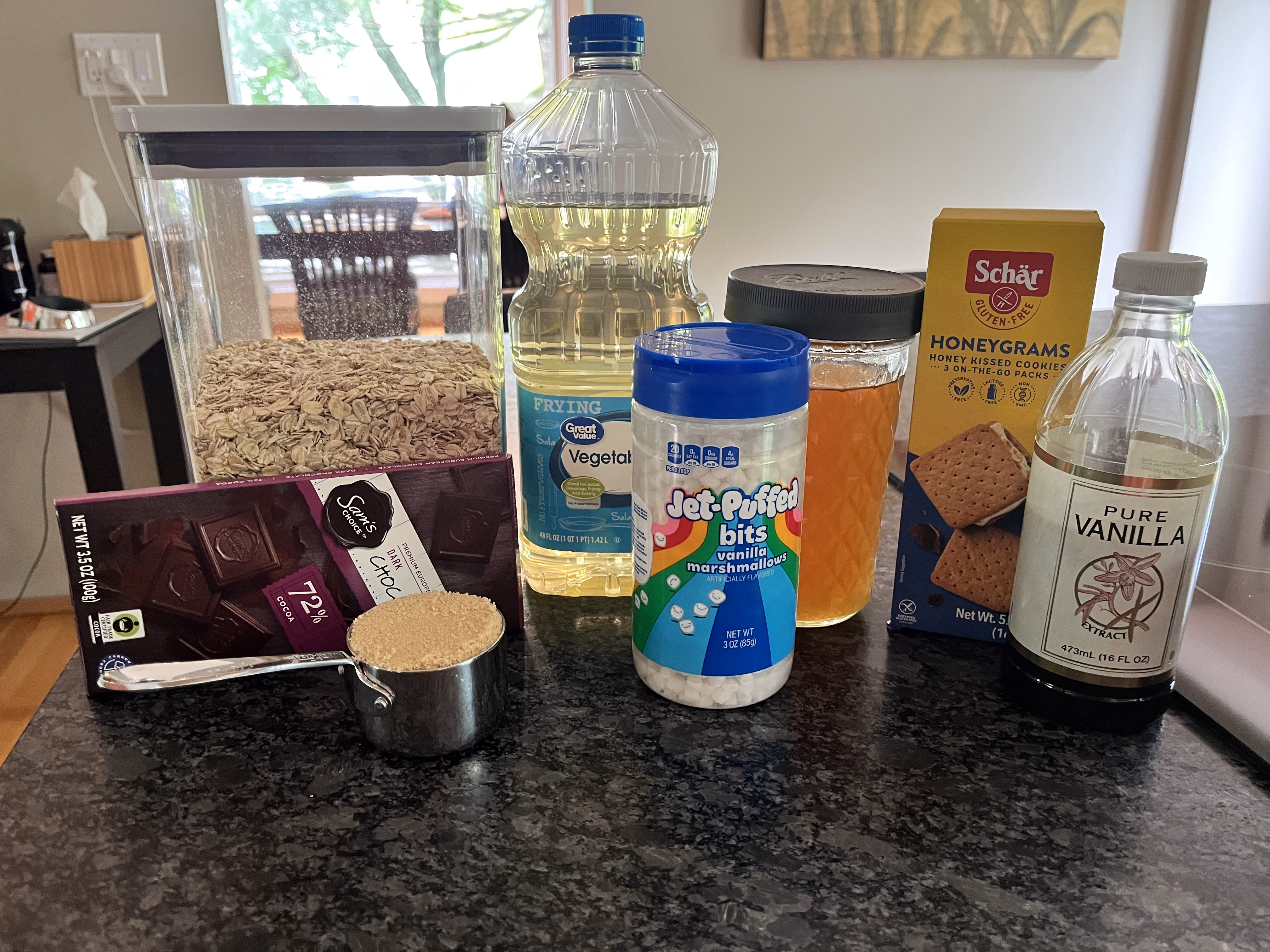 Gather your ingredients. You will need old fashioned oats, brown sugar, gluten free graham crackers (I used two packs of this box of Schar crackers), vegetable oil, honey, vanilla, marshmallow bits (I get them on Amazon), and a bar of dark chocolate.