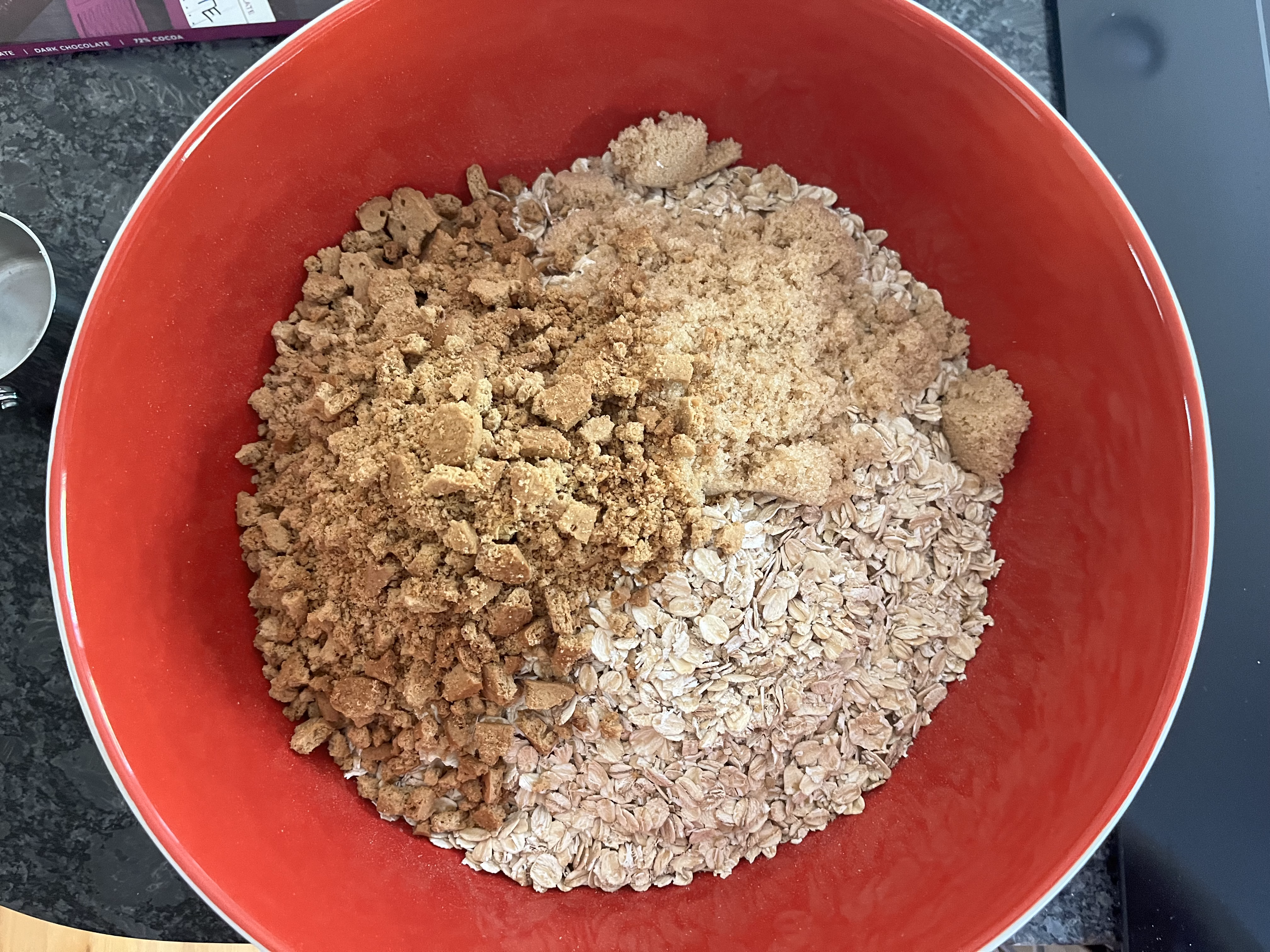 In a large mixing bowl, stir together the oats, brown sugar, and crushed graham crackers. Don't crush them to dust. You still want some chunks of graham cracker.