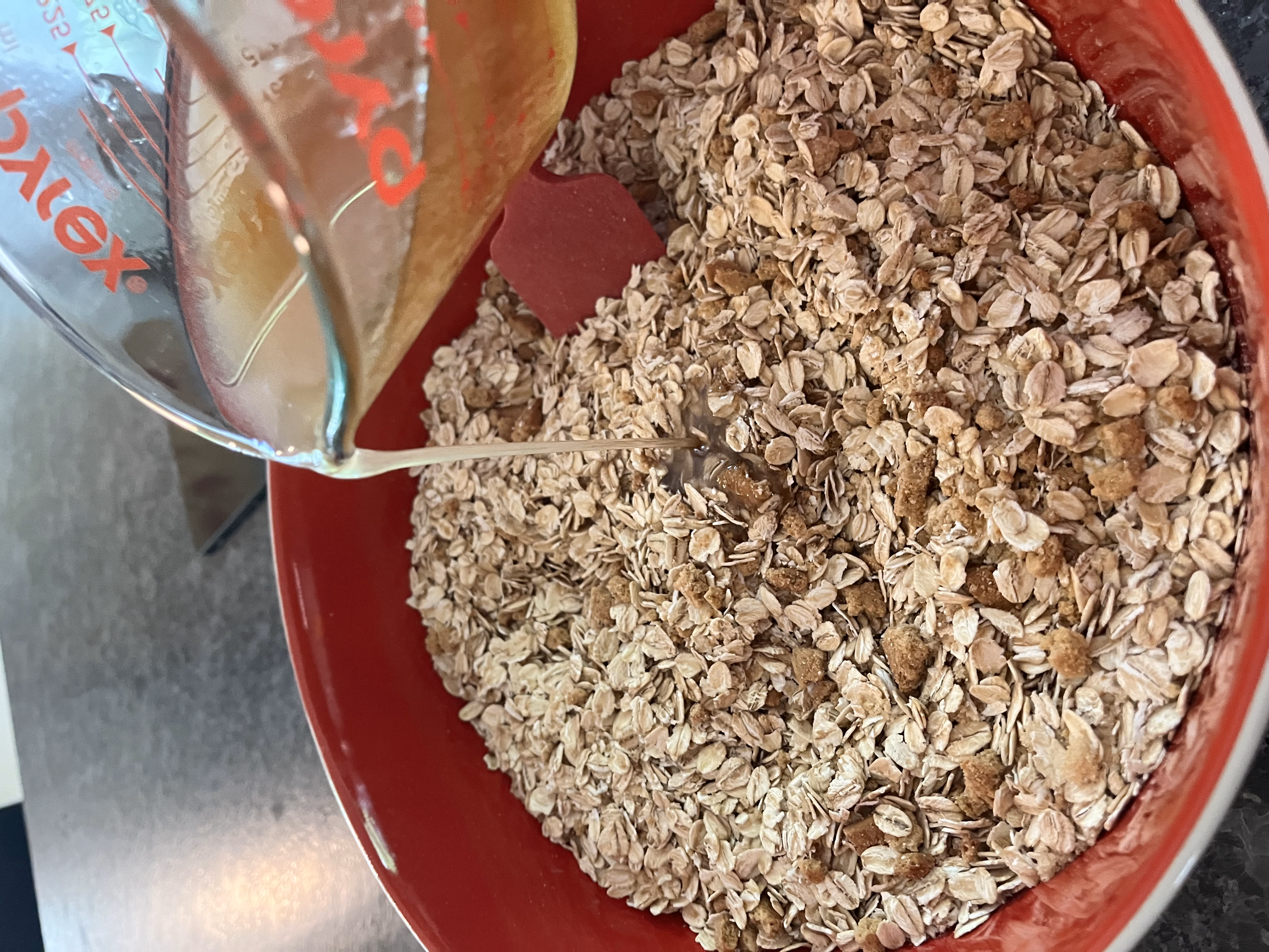 In a separate bowl, whisk together the oil, honey, and vanilla. Pour it over the oats and stir to coat.