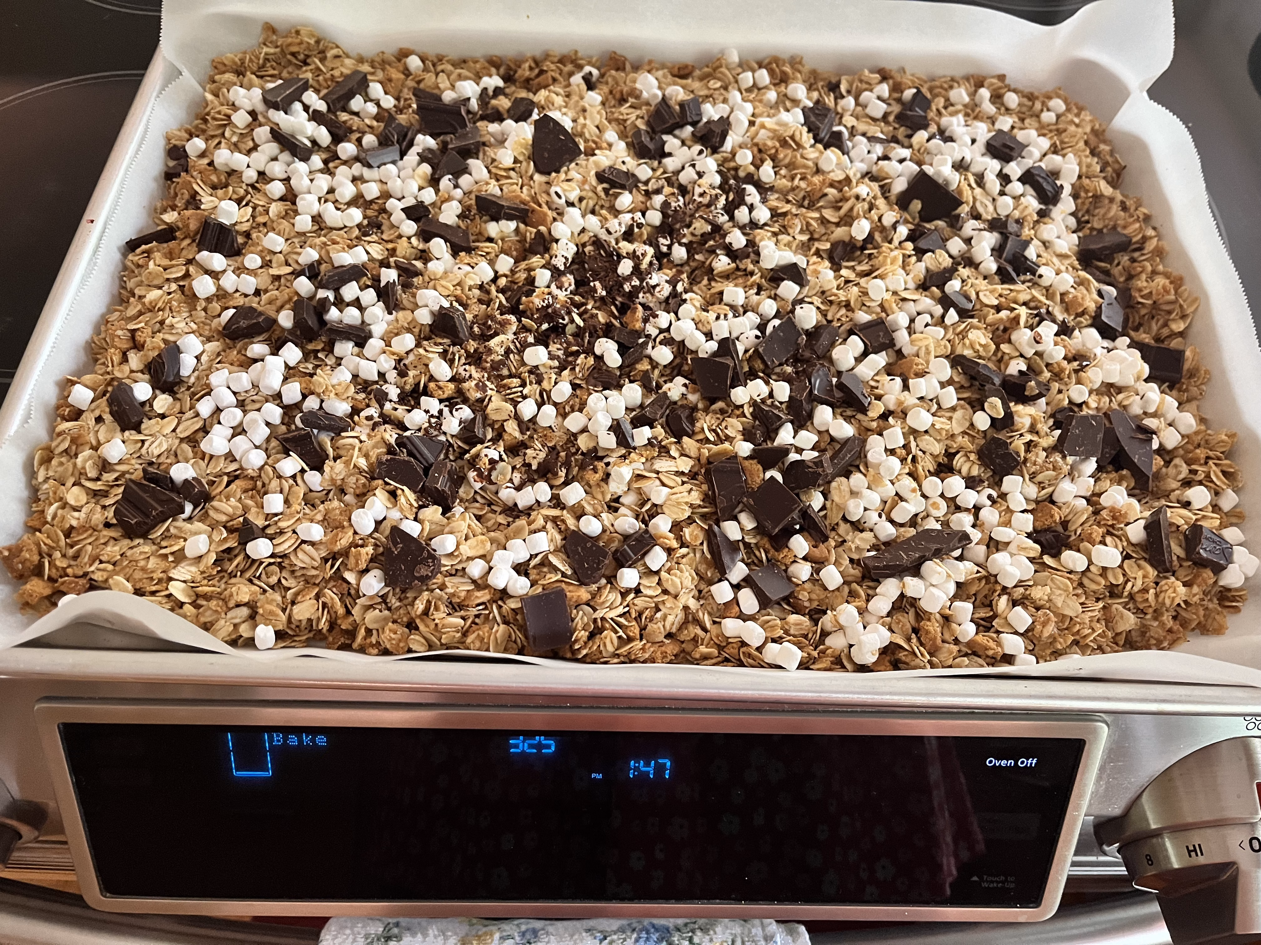 Remove from oven and top with marshmallow bits and chopped chocolate. Return to the oven for a few minutes to get the chocolate all melty so it sticks to the granola. If you'd rather, you could wait on the chocolate and stir in the chunks after it's completely cooled. You could also use mini chocolate chips.