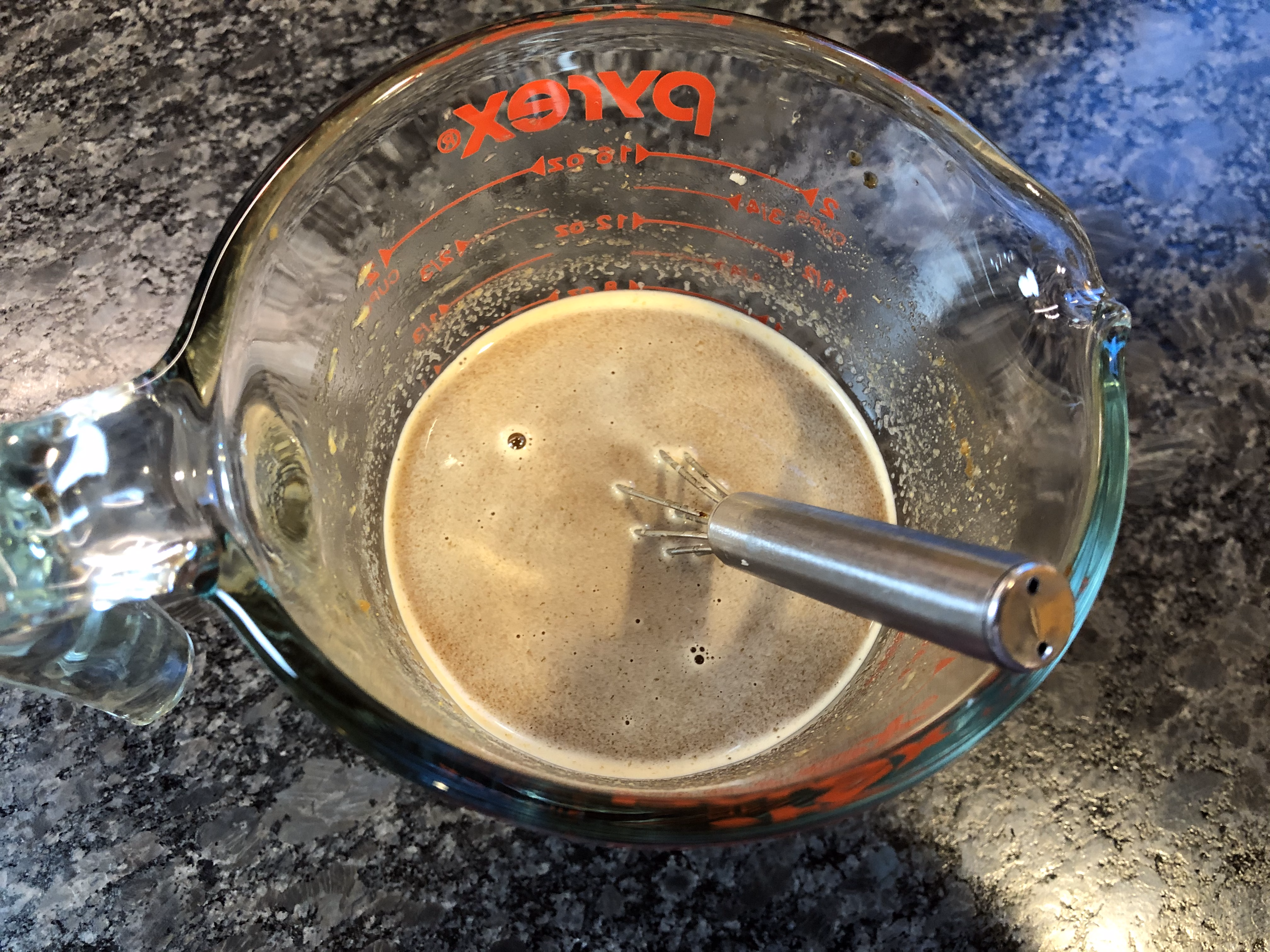 Meanwhile, in a glass measuring cup, combine 1/2 cup chicken broth, 3 tablespoons peanut butter, 1-2 teaspoon Sriracha sauce (I usually do just one teaspoon so it's just adding flavor without heat), 1 1/2 tablespoons honey, 3 tablespoons soy sauce (make sure it's gluten free), 1 1/2 teaspoons ground ginger, 3 cloves minced garlic (about 1 1/2 teaspoons), and 1 tablespoon cornstarch. Microwave on high for 2 minutes in 30 second intervals, whisking in between. You want a nice smooth sauce.