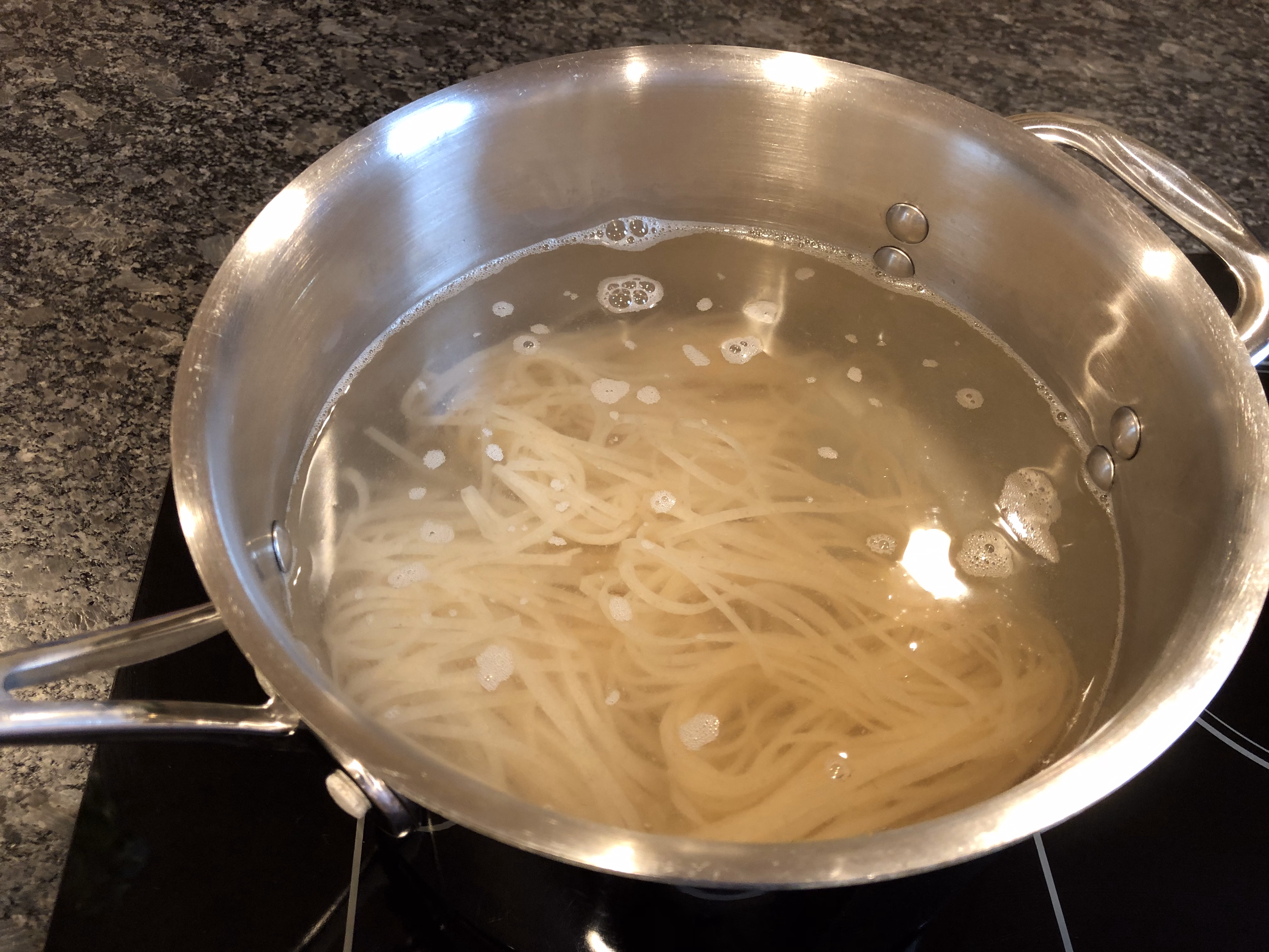 First get a large pot of water boiling and cook noodles according to package directions. These Thai Kitchen noodles and super good and easy. Boil the water, then remove from heat, add the noodles, and soak for 5 minutes. Drain.