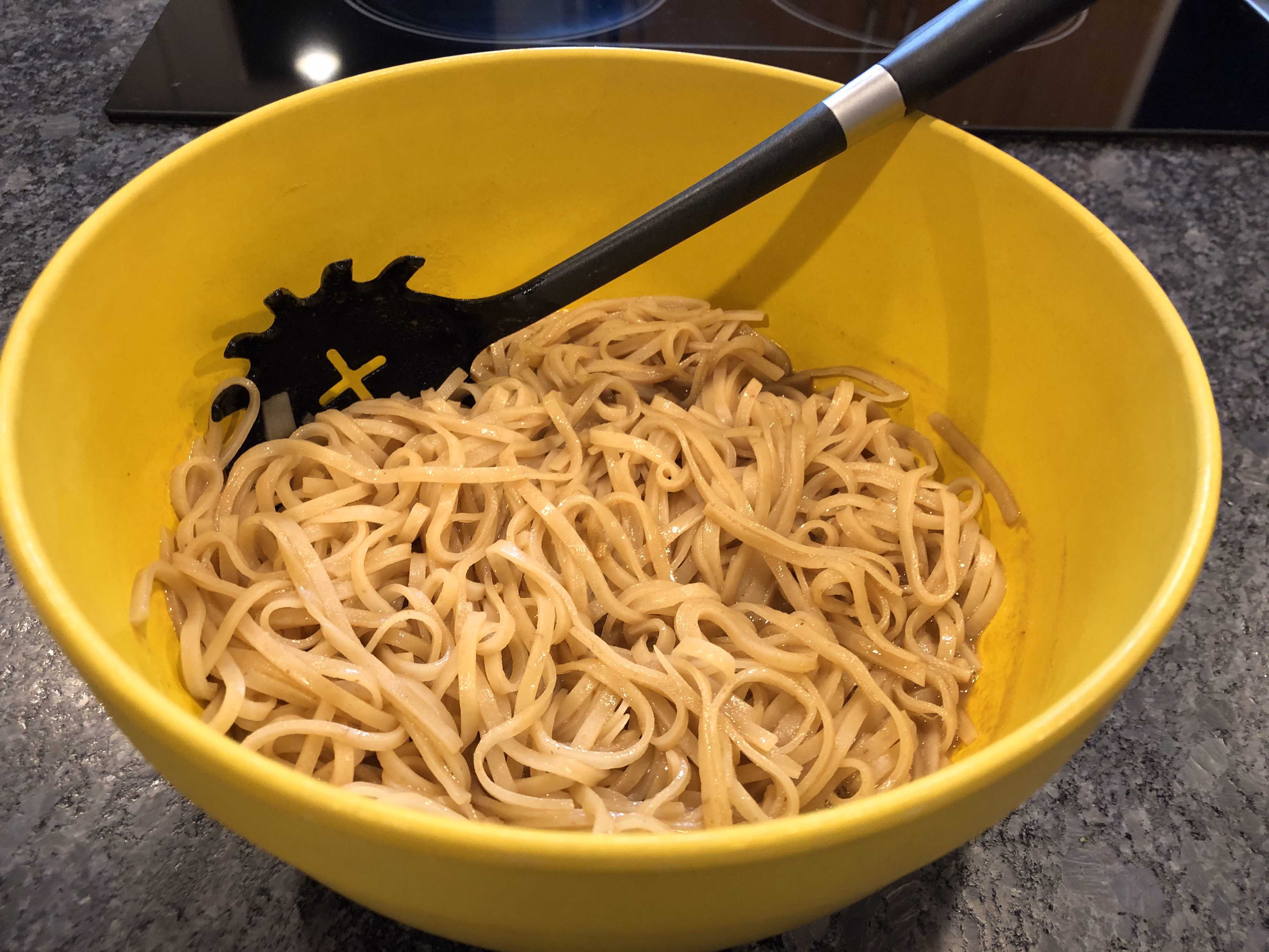 In a large bowl, combine the drained noodles with the peanut sauce and toss.