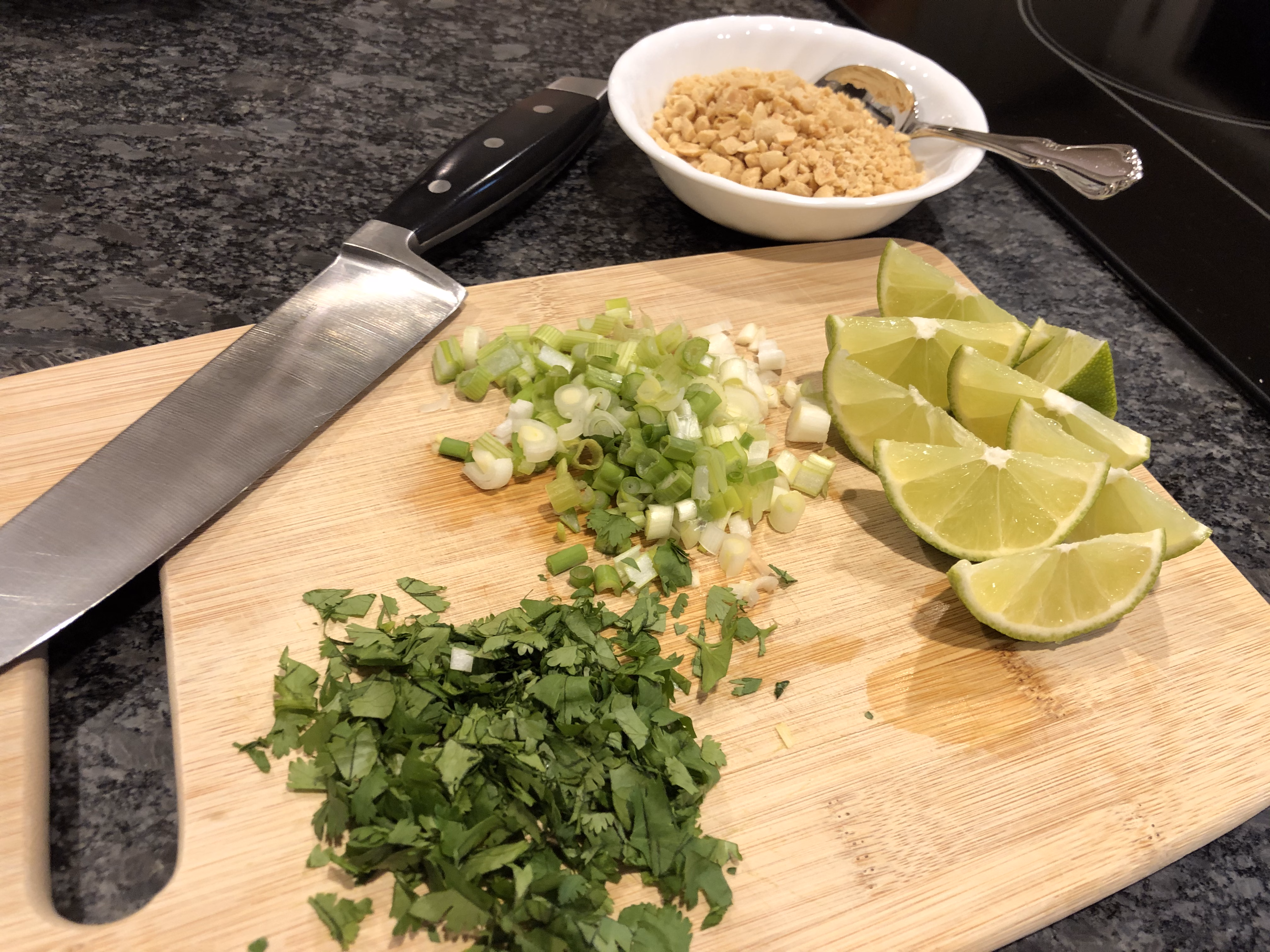 Prepare your toppings. Chop some green onions and cilantro. Slice a lime into wedges. Chop up some peanuts. Once your toppings are ready, it's time to put it on the table.