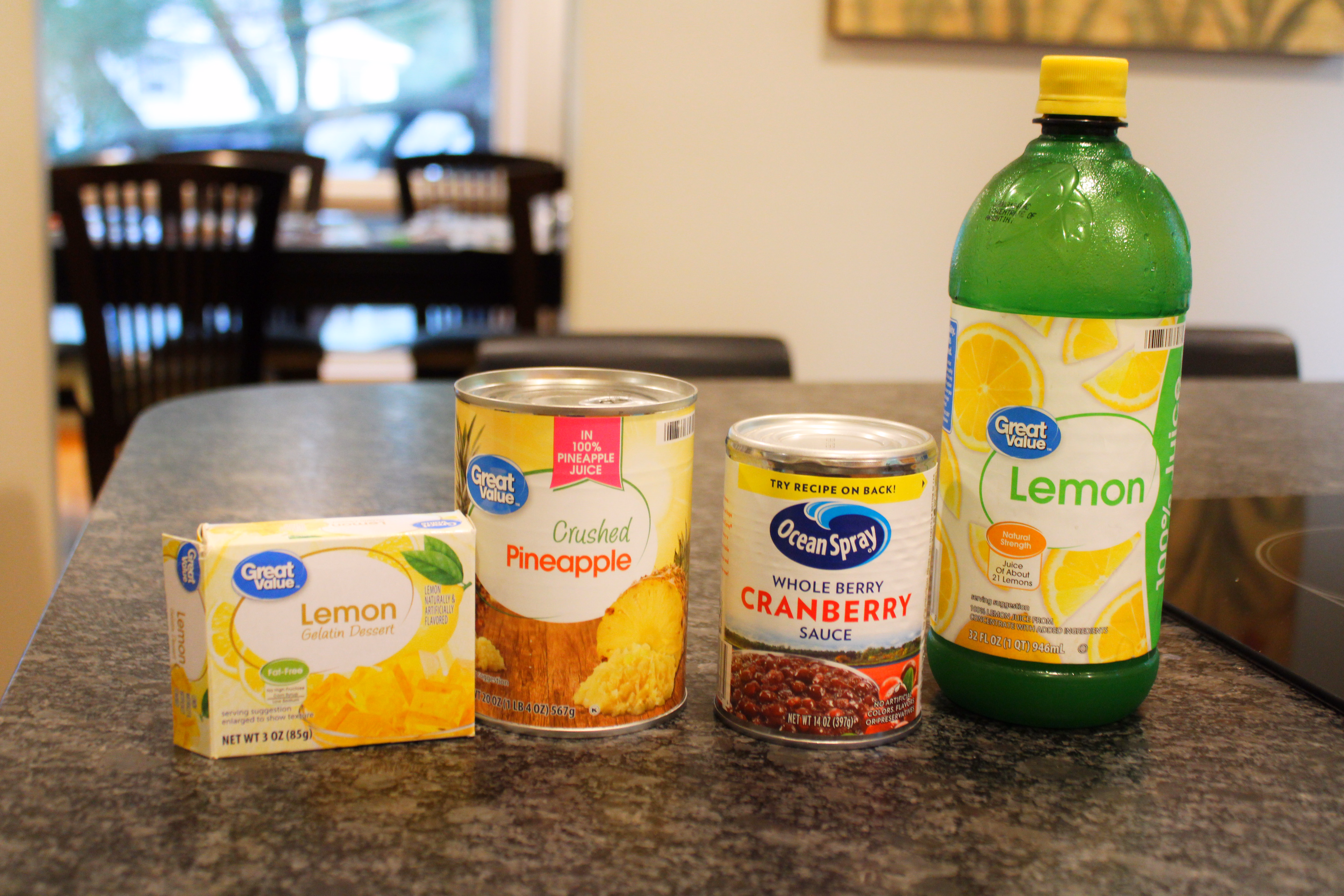 The first step is dissolving the gelatin in 1 1/2 cups boiling water, then stirring in the lemon juice. Let that refrigerate until starting to set, then stir in 1 cup crushed pineapple (drained well) and 1 cup whole berry cranberry sauce. You will love the colors! Let that set up completely. It will take 4 hours or overnight to set well. I make it the night before I need it. The tartness of the cranberries goes so well with the sweetness of the pineapple and lemon. We will make this again for sure!