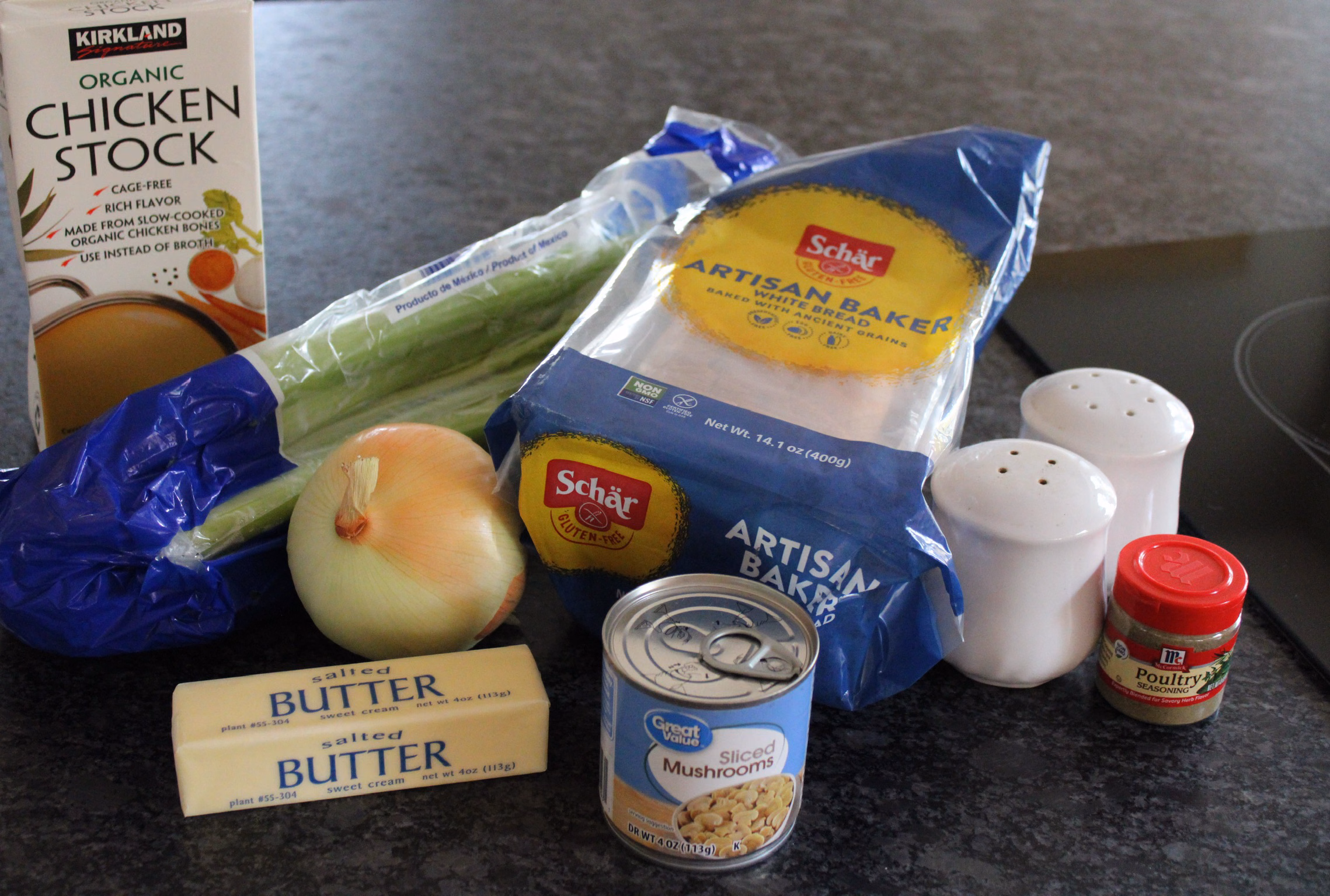 Gather your ingredients. You will need a good sized loaf of gluten free bread. I use a 14 oz. loaf of Schar Artisan White Bread and it acts just like regular bread in this recipe.... you can't even tell it's gluten free bread! You will also need celery, an onion, a can of sliced mushrooms (which can be omitted if there is a strong loathing haha), poultry seasoning, salt and pepper, a stick of butter, and chicken broth.