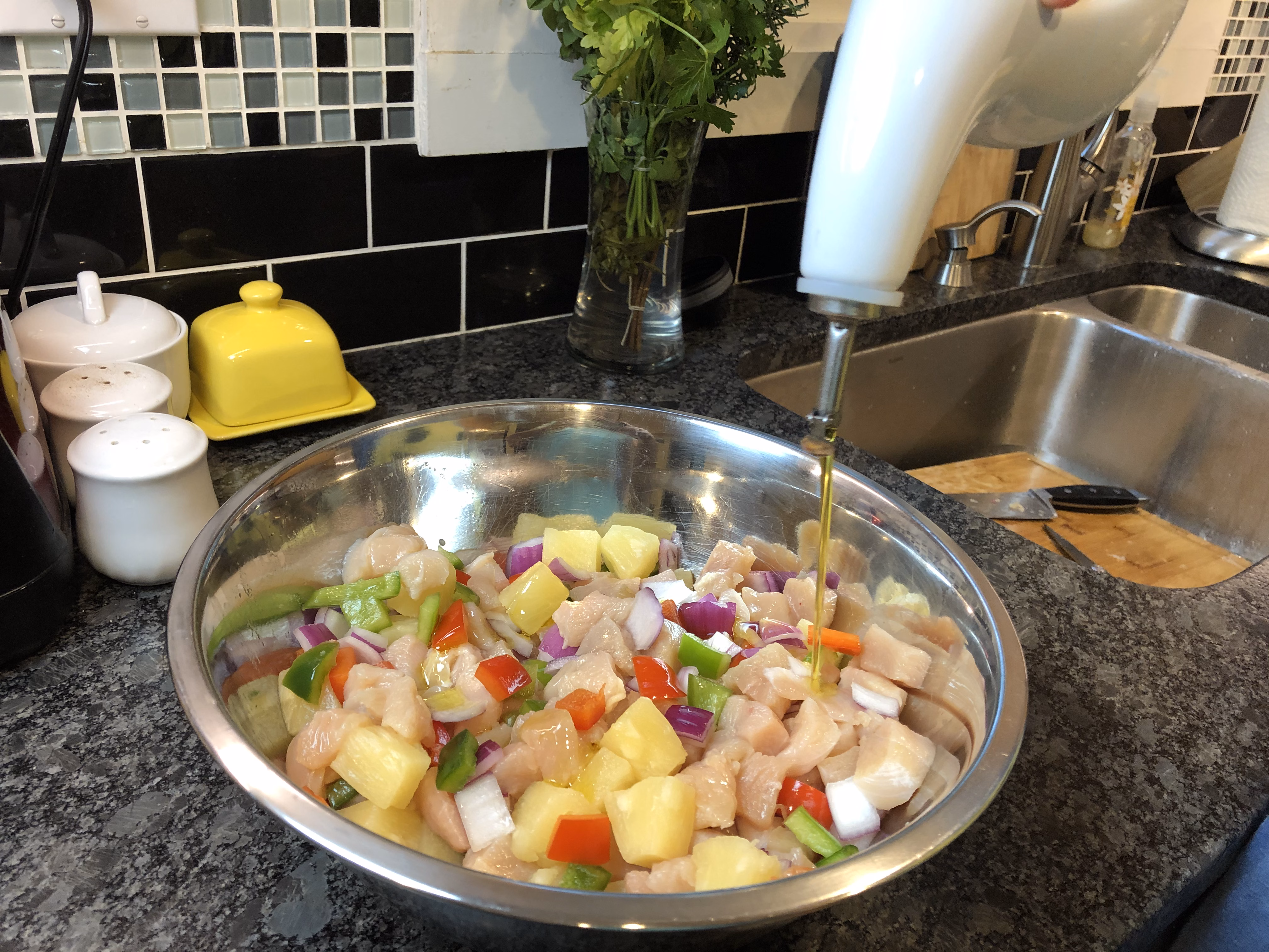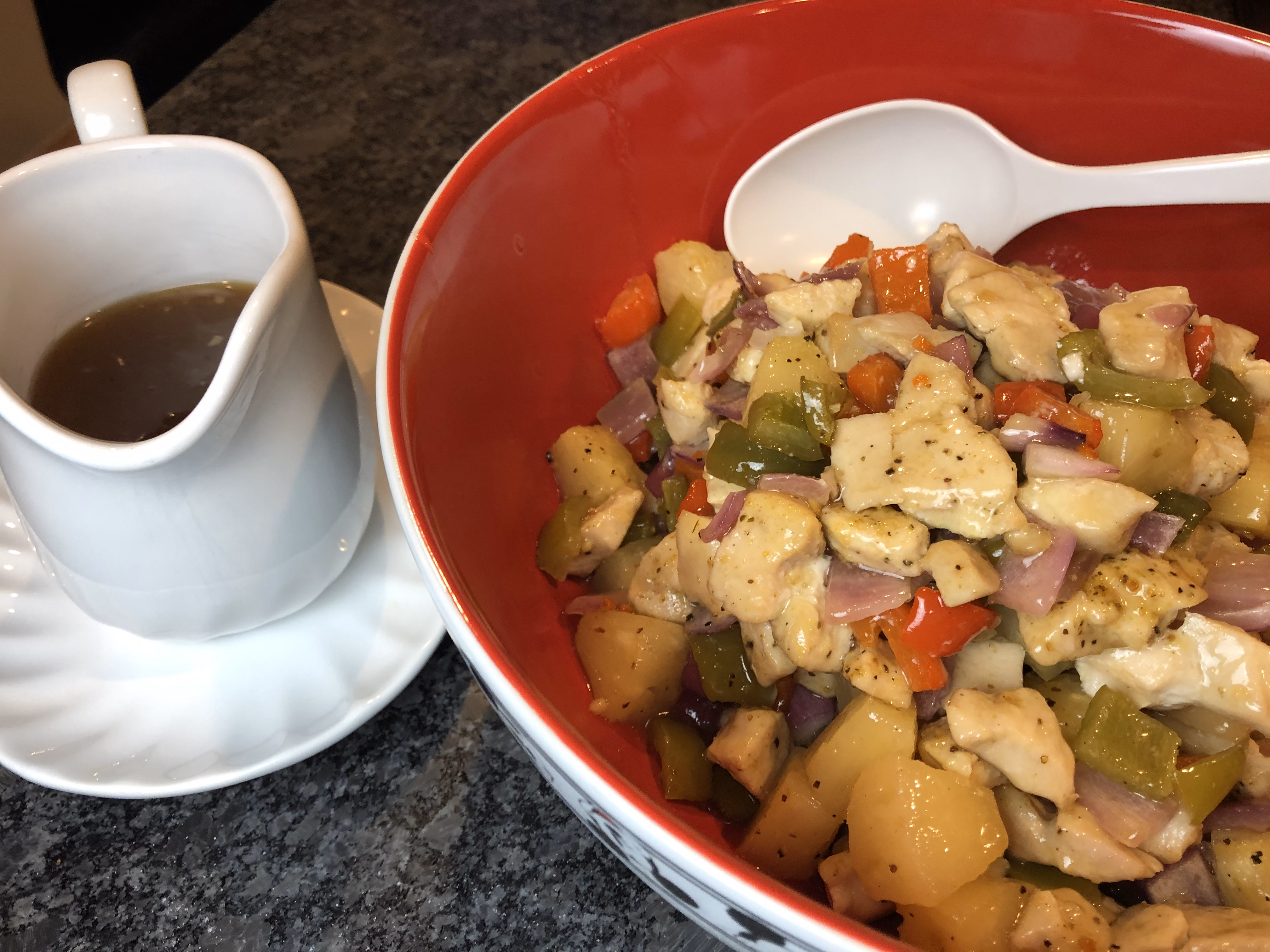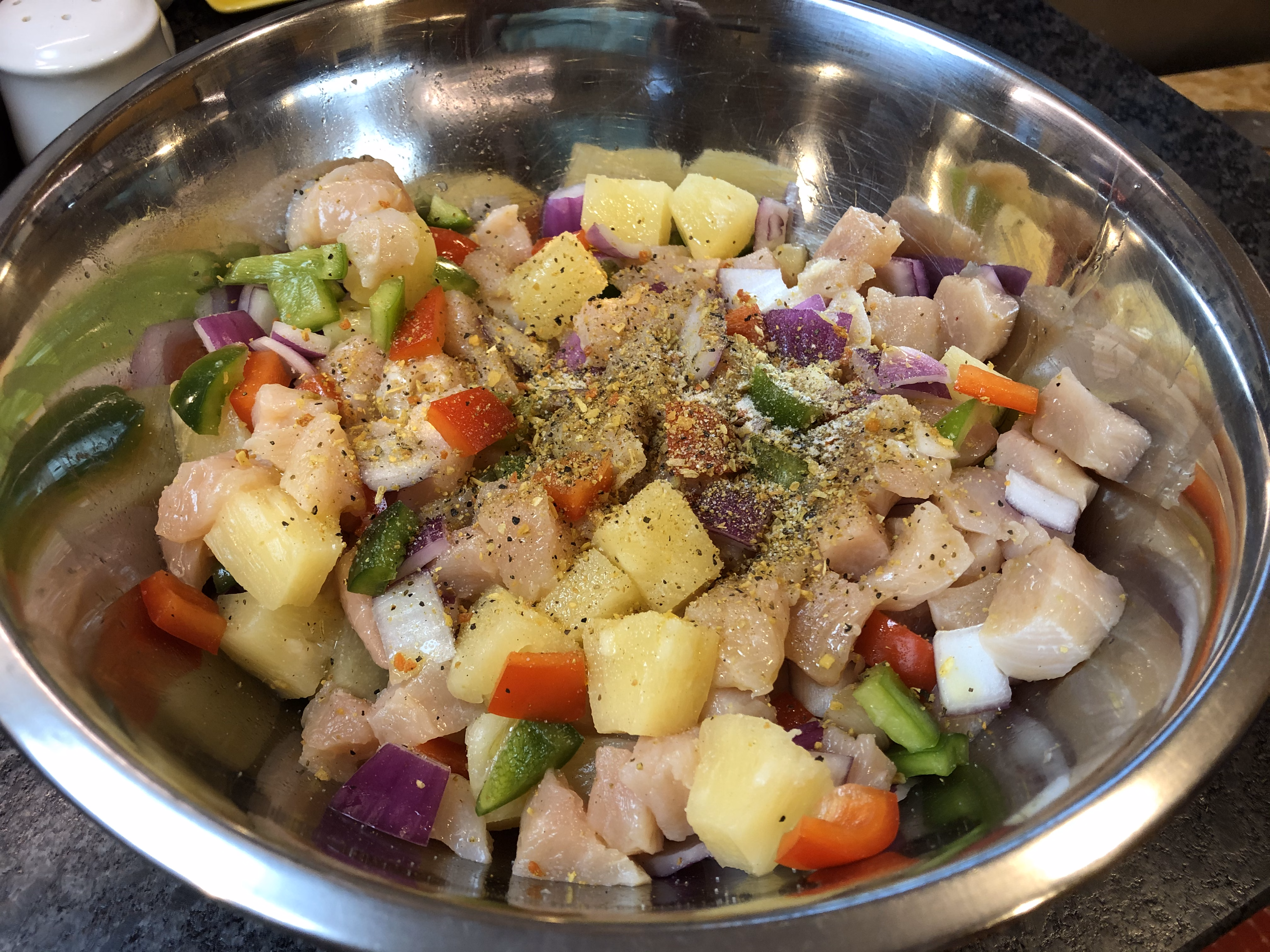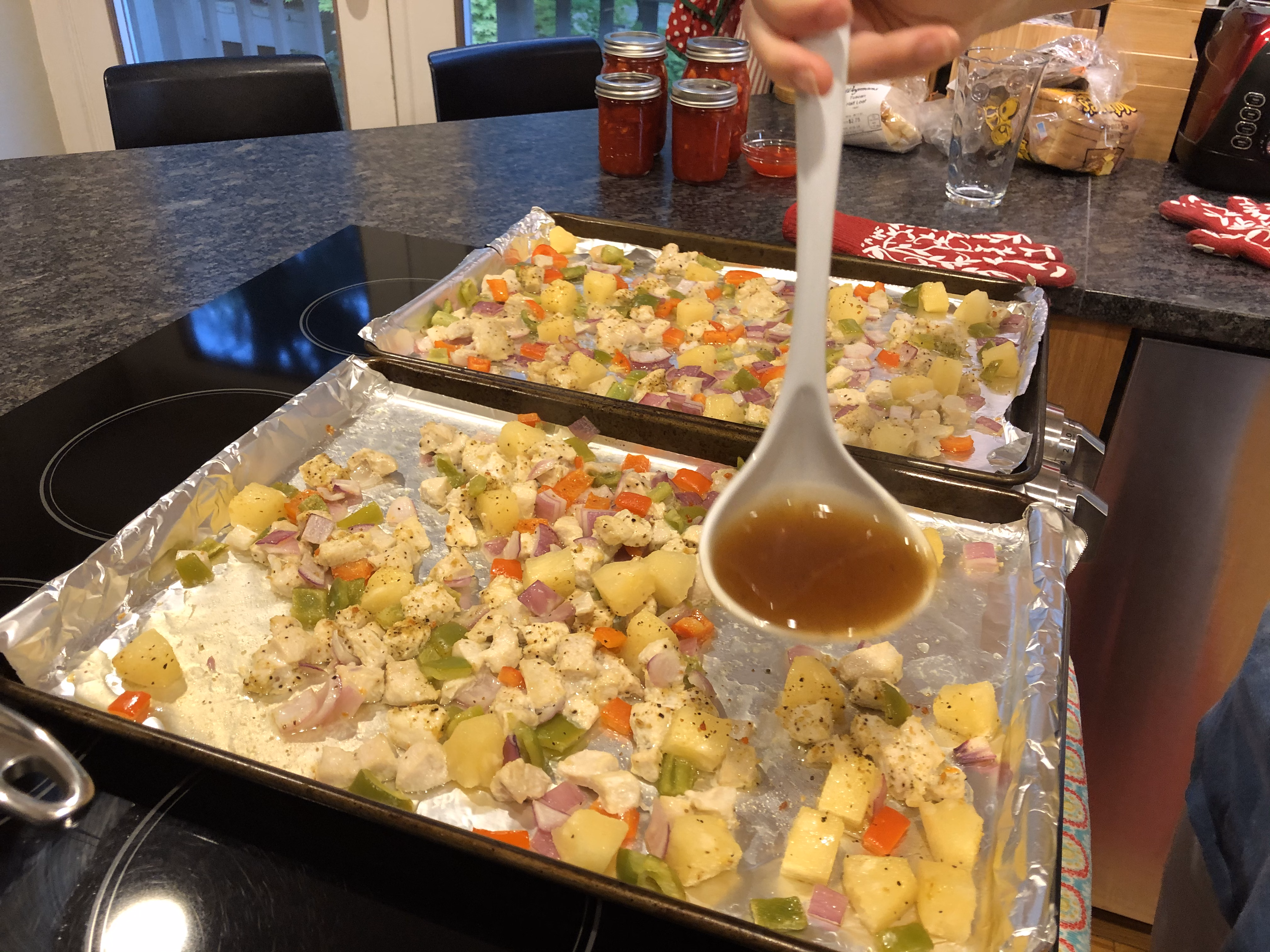 Drain pineapple chunks, reserving the juice. Put chicken and vegetables in a large bowl. Drizzle with olive oil and sprinkle with garlic salt and lemon pepper. Spread out onto 2 sheet pans covered with aluminum foil. Bake for 20 minutes.