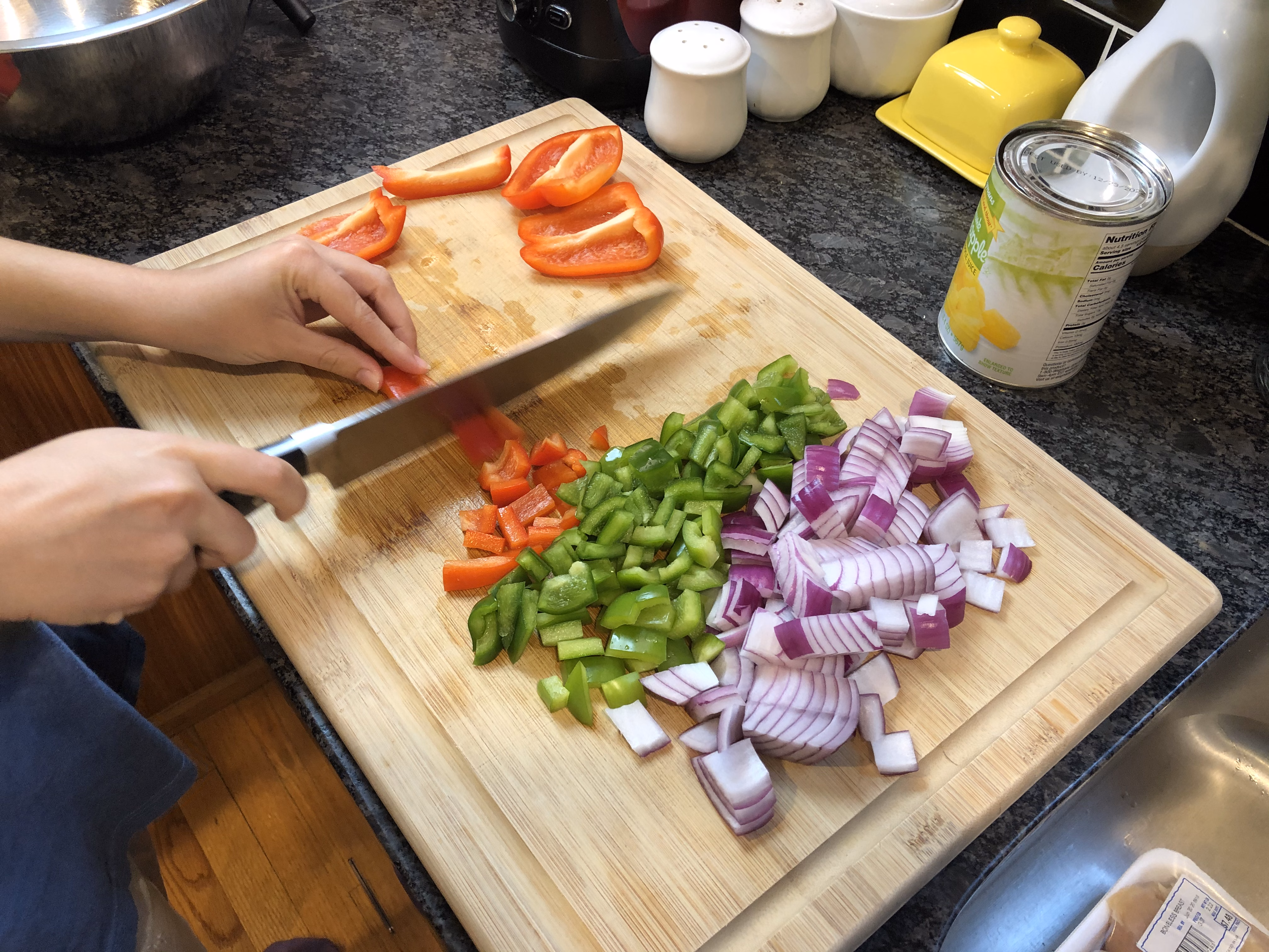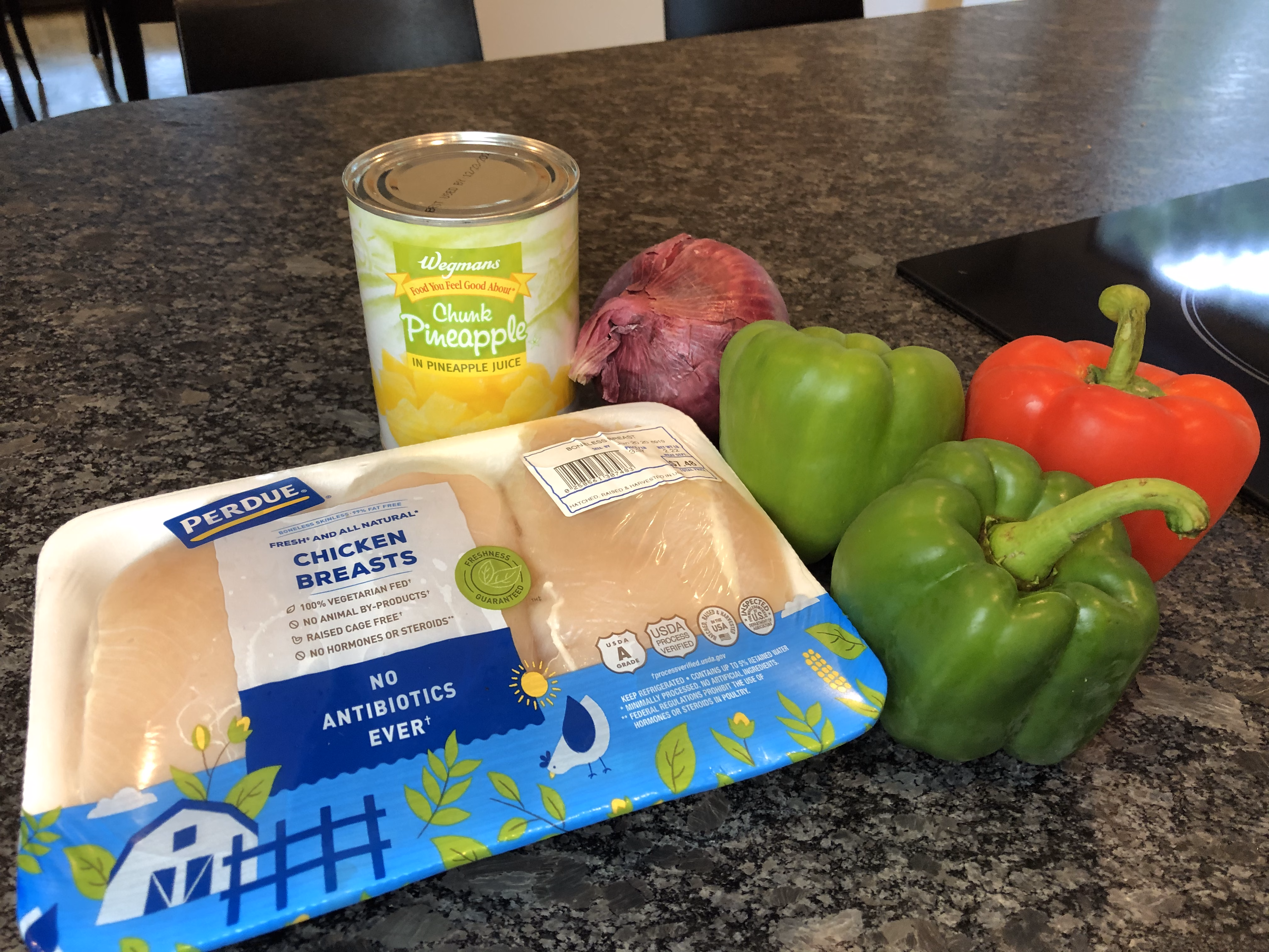 Gather your ingredients. First, you will need 3 chicken breasts, 2 green peppers, 1 red pepper, 1 red onion, and 1 (20-oz. ) can pineapple chunks.