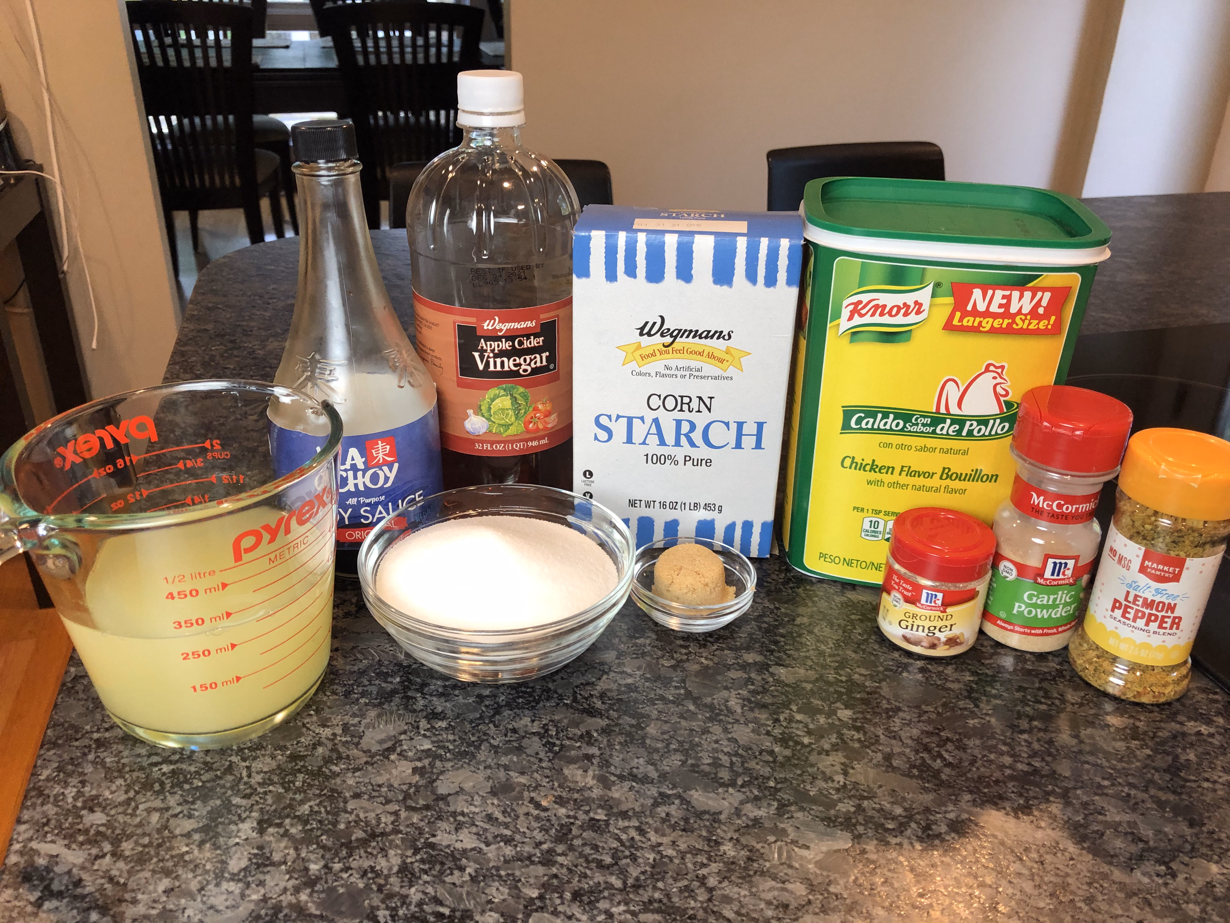 While the chicken is baking, gather your sauce ingredients. You will need reserved pineapple juice + water to equal 1 cup, 1/4 cup water, apple cider vinegar, soy sauce, chicken bouillon granules. sugar, brown sugar, cornstarch, garlic powder, ginger, and lemon peper.